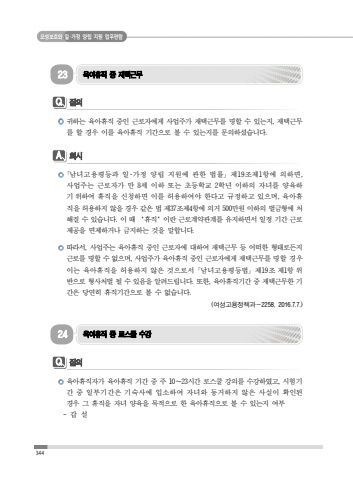 344%ubaa8%uc131%ubcf4%ud638%uc640 %uc77c%uff65%uac00%uc815 %uc591%ub9bd %uc9c0%uc6d0 %uc5c5%ubb34%ud3b8%ub78c23%uc721%uc544%ud734%uc9c1 %uc911 %uc7ac%ud0dd%uadfc%ubb34Q%uc9c8%uc758%uadc0%ud558%ub294 %uc721%uc544%ud734%uc9c1 %uc911%uc778 %uadfc%ub85c%uc790%uc5d0%uac8c %uc0ac%uc5c5%uc8fc%uac00 %uc7ac%ud0dd%uadfc%ubb34%ub97c %uba85%ud560 %uc218 %uc788%ub294%uc9c0, %uc7ac%ud0dd%uadfc%ubb34%ub97c %ud560 %uacbd%uc6b0 %uc774%ub97c %uc721%uc544%ud734%uc9c1 %uae30%uac04%uc73c%ub85c %ubcfc %uc218 %uc788%ub294%uc9c0%ub97c %ubb38%uc758%ud558%uc168%uc2b5%ub2c8%ub2e4. A%ud68c%uc2dc%uff62%ub0a8%ub140%uace0%uc6a9%ud3c9%ub4f1%uacfc %uc77c%uff65%uac00%uc815 %uc591%ub9bd %uc9c0%uc6d0%uc5d0 %uad00%ud55c %ubc95%ub960%uff63 %uc81c19%uc870%uc81c1%ud56d%uc5d0 %uc758%ud558%uba74, %uc0ac%uc5c5%uc8fc%ub294 %uadfc%ub85c%uc790%uac00 %ub9cc 8%uc138 %uc774%ud558 %ub610%ub294 %ucd08%ub4f1%ud559%uad50 2%ud559%ub144 %uc774%ud558%uc758 %uc790%ub140%ub97c %uc591%uc721%ud558%uae30 %uc704%ud558%uc5ec %ud734%uc9c1%uc744 %uc2e0%uccad%ud558%uba74 %uc774%ub97c %ud5c8%uc6a9%ud558%uc5ec%uc57c %ud55c%ub2e4%uace0 %uaddc%uc815%ud558%uace0 %uc788%uc73c%uba70, %uc721%uc544%ud734%uc9c1%uc744 %ud5c8%uc6a9%ud558%uc9c0 %uc54a%uc744 %uacbd%uc6b0 %uac19%uc740 %ubc95 %uc81c37%uc870%uc81c4%ud56d%uc5d0 %uc758%uac70 500%ub9cc%uc6d0 %uc774%ud558%uc758 %ubc8c%uae08%ud615%uc5d0 %ucc98%ud574%uc9c8 %uc218 %uc788%uc2b5%ub2c8%ub2e4. %uc774 %ub54c %u2018%ud734%uc9c1%u2019%uc774%ub780 %uadfc%ub85c%uacc4%uc57d%uad00%uacc4%ub97c %uc720%uc9c0%ud558%uba74%uc11c %uc77c%uc815 %uae30%uac04 %uadfc%ub85c%uc81c%uacf5%uc744 %uba74%uc81c%ud558%uac70%ub098 %uae08%uc9c0%ud558%ub294 %uac83%uc744 %ub9d0%ud569%ub2c8%ub2e4. %ub530%ub77c%uc11c, %uc0ac%uc5c5%uc8fc%ub294 %uc721%uc544%ud734%uc9c1 %uc911%uc778 %uadfc%ub85c%uc790%uc5d0 %ub300%ud558%uc5ec %uc7ac%ud0dd%uadfc%ubb34 %ub4f1 %uc5b4%ub5a0%ud55c %ud615%ud0dc%ub85c%ub4e0%uc9c0 %uadfc%ub85c%ub97c %uba85%ud560 %uc218 %uc5c6%uc73c%uba70, %uc0ac%uc5c5%uc8fc%uac00 %uc721%uc544%ud734%uc9c1 %uc911%uc778 %uadfc%ub85c%uc790%uc5d0%uac8c %uc7ac%ud0dd%uadfc%ubb34%ub97c %uba85%ud560 %uacbd%uc6b0 %uc774%ub294 %uc721%uc544%ud734%uc9c1%uc744 %ud5c8%uc6a9%ud558%uc9c0 %uc54a%uc740 %uac83%uc73c%ub85c%uc11c %uff62%ub0a8%ub140%uace0%uc6a9%ud3c9%ub4f1%ubc95%uff63 %uc81c19%uc870 %uc81c1%ud56d %uc704%ubc18%uc73c%ub85c %ud615%uc0ac%ucc98%ubc8c %ub420 %uc218 %uc788%uc74c%uc744 %uc54c%ub824%ub4dc%ub9bd%ub2c8%ub2e4. %ub610%ud55c, %uc721%uc544%ud734%uc9c1%uae30%uac04 %uc911 %uc7ac%ud0dd%uadfc%ubb34%ud55c %uae30%uac04%uc740 %ub2f9%uc5f0%ud788 %ud734%uc9c1%uae30%uac04%uc73c%ub85c %ubcfc %uc218 %uc5c6%uc2b5%ub2c8%ub2e4.(%uc5ec%uc131%uace0%uc6a9%uc815%ucc45%uacfc%uff0d2258, 2016.7.7.)24%uc721%uc544%ud734%uc9c1 %uc911 %ub85c%uc2a4%ucfe8 %uc218%uac15Q%uc9c8%uc758%uc721%uc544%ud734%uc9c1%uc790%uac00 %uc721%uc544%ud734%uc9c1 %uae30%uac04 %uc911 %uc8fc 10%u223c23%uc2dc%uac04 %ub85c%uc2a4%ucfe8 %uac15%uc758%ub97c %uc218%uac15%ud558%uc600%uace0, %uc2dc%ud5d8%uae30%uac04 %uc911 %uc77c%ubd80%uae30%uac04%uc740 %uae30%uc219%uc0ac%uc5d0 %uc785%uc18c%ud558%uc5ec %uc790%ub140%uc640 %ub3d9%uac70%ud558%uc9c0 %uc54a%uc740 %uc0ac%uc2e4%uc774 %ud655%uc778%ub41c %uacbd%uc6b0 %uadf8 %ud734%uc9c1%uc744 %uc790%ub140 %uc591%uc721%uc744 %ubaa9%uc801%uc73c%ub85c %ud55c %uc721%uc544%ud734%uc9c1%uc73c%ub85c %ubcfc %uc218 %uc788%ub294%uc9c0 %uc5ec%ubd80-%uac11 %uc124