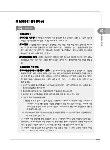 47%ubaa8%uc131%ubcf4%ud638%uc81c%ub3c402(5) %ucd9c%uc0b0%uc804%ud6c4%ud734%uac00 %uae09%uc5ec %ub4f1%uc758 %uc2e0%uccad%uad00%uacc4%ubc95%ub839%u3010%uace0%uc6a9%ubcf4%ud5d8%ubc95%u3011%uc81c76%uc870(%uc9c0%uae09 %uae30%uac04 %ub4f1) %u2462 %uc81c1%ud56d%uacfc %uc81c2%ud56d%uc5d0 %ub530%ub978 %ucd9c%uc0b0%uc804%ud6c4%ud734%uac00 %uae09%uc5ec%ub4f1%uc758 %uc2e0%uccad %ubc0f %uc9c0%uae09%uc5d0 %ud544%uc694%ud55c%uc0ac%ud56d%uc740 %uace0%uc6a9%ub178%ub3d9%ubd80%ub839%uc73c%ub85c %uc815%ud55c%ub2e4. <%uac1c%uc815 2010. 6. 4., 2012. 2. 1.>%uc81c77%uc870(%uc900%uc6a9)%u2460 %ucd9c%uc0b0%uc804%ud6c4%ud734%uac00 %uae09%uc5ec%ub4f1%uc758 %ubc18%ud658%uba85%ub839, %uc0ac%uc2e4 %ud655%uc778, %uc9c0%uae09 %uc81c%ud55c %ub4f1%uc5d0 %uad00%ud558%uc5ec%ub294 %uc81c62%uc870, %uc81c71%uc870 %ubc0f %uc81c73%uc870%ub97c %uc900%uc6a9%ud55c%ub2e4. %uc774 %uacbd%uc6b0 %uc81c62%uc870 %uc911 %u201c%uad6c%uc9c1%uae09%uc5ec%u201d%ub294 %u201c%ucd9c%uc0b0%uc804%ud6c4%ud734%uac00 %uae09%uc5ec%ub4f1%u201d%uc73c%ub85c, %uc81c71%uc870 %ubc0f %uc81c73%uc870 %uc911 %u201c%uc721%uc544%ud734%uc9c1%u201d%uc740 %uac01%uac01 %u201c%ucd9c%uc0b0%uc804%ud6c4%ud734%uac00, %uc720%uc0b0%uff65%uc0ac%uc0b0%ud734%uac00 %ub610%ub294 %ubc30%uc6b0%uc790 %ucd9c%uc0b0%ud734%uac00%u201d%ub85c %ubcf8%ub2e4. <%uac1c%uc815 2022. 12. 31.>%uc81c71%uc870(%uc721%uc544%ud734%uc9c1%uc758 %ud655%uc778)%uc0ac%uc5c5%uc8fc%ub294 %ud53c%ubcf4%ud5d8%uc790%uac00 %uc81c70%uc870%uc5d0 %ub530%ub978 %uc721%uc544%ud734%uc9c1 %uae09%uc5ec%ub97c %ubc1b%uc73c%ub824%ub294 %uacbd%uc6b0 %uace0%uc6a9%ub178%ub3d9%ubd80%ub839%uc73c%ub85c %uc815%ud558%ub294 %ubc14%uc5d0 %ub530%ub77c %uc0ac%uc2e4%uc758 %ud655%uc778 %ub4f1 %ubaa8%ub4e0 %uc808%ucc28%uc5d0 %uc801%uadf9 %ud611%ub825%ud558%uc5ec%uc57c %ud55c%ub2e4. <%uac1c%uc815 2010. 6. 4.>%u3010%uace0%uc6a9%ubcf4%ud5d8%ubc95 %uc2dc%ud589%uaddc%uce59%u3011%uc81c121%uc870(%ucd9c%uc0b0%uc804%ud6c4%ud734%uac00 %uae09%uc5ec%ub4f1%uc758 %uc2e0%uccad)%u2460 %ubc95 %uc81c75%uc870%uc5d0 %ub530%ub978 %ucd9c%uc0b0%uc804%ud6c4%ud734%uac00 %uae09%uc5ec%ub4f1(%uc774%ud558 %u201c%ucd9c%uc0b0%uc804%ud6c4%ud734%uac00 %uae09%uc5ec%ub4f1%u201d%uc774%ub77c %ud55c%ub2e4)%uc744 %uc9c0%uae09%ubc1b%uc73c%ub824%ub294 %uc790%ub294 %ubcc4%uc9c0 %uc81c105%ud638%uc11c%uc2dd%uc758 %ucd9c%uc0b0%uc804%ud6c4%ud734%uac00 %uae09%uc5ec%ub4f1 %uc2e0%uccad%uc11c%uc5d0 %ub2e4%uc74c %uac01 %ud638%uc758 %uc11c%ub958%ub97c %ubaa8%ub450 %ucca8%ubd80%ud558%uc5ec %uc2e0%uccad%uc778%uc758 %uac70%uc8fc%uc9c0%ub098 %uc0ac%uc5c5%uc7a5%uc758 %uc18c%uc7ac%uc9c0 %uad00%ud560 %uc9c1%uc5c5%uc548%uc815%uae30%uad00%uc758 %uc7a5%uc5d0%uac8c %uc81c%ucd9c%ud574%uc57c %ud55c%ub2e4. <%uac1c%uc815 2008. 4. 30., 2013. 1. 25., 2019. 9. 30., 2020. 12. 10., 2025. 2. 21.>1.%uc81c123%uc870%uc5d0 %ub530%ub978 %ucd9c%uc0b0%uc804%ud6c4(%uc720%uc0b0%uff65%uc0ac%uc0b0)%ud734%uac00 %ud655%uc778%uc11c(%ucd5c%ucd08 1%ud68c%ub9cc %ud574%ub2f9%ud55c%ub2e4) %ub610%ub294 %ubc30%uc6b0%uc790 %ucd9c%uc0b0%ud734%uac00(%ub09c%uc784%uce58%ub8cc%ud734%uac00) %ud655%uc778%uc11c 1%ubd802. %ud1b5%uc0c1%uc784%uae08%uc744 %ud655%uc778%ud560 %uc218 %uc788%ub294 %uc790%ub8cc(%uc784%uae08%ub300%uc7a5, %uadfc%ub85c%uacc4%uc57d%uc11c %ub4f1) %uc0ac%ubcf8 1%ubd803. %ud734%uac00%uae30%uac04 %ub3d9%uc548 %uc0ac%uc5c5%uc8fc%ub85c%ubd80%ud130 %uae08%ud488%uc744 %uc9c0%uae09%ubc1b%uc740 %uacbd%uc6b0 %uc774%ub97c %ud655%uc778%ud560 %uc218 %uc788%ub294 %uc790%ub8cc4. %ub2e4%uc74c %uac01 %ubaa9%uc758 %uad6c%ubd84%uc5d0 %ub530%ub978 %uc11c%ub958%uac00%ucd9c%uc0b0%uc804%ud6c4%ud734%uac00 %uae09%uc5ec: %u300c%uadfc%ub85c%uae30%uc900%ubc95 %uc2dc%ud589%uaddc%uce59%u300d %uc81c12%uc870%uc7582%uc81c1%ud56d%uc5d0 %ub530%ub978 %ubbf8%uc219%uc544(%uc774%ud558 %u201c%ubbf8%uc219%uc544%u201d%ub77c %ud55c%ub2e4)%ub97c %ucd9c%uc0b0%ud55c %uc0ac%uc2e4%uc744 %uc99d%uba85%ud560 %uc218 %uc788%ub294 %uc758%ub8cc%uae30%uad00(%u300c%uc758%ub8cc%ubc95%u300d %uc81c3%uc870%uc5d0 %ub530%ub978 %uc758%ub8cc%uae30%uad00%uc744 %ub9d0%ud55c%ub2e4. %uc774%ud558 %uac19%ub2e4)%uc758 %uc9c4%ub2e8%uc11c 1%ubd80(%ubbf8%uc219%uc544%uc758 %ucd9c%uc0b0%uc73c%ub85c %ucd9c%uc0b0%uc804%ud6c4%ud734%uac00%ub97c %ubc1b%uc740 %uacbd%uc6b0%ub9cc %ud574%ub2f9%ud55c%ub2e4)%ub098. %uc720%uc0b0%uff65%uc0ac%uc0b0%ud734%uac00 %uae09%uc5ec: %uc720%uc0b0%uc774%ub098 %uc0ac%uc0b0%uc744 %ud55c %uc0ac%uc2e4%uc744 %uc99d%uba85%ud560 %uc218 %uc788%ub294 %uc758%ub8cc%uae30%uad00%uc758 %uc9c4%ub2e8%uc11c(%uc784%uc2e0%uae30%uac04%uc774 %uc801%ud600 %uc788%uc5b4%uc57c %ud55c%ub2e4) 1%ubd80%u2461 %uc81c1%ud56d%uc5d0 %ub530%ub978 %uc2e0%uccad%uc11c%ub97c %ubc1b%uc740 %uc2e0%uccad%uc778%uc758 %uac70%uc8fc%uc9c0%ub098 %uc0ac%uc5c5%uc7a5%uc758 %uc18c%uc7ac%uc9c0 %uad00%ud560 %uc9c1%uc5c5%uc548%uc815%uae30%uad00%uc758 %uc7a5%uc740 %uff62%uc804%uc790%uc815%ubd80%ubc95%uff63 %uc81c36%uc870%uc81c1%ud56d%uc5d0 %ub530%ub978 %ud589%uc815%uc815%ubcf4%uc758 %uacf5%ub3d9%uc774%uc6a9%uc744 %ud1b5%ud558%uc5ec %uc8fc%ubbfc%ub4f1%ub85d%ud45c %ub4f1%ubcf8%uc744 %ud655%uc778%ud558%uc5ec%uc57c %ud558%uba70, %uc2e0%uccad%uc778%uc774 %ud655%uc778%uc5d0 %ub3d9%uc758%ud558%uc9c0 %uc544%ub2c8%ud558%ub294 %uacbd%uc6b0%uc5d0%ub294 %uc774%ub97c %ucca8%ubd80%ud558%ub3c4%ub85d %ud558%uc5ec%uc57c %ud55c%ub2e4.%u2462 %uc81c1%ud56d%uc5d0 %ub530%ub978 %ucd9c%uc0b0%uc804%ud6c4%ud734%uac00 %uae09%uc5ec%ub4f1%uc758 %uc9c0%uae09 %uc2e0%uccad%uc740 %ub2e4%uc74c %uac01 %ud638%uc758 %uad6c%ubd84%uc5d0 %ub530%ub978%ub2e4. <%uac1c%uc815 2011. 1. 3., 2013. 1. 25., 2019. 9. 30., 2025. 2. 21.>
