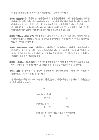- 100 %ub0b4%uc6a9%uc744 %u201c%ud604%uc7a5%uc2e4%uc2b5%uc0dd%u201d%uc758 %uc18c%uc18d%uc9c1%uc5c5%uad50%uc721%ud6c8%ub828%uae30%uad00%uc758 %uc7a5%uc5d0%uac8c %ud1b5%ubcf4%ud55c%ub2e4.%uc81c14%uc870 (%uc2e4%uc2b5%uc911%ub2e8)%u2460 %u201c%uc0ac%uc5c5%uc8fc%u201d%ub294 %u201c%ud604%uc7a5%uc2e4%uc2b5%uc0dd%u201d%uc774 %ud604%uc7a5%uc2e4%uc2b5%ud611%uc57d%uc11c, %uae30%ud0c0 %ud604%uc7a5%uc2e4%uc2b5%uad00%ub828 %uc218%uce59%uc744 %uc704%ubc18%ud558%uc600%uc744 %uacbd%uc6b0 %uc18c%uc18d %u201c%uc9c1%uc5c5%uad50%uc721%ud6c8%ub828%uae30%uad00%uc758 %ub300%ud45c%u201d%uc5d0%uac8c %ud1b5%ubcf4%ud558%uc5ec %uc911%ub2e8 %ub4f1 %ud544%uc694%ud55c %uc870%uce58%ub97c %ucde8%ud558%uc5ec%uc57c %ud55c%ub2e4. %uc774 %uacbd%uc6b0%uc5d0%ub294 %ubc18%ub4dc%uc2dc %u201c%ud604%uc7a5%uc2e4%uc2b5%uc0dd%u201d%uc5d0%uac8c %uc18c%uba85%uae30%ud68c%ub97c %ubd80%uc5ec%ud558%uc5ec%uc57c %ud55c%ub2e4.%u2461 %u201c%ud604%uc7a5%uc2e4%uc2b5%uc0dd%u201d%uc740 %u201c%uc9c1%uc5c5%uad50%uc721%ud6c8%ub828%uae30%uad00 %ub300%ud45c%u201d%uc640 %ud611%uc758%ud558%uc5ec %u201c%uc0ac%uc5c5%uc8fc%u201d%uc5d0%uac8c %uc911%ub2e8%uc744 %uc694%uad6c%ud560 %uc218 %uc788%ub2e4. %uc774 %uacbd%uc6b0 %u201c%uc9c1%uc5c5%uad50%uc721%ud6c8%ub828%uae30%uad00 %ub300%ud45c%u201d%ub294 %u201c%uc0ac%uc5c5%uc8fc%u201d%uc5d0%uac8c %uad00%ub828 %uc0ac%ud56d%uc744 %ubb38%uc11c%ub85c %ud1b5%ubcf4 %ud574%uc57c %ud55c%ub2e4.%uc81c15%uc870 (%ud604%uc7a5%uc2e4%uc2b5 %ub0b4%uc6a9%uc758 %ubcc0%uacbd)%ud604%uc7a5%uc2e4%uc2b5%uc0dd%uc758 %uc18c%uc9c8%u2024%uac74%uac15%u2024%uae30%ub2a5 %uc2b5%ub4dd%uc758 %uc815%ub3c4 %ub610%ub294 %uae30%ud0c0%uc758 %uc0ac%uc720%ub85c %uc778%ud558%uc5ec %u201c%uc0ac%uc5c5%uc8fc%u201d%uac00 %ud604%uc7a5%uc2e4%uc2b5 %ub0b4%uc6a9%uc744 %ubcc0%uacbd%ud558%uace0%uc790 %ud560 %ub54c%uc5d0%ub294 %u201c%ud604%uc7a5%uc2e4%uc2b5%uc0dd%u201d%uacfc %u201c%uc9c1%uc5c5%uad50%uc721%ud6c8%ub828%uae30%uad00 %ub300%ud45c%u201d%uc758 %ub3d9%uc758%ub97c %uc5bb%uc5b4%uc57c %ud55c%ub2e4.%uc81c16%uc870 (%ud604%uc7a5%uc2e4%uc2b5%uc911%ub2e8 %ubc29%uc9c0)%u201c%uc0ac%uc5c5%uc8fc%u201d%ub294 %u201c%uc0ac%uc5c5%uc8fc%u201d%uc758 %uadc0%ucc45%uc0ac%uc720%ub85c %uc778%ud558%uc5ec %u201c%ud604%uc7a5%uc2e4%uc2b5%uc0dd%u201d%uc758 %ud604%uc7a5%uc2e4%uc2b5%uc774 %uc911%ub2e8%ub420 %uacbd%uc6b0%uc5d0%ub294 %u201c%uc9c1%uc5c5%uad50%uc721%ud6c8%ub828%uae30%uad00 %ub300%ud45c%u201d%uc640 %ud611%uc758%ud558%uc5ec %u201c%uc0ac%uc5c5%uc8fc%u201d%uc640 %ub3d9%uc77c%ud558%uac70%ub098 %uc720%uc0ac%ud55c %uc9c1%uc885%uc758 %ub2e4%ub978 %ud604%uc7a5%uc2e4%uc2b5 %uae30%uc5c5%uc73c%ub85c %u201c%ud604%uc7a5%uc2e4%uc2b5%uc0dd%u201d%uc744 %uc54c%uc120%ud558%ub294 %ub4f1 %u201c%ud604%uc7a5%uc2e4%uc2b5%uc0dd%u201d%uc758 %ud604%uc7a5%uc2e4%uc2b5%uc774 %uc911%ub2e8%ub418%uc9c0 %uc54a%ub3c4%ub85d %ub178%ub825%ud558%uc5ec%uc57c %ud55c%ub2e4.%uc81c17%uc870(%uc218%ub8cc%uc99d%uba85%uc11c)%uc81c5%uc870%uc81c1%ud56d%uc5d0 %ub530%ub978 %ud604%uc7a5%uc2e4%uc2b5%uacc4%ud68d%uc5d0 %ub530%ub77c %u201c%ud604%uc7a5%uc2e4%uc2b5%uc0dd%u201d%uc758 %ud604%uc7a5%uc2e4%uc2b5%uc774 %uc885%ub8cc%ub41c %uc774%ud6c4 %u201c%uc0ac%uc5c5%uc8fc%u201d%ub294 %u201c%ud604%uc7a5%uc2e4%uc2b5%uc0dd%u201d%uc774 %uc694%uad6c%ud558%ub294 %uacbd%uc6b0 %ud604%uc7a5%uc2e4%uc2b5 %uc218%ub8cc%uc99d%uba85%uc11c%ub97c %uad50%ubd80%ud55c%ub2e4.%uc81c18%uc870 (%uc900%uc6a9)%ubcf8 %ud611%uc57d%uc740 %ub2e4%ub978 %ubc95%ub839%uc5d0 %uc6b0%uc120%ud558%uba70 %uc774 %ud611%uc57d%uc11c%uc5d0 %uc5c6%ub294 %uc870%ud56d%uc758 %uacbd%uc6b0 %uff62%uc9c1%uc5c5%uad50%uc721 %ud6c8%ub828%ucd09%uc9c4%ubc95%uff63, %uff62%uadfc%ub85c%uae30%uc900%ubc95%uff63%uc744 %uc900%uc6a9%ud55c%ub2e4.%ubcf8 %ud611%uc57d%uc11c%ub294 3%ubd80%ub97c %uc791%uc131%ud558%uc5ec %u201c%uc0ac%uc5c5%uc8fc%u201d, %u201c%ud604%uc7a5%uc2e4%uc2b5%uc0dd%u201d, %u201c%uc9c1%uc5c5%uad50%uc721%ud6c8%ub828%uae30%uad00 %ub300%ud45c%u201d%uac00 %uae30%uba85%ub0a0%uc778%ud55c %ud6c4 %uac01%uac01 1%ubd80%uc529 %ubcf4%uad00%ud55c%ub2e4.20 . .(%uc0ac%uc5c5%uc8fc)%ud68c %uc0ac %uba85 %ub300%ud45c%uc774%uc0ac (%uc778)(%ud604%uc7a5%uc2e4%uc2b5%uc0dd)%uc8fc %uc18c %uc131 %uba85 (%uc778)(%uc9c1%uc5c5%uad50%uc721%ud6c8%ub828%uae30%uad00 %ub300%ud45c)%uc9c1%uc5c5%uad50%uc721%ud6c8%ub828%uae30%uad00%uba85%ub300 %ud45c (%uc778)