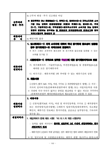 - 102 %uadfc%ubb34%ucc98%uc758%ubcc0%uacbd%u2024%ucd94%uac00%uadfc%ubb34%ucc98 %ubcc0%uacbd%u2024%ucd94%uac00 %uc2e0%uace0%ub300%uc0c1 %uc544%ub2d8%u203b %uc601%ub9ac%ubaa9%uc801%uc774 %uc544%ub2cc %ubb38%ud654%uc608%uc220(D-1), %uc720%ud559(D-2), %uc77c%ubc18%uc5f0%uc218(D-4) %uc790%uaca9%uc18c%uc9c0%uc790%uc758 %uc18c%uc18d%uae30%uad00 %ub610%ub294 %ub2e8%uccb4%uc758 %ubcc0%uacbd(%uba85%uce6d%ubcc0%uacbd %ud3ec%ud568)%uacfc %ucde8%uc7ac(D-5), %uc885%uad50(D-6), %uc8fc%uc7ac(D-7), %uae30%uc5c5%ud22c%uc790(D-8), %ubb34%uc5ed%uacbd%uc601(D-9)%uc790%uaca9%uc18c%uc9c0%uc790%uc758 %uc18c%uc18d%uae30%uad00 %ub610%ub294 %ub2e8%uccb4%uc758 %uba85%uce6d%uc774 %ubcc0%uacbd%ub418%ub294 %uacbd%uc6b0%uc5d0%ub294 %ubc95 %uc81c35%uc870%uc758 %uc678%uad6d%uc778%ub4f1%ub85d%uc0ac%ud56d %ubcc0%uacbd%uc2e0%uace0%ub97c %ubc1b%uc544 %ucc98%ub9ac(%uc2dc%ud589%uaddc%uce59 %uc81c49%uc870%uc758 2)%uccb4%ub958%uc790%uaca9%ubd80%uc5ec%ud574%ub2f9%uc0ac%ud56d %uc5c6%uc74c%uccb4%ub958%uc790%uaca9%ubcc0%uacbd%ud5c8%uac001. %uc77c%uc2dc%ucde8%uc7ac(C-1) %uc790%uaca9 %uc18c%uc9c0%uc790%uc5d0 %ub300%ud558%uc5ec %uad6d%ub0b4 %uc7a5%uae30%ucde8%uc7ac %ud544%uc694%uc131%uc774 %uc785%uc99d%ub420 %uacbd%uc6b0 %uc7a5%uae30%ucde8%uc7ac(D-5) %uc790%uaca9%uc73c%ub85c%uc758 %ubcc0%uacbd%ud5c8%uac00%u203b %ud5c8%uac00 %uc2dc%uc5d0%ub294 %uad00%uacc4%ubd80%ucc98 %ud611%uc870%uacf5%ud55c %ub4f1 %uc7a5%uae30%ucde8%uc7ac %ud544%uc694%uc131%uc744 %uc785%uc99d%ud560 %uc218 %uc788%ub294 %uc11c%ub958%ub97c %uc9d5%uad6c%ud560 %uac832. %uc0ac%uc99d%uba74%uc81c(B-1) %uc790%uaca9%uc73c%ub85c %uc785%uad6d%ud55c %ub3c5%uc77c%uc778%uc5d0 %ub300%ud55c %uc7a5%uae30%uccb4%ub958%uc790%uaca9%uc73c%ub85c %ubcc0%uacbd%uac00.%ud5c8%uac00%uccb4%ub958%uc790%uaca9 :%uae30%uc220%uc5f0%uc218(D-3),%ube44%uc804%ubb38%ucde8%uc5c5(E-9)%ubc0f %uad00%uad11%ucde8%uc5c5(H-1)%uc744%uc81c%uc678%ud55c %ubaa8%ub4e0 %uc7a5%uae30%uccb4%ub958%uc790%uaca9%ub098.%ud5c8%uac00%uae30%uac04 :%uccb4%ub958%uc790%uaca9%ubcc4 1%ud68c %ubd80%uc5ec%ud560 %uc218 %uc788%ub294 %uccb4%ub958%uae30%uac04%uc758 %uc0c1%ud55c3. %uc81c%ucd9c%uc11c%ub958%u2460%uc2e0%uccad%uc11c (%ubcc4%uc9c0 34%ud638 %uc11c%uc2dd),%uc5ec%uad8c,%uc218%uc218%ub8cc %u2461%ud30c%uacac%uba85%ub839%uc11c(%ubcf8%uc0ac %ubc1c%ud589)%u2462%uc9c0%uad6d%uc9c0%uc0ac%uc758 %uc124%uce58%ud5c8%uac00%uc99d(%ubb38%ud654%uccb4%uc721%uad00%uad11%ubd80%uc5d0%uc11c %ubc1c%ud589)%ub610%ub294 %uc0ac%uc5c5%uc790%ub4f1%ub85d%uc99d %uc0ac%ubcf8%u203b%uad6d%ub0b4%uc5d0 %uc9c0%uad6d%uff65%uc9c0%uc0ac%uac00 %uc5c6%uac70%ub098 %uc99d%uba85%uc744 %ubc1c%uae09%ubc1b%uc744 %uc218 %uc5c6%ub294 %uc678%uc2e0%uc740%uc8fc%ubb34%ubd80%ucc98(%ubb38%ud654%uccb4%uc721%uad00%uad11%ubd80 %ud574%uc678%ubb38%ud654%ud64d%ubcf4%uc6d0)%uc758 %ud611%uc870%uacf5%ubb38%uc73c%ub85c %uac08%uc74c%ud560 %uc218 %uc788%uc74c%uccb4%ub958%uae30%uac04%uc5f0%uc7a5%ud5c8%uac001.%uc81c%ucd9c%uc11c%ub958%u2460%uc2e0%uccad%uc11c(%ubcc4%uc9c034%ud638 %uc11c%uc2dd),%uc5ec%uad8c %ubc0f %uc678%uad6d%uc778%ub4f1%ub85d%uc99d,%uc218%uc218%ub8cc %u2461%uc7ac%uc9c1%uc99d%uba85%uc11c %ub610%ub294 %ud30c%uacac%uba85%ub839%uc11c(%ubcf8%uc0ac%ubc1c%ud589)%u2462%uccb4%ub958%uc9c0 %uc785%uc99d%uc11c%ub958(%uc784%ub300%ucc28%uacc4%uc57d%uc11c,%uc219%uc18c%uc81c%uacf5 %ud655%uc778%uc11c,%uccb4%ub958%uae30%uac04 %ub9cc%ub8cc%uc608%uace0 %ud1b5%uc9c0%uc6b0%ud3b8%ubb3c,%uacf5%uacf5%uc694%uae08 %ub0a9%ubd80%uc601%uc218%uc99d,%uae30%uc219%uc0ac%ube44 %uc601%uc218%uc99d %ub4f1)%uc7ac%uc785%uad6d%ud5c8%uac001. %uc7ac%uc785%uad6d%ud5c8%uac00 %uba74%uc81c %uc81c%ub3c4 %uc2dc%ud589(%u201810.12.1.%uc790 %uac1c%uc815 %uc2dc%ud589%uaddc%uce59)-%ub4f1%ub85d%uc744 %ud544%ud55c %uc678%uad6d%uc778%uc774 %ucd9c%uad6d%ud55c %ub0a0%ub85c%ubd80%ud130 1%ub144 %uc774%ub0b4%uc5d0 %uc7ac%uc785%uad6d%ud558%ub824%ub294%uacbd%uc6b0 %uc7ac%uc785%uad6d%ud5c8%uac00 %uba74%uc81c-%uccb4%ub958%uae30%uac04%uc774 1%ub144%ubcf4%ub2e4 %uc801%uac8c %ub0a8%uc544%uc788%ub294 %uacbd%uc6b0 %uccb4%ub958%uae30%uac04 %ubc94%uc704 %ub0b4%uc5d0%uc11c %uc7ac%uc785%uad6d%ud5c8%uac00 %uba74%uc81c%u203b%ub2e8,%uc785%uad6d%uaddc%uc81c %ubc0f %uc0ac%uc99d%ubc1c%uae09%uaddc%uc81c%uc790%ub294 %uccb4%ub958%uc9c0 %uad00%ud560 %uccad(%uc0ac%ubb34%uc18c%u00b7%ucd9c%uc7a5%uc18c)%uc5d0