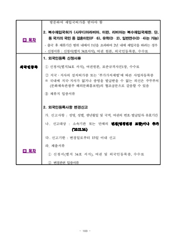 - 103 %uf000%ubaa9%ucc28%ubc29%ubb38%ud558%uc5ec %uc7ac%uc785%uad6d%ud5c8%uac00%ub97c %ubc1b%uc544%uc57c %ud5682. %ubcf5%uc218%uc7ac%uc785%uad6d%ud5c8%uac00 (%uc0ac%uc6b0%ub514%uc544%ub77c%ube44%uc544, %uc774%ub780, %ub9ac%ube44%uc544%ub294 %ubcf5%uc218%uc7ac%uc785%uad6d%uc81c%ud55c. %ub2e8, %ub3d9 %uad6d%uac00%uc758 %uad6d%ubbfc %uc911 %uacb0%ud63c%uc774%ubbfc(F%u00ad6), %uc720%ud559(D%u00ad2), %uc77c%ubc18%uc5f0%uc218(D%u00ad4)%ub294 %uac00%ub2a5)-%ucd9c%uad6d %ud6c4 %uccb4%ub958%uae30%uac04 %ubc94%uc704 %ub0b4%uc5d0%uc11c 1%ub144%uc744 %ucd08%uacfc%ud558%uc5ec 2%ub144 %ub0b4%uc5d0 %uc7ac%uc785%uad6d%uc744 %ud558%ub824%ub294 %uacbd%uc6b0-%uc2e0%uccad%uc11c%ub958 :%uc2e0%uccad%uc11c(%ubcc4%uc9c0 34%ud638%uc11c%uc2dd),%uc5ec%uad8c %uc6d0%ubcf8,%uc678%uad6d%uc778%ub4f1%ub85d%uc99d,%uc218%uc218%ub8cc%uc678%uad6d%uc778%ub4f1%ub85d%uf0001. %uc678%uad6d%uc778%ub4f1%ub85d %uc2e0%uccad%uc11c%ub958%u2460%uc2e0%uccad%uc11c(%ubcc4%uc9c034%ud638 %uc11c%uc2dd),%uc5ec%uad8c%uc6d0%ubcf8,%ud45c%uc900%uaddc%uaca9%uc0ac%uc9c41%uc7a5,%uc218%uc218%ub8cc %u2461%uc9c0%uad6d%u2024%uc9c0%uc0ac%uc758 %uc124%uce58%ud5c8%uac00%uc99d %ub610%ub294 %u2018%ubd80%uac00%uac00%uce58%uc138%ubc95%u2019%uc5d0 %ub530%ub978 %uc0ac%uc5c5%uc790%ub4f1%ub85d%uc99d%u203b%uad6d%ub0b4%uc5d0 %uc9c0%uad6d%uff65%uc9c0%uc0ac%uac00 %uc5c6%uac70%ub098 %uc99d%uba85%uc744 %ubc1c%uae09%ubc1b%uc744 %uc218 %uc5c6%ub294 %uc678%uc2e0%uc740%uc8fc%ubb34%ubd80%ucc98(%ubb38%ud654%uccb4%uc721%uad00%uad11%ubd80 %ud574%uc678%ubb38%ud654%ud64d%ubcf4%uc6d0)%uc758 %ud611%uc870%uacf5%ubb38%uc73c%ub85c %uac08%uc74c%ud560 %uc218 %uc788%uc74c%u2462%uccb4%ub958%uc9c0 %uc785%uc99d%uc11c%ub9582. %uc678%uad6d%uc778%ub4f1%ub85d%uc0ac%ud56d %ubcc0%uacbd%uc2e0%uace0%uac00.%uc2e0%uace0%uc0ac%ud56d :%uc131%uba85,%uc131%ubcc4,%uc0dd%ub144%uc6d4%uc77c %ubc0f %uad6d%uc801,%uc5ec%uad8c%uc758 %ubc88%ud638%u2027%ubc1c%uae09%uc77c%uc790%u2027%uc720%ud6a8%uae30%uac04%ub098%uc2e0%uace0%ub300%uc0c1 %uc18c%uc18d%uae30%uad00 %ub610%ub294 %ub2e8%uccb4%uc758 %ubcc0%uacbd%uba85%uce6d%ubcc0%uacbd %ud3ec%ud568%uc774%ub098 %ucd94%uac00(%u201810.11.16.)%ub2e4.%uc2e0%uace0%uae30%ud55c :%ubcc0%uacbd%uc77c%ub85c%ubd80%ud130 15%uc77c%uc774%ub0b4 %uc2e0%uace0%ub77c.%uc81c%ucd9c%uc11c%ub958%u2460%uc2e0%uccad%uc11c(%ubcc4%uc9c0 34%ud638 %uc11c%uc2dd),%uc5ec%uad8c %ubc0f %uc678%uad6d%uc778%ub4f1%ub85d%uc99d,%uc218%uc218%ub8cc%u2461%ubcc0%uacbd%uad00%ub828 %uc785%uc99d%uc11c%ub958