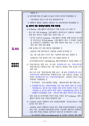 - 117 %uf000%ubaa9%ucc28%uccb4%ub958%uc790%uaca9%ubcc0%uacbd%ud5c8%uac00%uc0ac%ub78c%uc77c %uac83%u274d %uc810%uc218%uc81c%uc5d0 %ub530%ub77c %ucd1d 300%uc810 %uc911 60%uc810 %uc774%uc0c1%uc758 %uc810%uc218%ub97c %ub4dd%uc810%ud558%uc600%uc744 %uac83 -%ud544%uc218%ud56d%ubaa9%uc740 %ubc18%ub4dc%uc2dc 1%uac1c %uc774%uc0c1 %ucda9%uc871%ud558%uc5ec%uc57c %ud568%u274d %ub300%ud55c%ubbfc%uad6d %ubc95%uc778%uc744 %uc124%ub9bd%ud558%uace0 %ubc95%uc778%ub4f1%uae30 %ubc0f %uc0ac%uc5c5%uc790%ub4f1%ub85d%uc744 %uc644%ub8cc%ud558%uc600%uc744 %uac83%u2171)%uc810%uc218%uc81c %uc801%uc6a9 %uba74%uc81c%uc790(%uae30%uc220%ucc3d%uc5c5 %ud2b9%ub840 %ub300%uc0c1%uc790)%u274d K-Startup%uadf8%ub79c%ub4dc%ucc4c%ub9b0%uc9c0 %ucc38%uc5ec%uc790%ub85c%uc11c %uc544%ub798 %uc694%uac74%uc744 %ubaa8%ub450 %uac16%ucd98 %uc790 -%ucd5c%uadfc 2%ub144 %uc774%ub0b4 K-Startup%uadf8%ub79c%ub4dc%ucc4c%ub9b0%uc9c0 %ucc38%uc5ec%uc790*%ub85c%uc11c %uc120%ubc1c%ub418%uc5b4 %uc0ac%uc5c5%ud654%uc9c0%uc6d0%uc744 %ubc1b%uace0 %uc788%uac70%ub098,%uc9c0%uc6d0%uc744 %ubc1b%uc740 %uc0ac%uc2e4%uc774 %uc788%ub294 %uc790 *%uc911%uae30%ubd80 %ucd08%uccad%uc73c%ub85c K-Startup%uadf8%ub79c%ub4dc%ucc4c%ub9b0%uc9c0 %ucc38%uc5ec%ub97c %uc704%ud574 %uc785%uad6d%ud55c %ub2e8%uae30%uccb4%ub958 %uc678%uad6d%uc778%uc73c%ub85c %ud55c%uc815(K-Startup%uadf8%ub79c%ub4dc%ucc4c%ub9b0%uc9c0 %ucc38%uc5ec %uc2dc %ub4f1%ub85d%ud55c %uae30%uc220%ub825%uc744 %ubcf4%uc720%ud558%uac70%ub098 %uc0c1%uc6a9%ud654%ud558%uace0 %uc788%ub294 %ud574%uc678 %ubc95%uc778%uc758 %ub300%ud45c %ub610%ub294 %uadf8 %uc18c%uc18d %uc9c1%uc6d0%uc778 %uacbd%uc6b0 %ud2b9%ub840 %uc801%uc6a9 %ubc30%uc81c)-%uc544%ub798 %uc694%uac74%uc744 %ubaa8%ub450 %uac16%ucd98 %ubc95%uc778%uc744 %uc124%ub9bd%ud558%uc600%uc744 %uac83%u00b7(%ub300%ud45c%uc790)%uc0ac%uc5c5 %ucc38%uc5ec%uc790%ub85c%uc11c %uae30%uc220%ub825%uc744 %ubcf4%uc720%ud55c %ub2f9%uc0ac%uc790%uc77c %uac83%u00b7(%uc5c5 %uc885)%uc0ac%uc5c5 %ucc38%uc5ec %uadfc%uac70%uac00 %ub418%ub294 %uae30%uc220%ub825%uacfc %uad00%ub828 %uc788%ub294 %uc5c5%uc885%uc77c %uac83%u00b7(%uc124%ub9bd%uc870%uac74)%uc0ac%uc5c5 %ucc38%uc5ec%uc77c %uc774%ud6c4 %uc2e0%uaddc %uc124%ub9bd%ub41c %ubc95%uc778%uc77c %uac83 -%uc911%uae30%ubd80%uc7a5%uad00%uc73c%ub85c%ubd80%ud130 %uae30%uc220%ucc3d%uc5c5(D-8-4)%uccb4%ub958%uc790%uaca9%ubcc0%uacbd%ud5c8%uac00 %ucd94%ucc9c%uc744 %ubc1b%uc558%uc744 %uac83%u274d%ucc3d%uc5c5%uc9c0%uc6d0%uc0ac%uc5c5 %ud1b5%ud569 %uacf5%uace0%uc5d0 %ub530%ub978 %uc911%uc559%ud589%uc815%uae30%uad00 %ub610%ub294 %uc9c0%ubc29%uc790%uce58%ub2e8%uccb4%ucc3d%uc5c5%uc9c0%uc6d0%uc0ac%uc5c5 %uc218%ud61c%uc790(%uace0%uae30%uc220 %uae30%ubc18 %uc0ac%uc5c5%uc73c%ub85c %ud55c%uc815)%ub85c %uc544%ub798 %uc694%uac74%uc744 %ubaa8%ub450 %uac16%ucd98 %uc0ac%ub78c-%ucd5c%uadfc 2%ub144 %uc774%ub0b4%u300c%ucc3d%uc5c5%uc9c0%uc6d0%uc0ac%uc5c5 %ud1b5%ud569 %uacf5%uace0*%u300d%uc5d0 %ub530%ub978 %uc911%uc559%ud589%uc815%uae30%uad00 %ub610%ub294 %uc9c0%ubc29%uc790%uce58%ub2e8%uccb4%ucc3d%uc5c5%uc9c0%uc6d0%uc0ac%uc5c5 %uc218%ud61c%uc790(%uace0%uae30%uc220 %uae30%ubc18 %uc0ac%uc5c5%uc73c%ub85c %ud55c%uc815)%ub85c %uc120%uc815%ub418%uc5b4 %uc911%uc559%ud589%uc815%uae30%uad00 %ub610%ub294 %uc9c0%ubc29%uc790%uce58%ub2e8%uccb4%ub85c%ubd80%ud130 3%ucc9c%ub9cc%uc6d0 %uc774%uc0c1%uc758 %uc9c1%uc811 %uc0ac%uc5c5%ube44%ub97c %uc9c0%uc6d0%ubc1b%uc558%uc744 %uac83 *%uc911%uae30%ubd80%uc5d0%uc11c %u300c%uc911%uc18c%uae30%uc5c5%ucc3d%uc5c5 %uc9c0%uc6d0%ubc95%u300d%uc81c5%uc870%uc5d0 %ub530%ub77c %ub9e4%ub144 %ud1b5%ud569 %uacf5%uace0%u203b%uc911%uc559%ud589%uc815%uae30%uad00 %ub610%ub294 %uc9c0%ubc29%uc790%uce58%ub2e8%uccb4%ub85c %ubd80%ud130 %uc9c1%uc811 %uc0ac%uc5c5%ube44 3%ucc9c%ub9cc %uc6d0 %uc774%uc0c1%uc744 %uc9c0%uc6d0%ubc1b%uc558%uc73c%ub098,%uc810%uc218%uc81c %uc801%uc6a9 %uba74%uc81c%ub97c %uc704%ud55c %uc911%uae30%ubd80 %uc7a5%uad00%uc758 %ucd94%ucc9c%uc11c%uff65%uc778%uc815 %uae30%uac04(2%ub144)%ub4f1 %uc694%uac74%uc744 %uac16%ucd94%uc9c0 %ubabb%ud55c %uc0ac%ub78c%uc740 %uae30%uc220%ucc3d%uc5c5(D-8-4)%uc810%uc218%ud45c %uc911OASIS-9%uc774%uc218(30%uc810)%ub85c %uc778%uc815 %u2192%uc810%uc218%uc81c %uc801%uc6a9 (%ubd99%uc784 %u2018%uc810%uc218%uc81c %uae30%uc900%u2019%ucc38%uace0)-%ubc95%uc778 %uc124%ub9bd %ubc0f %uc911%uae30%ubd80%uc7a5%uad00 %ucd94%ucc9c%uc11c %ubc1c%uae09 %uae30%uc900%uc740 %uc0c1%uae30 K-Startup%uadf8%ub79c%ub4dc%ucc4c%ub9b0%uc9c0 %ucc38%uc5ec%uc790 %uc778%uc815 %uae30%uc900%uacfc %ub3d9%uc77c%ud558%uac8c %uc801%uc6a9%u274d %u2018%uc2a4%ud0c0%ud2b8%uc5c5 %ucf54%ub9ac%uc544 %ud2b9%ubcc4%ube44%uc790 %ucd94%ucc9c %ubbfc%uac04%ud3c9%uac00%uc704%uc6d0%ud68c%u2019%uc2ec%uc0ac%uc2b9%uc778%uc790%ub85c%uc11c %uc544%ub798 %uc694%uac74%uc744 %ubaa8%ub450 %uac16%ucd98 %uc790-%uc2a4%ud0c0%ud2b8%uc5c5 %ucf54%ub9ac%uc544 %ud2b9%ubcc4%ube44%uc790 %ucd94%ucc9c%uc744 %ubc1b%uae30 %uc704%ud574 %ubbfc%uac04%ud3c9%uac00%uc704%uc6d0%ud68c*%uc758 %uc2ec%uc0ac%ub97c%ubc1b%uc740 %uc790%ub85c,%uc911%uc18c%ubca4%ucc98%uae30%uc5c5%ubd80%uc7a5%uad00%uc73c%ub85c%ubd80%ud130 %uae30%uc220%ucc3d%uc5c5 %uccb4%ub958%uc790%uaca9 %ubcc0%uacbd%ud5c8%uac00 %ub4f1%uc744 %uc704%ud55c %ucd94%ucc9c%uc744 %ubc1b%uc558%uc744 %uac83(%ucd94%ucc9c%uc11c %uc720%ud6a8%uae30%uac04 %ub0b4 %uccb4%ub958%ud5c8%uac00 %uc2e0%uccad)*K-%uc2a4%ud0c0%ud2b8%uc5c5 %ud3ec%ud138(www.k-startup.go.kr)%ubc0f %uae00%ub85c%ubc8c %uc2a4%ud0c0%ud2b8%uc5c5 %uc13c%ud130 %ud648%ud398