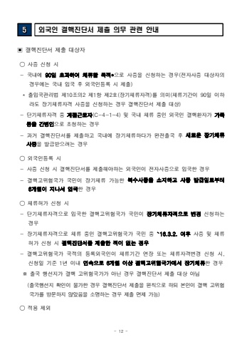 - 12 -5%uc678%uad6d%uc778 %uacb0%ud575%uc9c4%ub2e8%uc11c %uc81c%ucd9c %uc758%ubb34 %uad00%ub828 %uc548%ub0b4%u25a3%uacb0%ud575%uc9c4%ub2e8%uc11c %uc81c%ucd9c %ub300%uc0c1%uc790%u25ef %uc0ac%uc99d %uc2e0%uccad %uc2dc- %uad6d%ub0b4%uc5d0 90%uc77c %ucd08%uacfc%ud558%uc5ec %uccb4%ub958%ud560 %ubaa9%uc801*%uc73c%ub85c %uc0ac%uc99d%uc744 %uc2e0%uccad%ud558%ub294 %uacbd%uc6b0(%uc804%uc790%uc0ac%uc99d %ub300%uc0c1%uc790%uc758 %uacbd%uc6b0%uc5d0%ub294 %uad6d%ub0b4 %uc785%uad6d %ud6c4 %uc678%uad6d%uc778%ub4f1%ub85d %uc2dc %uc81c%ucd9c)* %ucd9c%uc785%uad6d%uad00%ub9ac%ubc95 %uc81c10%uc870%uc7582 %uc81c1%ud56d %uc81c2%ud638(%uc7a5%uae30%uccb4%ub958%uc790%uaca9)%ub97c %uc758%ubbf8(%uccb4%ub958%uae30%uac04%uc774 90%uc77c %uc774%ud558%ub77c%ub3c4 %uc7a5%uae30%uccb4%ub958%uc790%uaca9 %uc0ac%uc99d%uc744 %uc2e0%uccad%ud558%ub294 %uacbd%uc6b0 %uacb0%ud575%uc9c4%ub2e8%uc11c %uc81c%ucd9c %ub300%uc0c1)- %ub2e8%uae30%uccb4%ub958%uc790%uaca9 %uc911 %uacc4%uc808%uadfc%ub85c%uc790(C-4-1~4) %ubc0f %uad6d%ub0b4 %uccb4%ub958 %uc911%uc778 %uc678%uad6d%uc778 %uacb0%ud575%ud658%uc790%uac00 %uac00%uc871 %ub4f1%uc744 %uac04%ubcd1%uc778%uc73c%ub85c %ucd08%uccad%ud558%ub294 %uacbd%uc6b0- %uacfc%uac70 %uacb0%ud575%uc9c4%ub2e8%uc11c%ub97c %uc81c%ucd9c%ud558%uace0 %uad6d%ub0b4%uc5d0 %uc7a5%uae30%uccb4%ub958%ud558%ub2e4%uac00 %uc644%uc804%ucd9c%uad6d %ud6c4 %uc0c8%ub85c%uc6b4 %uc7a5%uae30%uccb4%ub958%uc0ac%uc99d%uc744 %ubc1c%uae09%ubc1b%uc73c%ub824%ub294 %uacbd%uc6b0%u25ef %uc678%uad6d%uc778%ub4f1%ub85d %uc2dc- %uc0ac%uc99d %uc2e0%uccad %uc2dc %uacb0%ud575%uc9c4%ub2e8%uc11c%ub97c %uc81c%ucd9c%ud574%uc57c%ud558%ub294 %uc678%uad6d%uc778%uc774 %uc804%uc790%uc0ac%uc99d%uc73c%ub85c %uc785%uad6d%ud55c %uacbd%uc6b0- %uacb0%ud575%uace0%uc704%ud5d8%uad6d%uac00 %uad6d%ubbfc%uc774 %uc7a5%uae30%uccb4%ub958 %uac00%ub2a5%ud55c %ubcf5%uc218%uc0ac%uc99d%uc744 %uc18c%uc9c0%ud558%uace0 %uc0ac%uc99d %ubc1c%uae09%uc77c%ub85c%ubd80%ud130 6%uac1c%uc6d4%uc774 %uc9c0%ub098%uc11c %uc785%uad6d%ud55c %uacbd%uc6b0%u25ef %uccb4%ub958%ud5c8%uac00 %uc2e0%uccad %uc2dc- %ub2e8%uae30%uccb4%ub958%uc790%uaca9%uc73c%ub85c %uc785%uad6d%ud55c %uacb0%ud575%uace0%uc704%ud5d8%uad6d%uac00 %uad6d%ubbfc%uc774 %uc7a5%uae30%uccb4%ub958%uc790%uaca9%uc73c%ub85c %ubcc0%uacbd %uc2e0%uccad%ud558%ub294 %uacbd%uc6b0- %uc7a5%uae30%uccb4%ub958%uc790%uaca9%uc73c%ub85c %uccb4%ub958 %uc911%uc778 %uacb0%ud575%uace0%uc704%ud5d8%uad6d%uac00 %uad6d%ubbfc %uc911 `16.3.2. %uc774%ud6c4%uc0ac%uc99d %ubc0f %uccb4%ub958%ud5c8%uac00 %uc2e0%uccad %uc2dc %uacb0%ud575%uc9c4%ub2e8%uc11c%ub97c %uc81c%ucd9c%ud55c %uc801%uc774 %uc5c6%ub294 %uacbd%uc6b0- %uacb0%ud575%uace0%uc704%ud5d8%uad6d%uac00 %uad6d%uc801%uc758 %ub4f1%ub85d%uc678%uad6d%uc778%uc774 %uccb4%ub958%uae30%uac04 %uc5f0%uc7a5 %ub610%ub294 %uccb4%ub958%uc790%uaca9%ubcc0%uacbd %uc2e0%uccad %uc2dc, %uc2e0%uccad%uc77c %uae30%uc900 1%ub144 %uc774%ub0b4 %uc5f0%uc18d%uc73c%ub85c 6%uac1c%uc6d4 %uc774%uc0c1 %uacb0%ud575%uace0%uc704%ud5d8%uad6d%uac00%uc5d0%uc11c %uc7a5%uae30%uccb4%ub958%ud55c %uacbd%uc6b0%u203b %ucd9c%uad6d %ud589%uc120%uc9c0%uac00 %uacb0%ud575 %uace0%uc704%ud5d8%uad6d%uac00%uac00 %uc544%ub2cc %uacbd%uc6b0 %uacb0%ud575%uc9c4%ub2e8%uc11c %uc81c%ucd9c %ub300%uc0c1 %uc544%ub2d8(%ucd9c%uad6d%ud589%uc120%uc9c0 %ud655%uc778%uc774 %ubd88%uac00%ud55c %uacbd%uc6b0 %uacb0%ud575%uc9c4%ub2e8%uc11c %uc81c%ucd9c%uc744 %uc6d0%uce59%uc73c%ub85c %ud558%ub418 %ubcf8%uc778%uc774 %uacb0%ud575 %uace0%uc704%ud5d8 %uad6d%uac00%ub97c %ubc29%ubb38%ud558%uc9c0 %uc54a%uc558%uc74c%uc744 %uc18c%uba85%ud558%ub294 %uacbd%uc6b0 %uc81c%ucd9c %uba74%uc81c %uac00%ub2a5) %u25ef %uc801%uc6a9 %uc81c%uc678