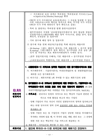 - 121 %uf000%uccb4%ub958%uc790%uaca9%ubcc0%uacbd%ud5c8%uac005. %uc0ac%uc99d%uba74%uc81c(B-1) %uc790%uaca9%uc73c%ub85c %uc785%uad6d%ud55c %ub3c5%uc77c%uc778%uc5d0 %ub300%ud55c %uc7a5%uae30%uccb4%ub958%uc790%uaca9%uc73c%ub85c %ubcc0%uacbd%uac00.%ud5c8%uac00%uccb4%ub958%uc790%uaca9 :%uae30%uc220%uc5f0%uc218(D-3),%ube44%uc804%ubb38%ucde8%uc5c5(E-9)%ubc0f %uad00%uad11%ucde8%uc5c5(H-1)%uc744%uc81c%uc678%ud55c %ubaa8%ub4e0 %uc7a5%uae30%uccb4%ub958%uc790%uaca9%ub098.%ud5c8%uac00%uae30%uac04 :%uccb4%ub958%uc790%uaca9%ubcc4 1%ud68c %ubd80%uc5ec%ud560 %uc218 %uc788%ub294 %uccb4%ub958%uae30%uac04%uc758 %uc0c1%ud55c6. %ub2e8%uae30%ubc29%ubb38(C-3-4) %uc790%uaca9%uc18c%uc9c0 %uce60%ub808%uad6d%ubbfc%uc5d0 %ub300%ud55c %uc8fc%uc7ac(D-7), %uae30%uc5c5%ud22c%uc790(D-8), %ubb34%uc5ed%uacbd%uc601(D-9)%uc758 %uc694%uac74%uc744 %uac16%ucd98 %uc790%uc5d0 %ub300%ud55c %uccb4%ub958%uc790%uaca9 %ubcc0%uacbd%ud5c8%uac00(%ud55c-%uce60%ub808 %uc790%uc720%ubb34%uc5ed%ud611%uc815(FTA)%uc5d0 %ub530%ub978 %uc0ac%uc99d%ubc1c%uae09 %uc9c0%uce68:%uc785%uad6d%uc2ec%uc0ac%uacfc-3379,%u201804.03.30.)%uc790%uaca9%uc694%uac74:%uad00%ub9ac%uc790%ub098 %uc784%uc6d0%uc758 %uc790%uaca9%uc73c%ub85c %ub610%ub294 %ud575%uc2ec%uc801 %uae30%uc220%uacfc %uad00%ub828%ub41c %uc790%uaca9%uc73c%ub85c %uc544%ub798 %ud65c%ub3d9%uc744 %ud558%uace0%uc790 %ud558%ub294 %uae30%uc5c5%uc778-%ub2f9%ud574 %uae30%uc5c5%uc778%uc774 %uc8fc%ub85c %uc790%uc2e0%uc774 %uad6d%ubbfc%uc778 %uc77c%ubc29%ub2f9%uc0ac%uad6d%uc758 %uc601%uc5ed%uacfc %uc785%uad6d%ud558%uace0%uc790%ud558%ub294 %ud0c0%ubc29 %ub2f9%uc0ac%uad6d%uc758 %uc601%uc5ed %uac04%uc5d0 %uc2e4%uc9c8%uc801%uc778 %uc0c1%ud488 %ub610%ub294 %uc11c%ube44%uc2a4 %ubb34%uc5ed%uc5d0 %uc885%uc0ac%ud558%ub294 %uc790-%ub2f9%ud574 %uae30%uc5c5%uc778 %ub610%ub294 %ub3d9 %uae30%uc5c5%uc778%uc758 %uae30%uc5c5%uc774 %uc0c1%ub2f9%ud55c %uc790%ubcf8%uc744 %ud22c%uc790%ud588%uac70%ub098 %ud22c%uc790%ud558%ub294 %uacfc%uc815%uc5d0 %uc788%uc744 %ub54c,%uc774 %ud22c%uc790%uc758 %uc124%ub9bd,%uac1c%ubc1c,%uad00%ub9ac %ub610%ub294 %uadf8 %uc6b4%uc601%uc5d0 %ub300%ud55c %uc790%ubb38 %ub610%ub294 %ud575%uc2ec%uc801%uc778 %uae30%uc220 %uc11c%ube44%uc2a4%uc758 %uc81c%uacf5%ud558%ub294 %uc790%uc81c%ucd9c%uc11c%ub958 :%uc790%uaca9%uc694%uac74%uc744 %ud655%uc778%ud560 %uc218 %uc788%ub294 %uc11c%ub958%u261e%uc9c0%uc2dd%uc7ac%uc0b0%uad8c %ubcf4%uc720 %uac80%uc0c9%uc740 %ud2b9%ud5c8%uccad%uc758 %u2018%ud2b9%ud5c8%uc815%ubcf4%ub137 %ud0a4%ud504%ub9ac%uc2a4%u2019(www.kipris.or.kr/khome/main.jsp)%ud65c%uc6a9-OECD%uad6d%uac00 %uc9c0%uc2dd%uc7ac%uc0b0%uad8c %ubcf4%uc720(%ub4f1%ub85d)%uc790%ub294 %uadf8 %uc0ac%uc2e4%uc744 %uc785%uc99d%ud560 %uc218 %uc788%ub294 %uc11c%ub958 %uc0ac%ubcf8(%uc544%ud3ec%uc2a4%ud2f0%uc720 %ud655%uc778%uc744 %uc6d0%uce59%uc73c%ub85c %ud558%ub418,%ubbf8%uac00%uc785 %uad6d%uac00 %uad6d%ubbfc%uc740 OECD%uad6d%uac00 %uc8fc%uc7ac %ub300%ud55c%ubbfc%uad6d %uc601%uc0ac %ud655%uc778%uc73c%ub85c %uac08%uc74c)-%ud2b9%ud5c8 %ub4f1 %ucd9c%uc6d0%uc790%ub294 %ud2b9%ud5c8%uccad%uc7a5 %ubc1c%ud589 %ucd9c%uc6d0%uc0ac%uc2e4%uc99d%uba85%uc11c-%ubc95%ubb34%ubd80%uc7a5%uad00%uc774 %uc9c0%uc815%ud55c %u2018%uae00%ub85c%ubc8c%ucc3d%uc5c5%uc774%ubbfc%uc13c%ud130%u2019%uc758 %uc7a5%uc774 %ubc1c%uae09%ud55c %ucc3d%uc5c5%uc774%ubbfc%uc885%ud569%uc9c0%uc6d0%uc2dc%uc2a4%ud15c(OASIS)%ud574%ub2f9 %ud56d%ubaa9 %uc774%uc218(%uc218%ub8cc,%uc878%uc5c5)%uc99d%uc11c,%uc785%uc0c1%ud655%uc778%uc11c,%uc120%uc815%uacf5%ubb38 %ub4f1 %uc785%uc99d%uc11c%ub958-%uae30%ud0c0 %uc810%uc218%uc81c %ud574%ub2f9 %ud56d%ubaa9 %ub4f1 %uc785%uc99d%uc11c%ub958%u326f%uc810%uc218%uc81c %uc801%uc6a9 %uba74%uc81c %ub300%uc0c1%uc790(%uae30%uc220%ucc3d%uc5c5 %ud2b9%ub840 %ub300%uc0c1%uc790)%uc81c%ucd9c%uc11c%ub958-(K-Startup%uadf8%ub79c%ub4dc %ucc4c%ub9b0%uc9c0 %ucc38%uc5ec%uc790)%uae30%ubcf8 %uc81c%ucd9c%uc11c%ub958 +%uc911%uae30%ubd80 %ubc1c%ud589 K-startup%uadf8%ub79c%ub4dc%ucc4c%ub9b0%uc9c0 %ucc38%uc5ec %ud655%uc778%uc11c,%uc911%uae30%ubd80%uc7a5%uad00 %ucd94%ucc9c %uacf5%ubb38 (%ud655%uc778%uc11c %ubc0f %ucd94%ucc9c%uc11c%ub294 %ucd5c%ucd08 %uccb4%ub958%uc790%uaca9%ubcc0%uacbd%ud5c8%uac00 %uc2dc%uc5d0%ub9cc %uc9d5%uad6c)-(%uc815%ubd80 %ucc3d%uc5c5%uc9c0%uc6d0%uc0ac%uc5c5 %uc218%ud61c%uc790)%uae30%ubcf8 %uc81c%ucd9c%uc11c%ub958 +%uc911%uae30%ubd80%uc7a5%uad00 %ucd94%ucc9c%uc11c-(%uc2a4%ud0c0%ud2b8%uc5c5%ucf54%ub9ac%uc544 %ud2b9%ubcc4%ube44%uc790)%uae30%ubcf8 %uc81c%ucd9c%uc11c%ub958 +%uc911%uae30%ubd80%uc7a5%uad00 %ucd94%ucc9c%uc11c%uccb4%ub958%uae30%uac041. %ubc95%uc778%uc5d0 %ud22c%uc790(D-8-1)%ud55c %uc678%uad6d%uc778%uc5d0 %ub300%ud55c %uccb4%ub958%uae30%uac04 %uc5f0%uc7a5%ud5c8%uac00