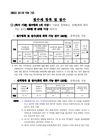 - 127 %u3010%ubd99%uc784%u3011%uc810%uc218%uc81c %uc801%uc6a9 %uae30%uc900%uc810%uc218%uc81c%ud56d%ubaa9%ubc0f%uc810%uc218%u25a1(%ud5c8%uac00 %uae30%uc900)%ud544%uc218%ud56d%ubaa9 1%uac1c %uc774%uc0c1%uc758 %uae30%uc900%uc744 %ucda9%uc871%ud558%uace0,%uc804%uccb4(%ucd5c%ub300 %ucde8%ub4dd%uac00%ub2a5 %uc810%uc218)300%uc810 %uc911 60%uc810%uc774%uc0c1%ucde8%ub4dd%uc790%u25cb%ud544%uc218%ud56d%ubaa9 %ubc0f %uc810%uc218(%ucd5c%ub300 %ucde8%ub4dd %uac00%ub2a5 %uc810%uc218 180%uc810):%uc911%ubcf5%uc0b0%uc785 %uac00%ub2a5%uad6c%ubd84%uc9c0%uc2dd%uc7ac%uc0b0%uad8c(%ucd5c%ub300 60%uc810)%uc815%ubd80 %ucc3d%uc5c5%uc9c0%uc6d0%uc0ac%uc5c5 %uc218%ud61c%uc7901)%ub610%ub294OASIS-6%ub610%ub294OASIS-9%uad50%uc218(E1) %uc790%uaca9 %ub610%ub294 %uc5f0%uad6c(E3) %uc790%uaca9%uc73c%ub85c 3%ub144 %uc774%uc0c1 %uccb4%ub9582)1%uc5b5 %uc6d0 %uc774%uc0c1 %ud22c%uc790%uc720%uce58 %ubc1b%uc740 %uc7903)%uc9c0%uc2dd%uc7ac%uc0b0%uad8c %ubcf4%uc720%uc790(%ub4f1%ub85d)%ubcf4%uc720(%ub4f1%ub85d) %uc644%ub8cc%ub41c %uc9c0%uc2dd%uc7ac%uc0b0%uad8c%uc758 %ubc1c%uba85%uc790(%ucc3d%uc791%uc790)%uc9c0%uc2dd%uc7ac%uc0b0%uad8c %ucd9c%uc6d0%uc790(%ucd5c%ub300 10%uc810)%ud2b9%ud5c8%uc2e4%uc6a9%uc2e0%uc548%ub610%ub294 %ub514%uc790%uc778%ud2b9%ud5c8%uc2e4%uc6a9%uc2e0%uc548 %ub610%ub294 %ub514%uc790%uc778%ud2b9%ud5c8%uc2e4%uc6a9%uc2e0%uc548 %ub610%ub294 %ub514%uc790%uc778%ubc30%uc81060303010105303060%u203b %uc5ec%ub7ec %uac1c%uc758 %uc9c0%uc2dd%uc7ac%uc0b0%uad8c %ubcf4%uc720(%ub4f1%ub85d)%uff65%ubc1c%uba85%uff65%ucd9c%uc6d0 %uc2e4%uc801%uc774 %uc788%ub294 %uacbd%uc6b0 %ucd5c%ub300 60%uc810 %ub0b4%uc5d0%uc11c %uc911%ubcf5 %uc0b0%uc785%uc744 %ud5c8%uc6a9%ud558%uace0(%ub2e8, %uc9c0%uc2dd%uc7ac%uc0b0%uad8c %ucd9c%uc6d0%uc740 %ucd9c%uc6d0 %uac1c%uc218%uc640 %uad00%uacc4%uc5c6%uc774 %ucd5c%ub300 10%uc810%uae4c%uc9c0%ub9cc %uc778%uc815), %uacf5%ub3d9(%uad6d%ubbfc, %uc678%uad6d%uc778, %ub2e8%uccb4, %ubc95%uc778 %ub4f1)%uc73c%ub85c %uc9c0%uc2dd%uc7ac%uc0b0%uad8c%uc744 %ubcf4%uc720(%ub4f1%ub85d)%uff65%ubc1c%uba85%uff65%ucd9c%uc6d0, OASIS-6, 9 %ud504%ub85c%uadf8%ub7a8 %ub610%ub294 %uc815%ubd80 %ucc3d%uc5c5%uc9c0%uc6d0%uc0ac%uc5c5 %uc218%ud61c, 1%uc5b5%uc6d0 %uc774%uc0c1 %ud22c%uc790%uc720%uce58%ub97c %ubc1b%uc740 %uacbd%uc6b0 %ud574%ub2f9 %uc810%uc218%ub97c %uacf5%ub3d9 %uc778%uc6d0%ubbfc%ud07c %ub098%ub208 %uc810%uc218%ub97c %uc778%uc815%u25cb%uc120%ud0dd%ud56d%ubaa9 %ubc0f %uc810%uc218(%ucd5c%ub300 %ucde8%ub4dd %uac00%ub2a5 %uc810%uc218 120%uc810):%uc911%ubcf5%uc0b0%uc785 %uac00%ub2a5%uad6c%ubd84OASIS-1OASIS-24)OASIS-4OASIS-5OASIS-7OASIS-8%ud55c%uad6d%uc5b4 %ub2a5%ub825%uad6d%ub0b4%u2027%uc678 %ub300%ud559%uc11d%uc0ac%ud559%uc704 %uc774%uc0c1 %uc18c%uc9c0%ud1a0%ud53d5%uae09 %uc774%uc0c1 %uc774%uc218%ub610%ub294KIIP 5%ub2e8%uacc4 %uc774%uc0c1 %uc774%uc218%ud1a0%ud53d3%uae09 %uc774%uc0c1 %uc774%uc218%ub610%ub294KIIP 3%ub2e8%uacc4 %uc774%uc0c1 %uc774%uc218%ubc30%uc810%uac01 10%uac01 15201010<%ubc94%ub840>: 1)%uc911%uc559%ud589%uc815%uae30%uad00 %ub610%ub294 %uc9c0%ubc29%uc790%uce58%ub2e8%uccb4%ub85c%ubd80%ud130 %uc9c1%uc811 %uc0ac%uc5c5%ube44 3%ucc9c%ub9cc %uc6d0 %uc774%uc0c1%uc744 %uc9c0%uc6d0%ubc1b%uc558%uc73c%ub098, %uc810%uc218%uc81c %uc801%uc6a9 %uba74%uc81c%ub97c %uc704%ud55c %uc911%uae30%ubd80 %uc7a5%uad00%uc758 %ucd94%ucc9c%uc11c%uff65%uc778%uc815%uae30%uac04(2%ub144) %ub4f1 %uc694%uac74%uc744%uac16%ucd94%uc9c0 %ubabb%ud55c %uc0ac%ub78c2) %ud604 %uccb4%ub958%uc790%uaca9%uacfc %uad00%uacc4%uc5c6%uc774 %uacfc%uac70 %uccb4%ub958%uc774%ub825%ub3c4 %uc778%uc815%ud558%ub418, %uc5f0%uad6c(E-3)%uc5d0%uc11c %uad50%uc218(E-1) %uc790%uaca9%uc73c%ub85c %uc790%uaca9%ubcc0%uacbd%ud55c %uacbd%uc6b0 %uac01 %uc790%uaca9%ubcc4 %uccb4%ub958%uae30%uac04%uc744 %ud569%uc0b0%ud558%uc5ec %uad6d%ub0b4 %uccb4%ub958%ud55c %uae30%uac04%uc774 2%ub144 %uc774%uc0c1%uc774%uba74 %uc810%uc218 %uc778%uc8153) AC%u00b7VC %ub4f1%uc73c%ub85c%ubd80%ud130 %ucc3d%uc5c5%uc744 %ubaa9%uc801%uc73c%ub85c 1%uc5b5 %uc6d0 %uc774%uc0c1 %ud22c%uc790%ubc1b%uc740 %uc0ac%uc2e4%uc744 %uae00%ub85c%ubc8c%ucc3d%uc5c5%uc774%ubbfc%uc13c%ud130%uc5d0%uc11c %ud655%uc778%ud558%uc5ec %ucd94%ucc9c%ud55c %uc7904) OECD %uad6d%uac00%uc758 %uc9c0%uc2dd%uc7ac%uc0b0%uad8c%uc744 %ubcf4%uc720(%ub4f1%ub85d)%ud55c %uacbd%uc6b0, OASIS-2 %uad50%uc721 %uba74%uc81c %ubc0f %uc810%uc218 %uc778%uc815