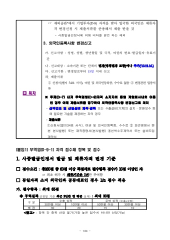 - 134 (%ubd99%uc7841) %ubb34%uc5ed%uc5c5(D-9-1) %uc790%uaca9 %uc810%uc218%uc81c %ud56d%ubaa9 %ubc0f %uc810%uc2181. %uc0ac%uc99d%ubc1c%uae09%uc778%uc815%uc11c %ubc1c%uae09 %ubc0f %uccb4%ub958%uc790%uaca9 %ubcc0%uacbd %uae30%uc900%u25a1 %uc810%uc218%uc694%uac74 : %ucd1d160%uc810 %uc911 60%uc810 %uc774%uc0c1 %ub4dd%uc810%uc790%ub85c %ud544%uc218%ud56d%ubaa9 %uc810%uc218%uac00 10%uc810 %uc774%uc0c1%uc778 %uc790%u21d2 %ucd5c%ucd08 %ud5c8%uac00 %uc2dc %uccb4%ub958%uae30%uac04%uc740 1%ub144%ub9cc %ubd80%uc5ec%ud568%u25a1 %ub3d9%uc77c%uc790%uaca9 %uc18c%uc9c0 %uc678%uad6d%uc778%uacfc %uacf5%ub3d9%ub300%ud45c%uc778 %uacbd%uc6b0 1/n %uc810%uc218 %uc801%uc6a9%uac00. %ud544%uc218%ud56d%ubaa9 : %ucd5c%ub300 65%uc810 %u25c6 %ubb34%uc5ed%uc2e4%uc801(%uc2e0%uccad%uc77c %uae30%uc900 %ucd5c%uadfc 2%ub144%uac04 %uc5f0 %ud3c9%uade0%uc2e4%uc801) : %ucd5c%ub300 30%uc810%uad6c %ubd84%uc218%ucd9c %uc2e4%uc801%ubb34%uc5ed %uc2e4%uc801 (%uc218%ucd9c+%uc218%uc785)30%ub9cc%ubd88 %uc774%uc0c110%ub9cc%ubd88 %uc774%uc0c150%ub9cc%ubd88 %uc774%uc0c130%ub9cc%ubd88 %uc774%uc0c1%ubc30 %uc81030201510<%ucc38%uace0>:%ud56d%ubaa9%uac04%uc911%ubcf5%uc0b0%uc815%ubd88%uac00(%uac00%uc7a5%ub192%uc740%uc810%uc218%uce58%ud558%ub098%ub9cc%uc0b0%uc815%uac00%ub2a5)%uf000%ubaa9%ucc28%u261e%uc7ac%uc678%uacf5%uad00*%uc5d0%uc11c %uae30%uc5c5%ud22c%uc790(D-8)%uc790%uaca9%uc744 %ubc1b%uc544 %uc785%uad6d%ud55c %uc678%uad6d%uc778%uc740 %uccb4%ub958%uc790%uaca9%ubcc0%uacbd%uc2e0%uccad %uc2dc %uc81c%ucd9c%uc11c%ub958%ub97c %uc900%uc6a9%ud574%uc11c %uc81c%ucd9c %ubc1b%uc744 %uac83*%uc0ac%uc99d%ubc1c%uae09%uc778%uc815%uc11c%uc5d0%uc758%ud574%ube44%uc790%ub97c%ubc1b%uc740%uc790%ub294%uc81c%uc6783. %uc678%uad6d%uc778%ub4f1%ub85d%uc0ac%ud56d %ubcc0%uacbd%uc2e0%uace0%uac00.%uc2e0%uace0%uc0ac%ud56d :%uc131%uba85,%uc131%ubcc4,%uc0dd%ub144%uc6d4%uc77c %ubc0f %uad6d%uc801,%uc5ec%uad8c%uc758 %ubc88%ud638%u2027%ubc1c%uae09%uc77c%uc790%u2027%uc720%ud6a8%uae30%uac04%ub098.%uc2e0%uace0%ub300%uc0c1 :%uc18c%uc18d%uae30%uad00 %ub610%ub294 %ub2e8%uccb4%uc758 %ubcc0%uacbd(%uba85%uce6d%ubcc0%uacbd %ud3ec%ud568)%uc774%ub098 %ucd94%uac00(%u201810.11.16.)%ub2e4.%uc2e0%uace0%uae30%ud55c :%ubcc0%uacbd%uc77c%ub85c%ubd80%ud130 15%uc77c%uc774%ub0b4 %uc2e0%uace0%ub77c.%uc81c%ucd9c%uc11c%ub958%u2460%uc2e0%uccad%uc11c(%ubcc4%uc9c0 34%ud638 %uc11c%uc2dd),%uc5ec%uad8c %ubc0f %uc678%uad6d%uc778%ub4f1%ub85d%uc99d,%uc218%uc218%ub8cc %uc5c6%uc74c %u2461%ubcc0%uacbd%uad00%ub828 %uc785%uc99d%uc11c%ub958%u203b %uc8fc%uc7ac(D-7) %ub0b4%uc9c0 %ubb34%uc5ed%uacbd%uc601(D-9)%uc790%uaca9 %uc18c%uc9c0%uc790%uc758 %ub3d9%uc77c %uacc4%uc5f4%ud68c%uc0ac%ub0b4%uc758 %uc774%ub3d9%uc778 %uacbd%uc6b0 %uc544%ub798 %uc81c%ucd9c%uc11c%ub958%ub97c %uc9d5%uad6c%ud558%uc5ec %uc678%uad6d%uc778%ub4f1%ub85d%uc0ac%ud56d %ubcc0%uacbd%uc2e0%uace0%ub85c %ucc98%ub9ac%u25e6 %uc120%ubc15%uac74%uc870 %ubc0f %uc0b0%uc5c5%uc124%ube44 %uc81c%uc791%u00b7%uac10%ub3c5%ub610%ub294 %uc218%ucd9c%uc124%ube44(%uae30%uacc4)%uc758 %uc124%uce58 %u2024 %uc6b4%uc601%u2024%ubcf4%uc218 %ub4f1%uc5d0 %ud544%uc694%ud55c %uae30%uc220%uc744 %uc81c%uacf5%ud558%ub294 %uc790%uc758 %uacbd%uc6b0%u25e6 %uc81c%ucd9c%uc11c%ub958%u2460%uc2e0%uccad%uc11c(%ubcc4%uc9c034%ud638 %uc11c%uc2dd), %uc5ec%uad8c %ubc0f %uc678%uad6d%uc778%ub4f1%ub85d%uc99d, %uc218%uc218%ub8cc %u2461 %ud30c%uacac%uba85%ub839%uc11c %uc6d0%ubcf8%ubcf8%uc0ac%ubc1c%ud589) %ub610%ub294 %uc7ac%uc9c1%uc99d%uba85%uc11c(%ubcf8%uc0ac%ubc1c%ud589) %u2462%uc120%ubc15%uc218%uc8fc%uacc4%uc57d%uc11c %ub610%ub294 %uc124%ube44%ub3c4%uc785%uacc4%uc57d%uc11c