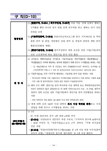 - 140 %uad6c %uc9c1(D-10)%ud65c%ub3d9%ubc94%uc704%u274d (%uc77c%ubc18%uad6c%uc9c1,D-10-1/%ucd5c%uc6b0%uc218%uc778%uc7ac,D-10-T)%uad6d%ub0b4 %uae30%uc5c5%u2024%ub2e8%uccb4 %ub4f1%uc5d0%uc11c %ud589%ud558%ub294 %uad6c%uc9c1%ud65c%ub3d9 %ubfd0%ub9cc %uc544%ub2c8%ub77c%uc815%uc2dd %ucde8%uc5c5 %uc804%uc5d0 %uc5f0%uc218%ube44%ub97c %ubc1b%uace0 %ud589%ud558%ub294 %ub2e8%uae30 %uc778%ud134%uacfc%uc815%uc744 %ud3ec%ud568%u274d (%uae30%uc220%ucc3d%uc5c5%uc900%ube44,D-10-2)%ucc3d%uc5c5%uc774%ubbfc%uad50%uc721%ud504%ub85c%uadf8%ub7a8 %ucc38%uac00,%uc9c0%uc2dd%uc7ac%uc0b0%uad8c %ub4f1 %ud2b9%ud5c8%ucd9c%uc6d0 %uc900%ube44 %ubc0f %ucd9c%uc6d0,%ucc3d%uc5c5%ubc95%uc778 %uc124%ub9bd %uc900%ube44 %ub4f1 %ucc3d%uc5c5%uacfc %uad00%ub828%ub41c %uc81c%ubc18 %uc900%ube44%ud65c%ub3d9(%uc778%ud134%ud65c%ub3d9 %uc81c%ud55c)%u274d (%ucca8%ub2e8%uae30%uc220%uc778%ud134,D-10-3)%ubc95%ubb34%ubd80%uc7a5%uad00%uc774 %uc815%ud55c %uc694%uac74%uc744 %uac16%ucd98 %uae30%uc5c5(%uae30%uad00)%uacfc%uc758%uc778%ud134 %uadfc%ub85c%uacc4%uc57d%uc5d0 %ub530%ub978 %ucca8%ub2e8%uae30%uc220 %ubd84%uc57c %uc778%ud134 %ud65c%ub3d9%ud574%ub2f9%uc790%u274d %uad50%uc218(E-1)%u318d%ud68c%ud654%uc9c0%ub3c4(E-2)%u318d%uc5f0%uad6c(E-3)%u318d%uae30%uc220%uc9c0%ub3c4(E-4)%u318d%uc804%ubb38%uc9c1%uc5c5(E-5)%u318d%uc608%uc220%ud765%ud589(E-6)*%u2024%ud2b9%uc815%ud65c%ub3d9(E-7)%uc790%uaca9%uc5d0 %ud574%ub2f9%ud558%ub294 %ubd84%uc57c%uc5d0 %ucde8%uc5c5%ud558%uae30 %uc704%ud574 %uc5f0%uc218%ub098 %uad6c%uc9c1%ud65c%ub3d9%uc744 %ud558%ub824%ub294 %uc0ac%ub78c*%ub2e8,%uc608%uc220%ud765%ud589(E-6)%uc790%uaca9%uc911%uc720%ud765%uc5c5%uc18c%ub4f1%uc758%ud765%ud589%ud65c%ub3d9(E-6-2)%uc740%uc81c%uc678%ud558%uace0,%uc21c%uc218%uc608%uc220%ubc0f%uc2a4%ud3ec%uce20%ubd84%uc57c%ub9cc%ud5c8%uc6a9,E-7 %uc790%uaca9 %uc911 %uc900%uc804%ubb38%uc778%ub825%uacfc %uc219%ub828%uae30%ub2a5%uc778%ub825%uc740%ud574%uc678%uc2e0%uccad %ubd88%uac00%u274d%uae30%uc5c5%ud22c%uc790(D-8)%uc790%uaca9 %u2018%ub2e4%u2019%ubaa9*%uc5d0 %ud574%ub2f9%ud558%ub294 %uae30%uc220%ucc3d%uc5c5 %uc900%ube44 %ub4f1%uc744 %ud558%ub824%ub294 %uc0ac%ub78c*%ud559%uc0ac%uc774%uc0c1%uc758%ud559%uc704%ub97c%uac00%uc9c4%uc0ac%ub78c%uc73c%ub85c%uc11c%uc9c0%uc2dd%uc7ac%uc0b0%uad8c%uc744%ubcf4%uc720%ud558%uac70%ub098%uc774%uc5d0%uc900%ud558%ub294%uae30%uc220%uac00%uc9c4%uc0ac%ub78c%uc911%ubc95%ubb34%ubd80%uc7a5%uad00%uc774%uc778%uc815%ud55c%ubc95%uc778%ucc3d%uc5c5%uc790(%uae30%uc220%ucc3d%uc5c5%uc774%ubbfc%uc790)%u274d %ud574%uc678 %uc6b0%uc218 %ub300%ud559*%ucca8%ub2e8%uae30%uc220 %ubd84%uc57c %ud559%uc0ac%uacfc%uc815 %uc774%uc0c1 %uc7ac%ud559%uc0dd %ub610%ub294 %ud559%uc704%ucde8%ub4dd%uc77c%ub85c%ubd80%ud130 3%ub144%uc774 %uacbd%uacfc%ub418%uc9c0 %uc54a%uc740 %uc878%uc5c5%uc0dd%uc73c%ub85c %ub9cc 30%uc138 %ubbf8%ub9cc%uc73c%ub85c(%uc11d%uc0ac %uc774%uc0c1 :%ub9cc 35%uc138),%ubc95%ubb34%ubd80%uc7a5%uad00%uc774 %uc815%ud55c %uc694%uac74%uc744 %uac16%ucd98 %uae30%uc5c5(%uae30%uad00)%uc5d0%uc11c %ucca8%ub2e8%uae30%uc220 %ubd84%uc57c %uc778%ud134%ud65c%ub3d9%uc744 %ud558%ub824%ub294 %uc0ac%ub78c*%uc138%uacc4%ub300%ud559%uc21c%uc704THE200%uc704,QS500%uc704%uc774%ub0b4%ud574%uc678%ub300%ud559(%ubcf8%uad50%ub9cc%ud574%ub2f9)%u274d %uc138%uacc4 %ub300%ud559 %uc21c%uc704 100%uc704 %uc774%ub0b4 %ub300%ud559%uc758 %uc11d%uc0ac %uc774%uc0c1 %ud559%uc704%ub97c %ucde8%ub4dd%ud558%uace0 %uad6d%ub0b4 %ucde8%uc5c5%uc744 %uc704%ud574 %uc5f0%uc218%ub098 %uad6c%uc9c1%ud65c%ub3d9%uc744 %ud558%ub824%ub294 %uc0ac%ub78c1%ud68c%uc5d0%ubd80%uc5ec%ud560%uc218%uc788%ub294%uccb4%ub958%uae30%uac04%uc0c1%ud55c%u274d 1%ub144-%ub2e8,%uc544%ub798 %ub300%uc0c1%uc790%uc758 %uacbd%uc6b0 1%ud68c %ucd5c%ub300 6%uac1c%uc6d4 %ubd80%uc5ec%u2219(D-10-1)%u2460%uc694%uc591%ubcf4%ud638%uc0ac %uc804%ubb38%uc5f0%uc218 %uacfc%uc815 %uc218%ub8cc%uc790,%u2461%uad6c%uc9c1%ube44%uc790 %uc810%uc218%uc81c 60%uc810%uc774%uc0c1 ~80%uc810 %ubbf8%ub9cc%uc778 %uc790,%u2462%uc804%ubb38%uc9c1%uc885(E-1~E-7)%uadfc%ubb34 %uacbd%ub825%uc790,%u2463%uc8fc%ud55c %uc678%uad6d%uacf5%uad00 %uc778%ud134 %uc9c1%uc6d0%u2219(D-10-2)%u2460%ucc3d%uc5c5%uc774%ubbfc%uc885%ud569%uc9c0%uc6d0%uc2dc%uc2a4%ud15c(OASIS)%uc911 1%uac1c %uc774%uc0c1 %uacfc%uc815 %uc774%uc218%uc790(%ucc38%uc5ec%uc911%uc778%uc790 %ud3ec%ud568),%u2461%ucc3d%uc5c5%uc774%ubbfc %uc810%uc218%uc81c %u2018%ud544%uc218%ud56d%ubaa9%u2019%uc911 1%uac1c %uc774%uc0c1 %ud574%ub2f9%uc790