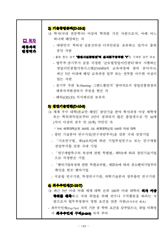 - 143 %uf000%ubaa9%ucc28%uccb4%ub958%uc790%uaca9%ubcc0%uacbd%ud5c8%uac002)%uae30%uc220%ucc3d%uc5c5%uc900%ube44(D-10-2)%u274d%ud559%uc0ac(%uad6d%ub0b4 %uc804%ubb38%ud559%uc0ac) %uc774%uc0c1%uc758 %ud559%uc704%ub97c %uac00%uc9c4 %uc0ac%ub78c%uc73c%ub85c%uc11c, %uc544%ub798 %uc5b4%ub290 %ud558%ub098%uc5d0 %ud574%ub2f9%ud558%ub294 %uc790-%ub300%ud55c%ubbfc%uad6d %ud2b9%ud5c8%uad8c%u2027%uc2e4%uc6a9%uc2e0%uc548%uad8c%u2027%ub514%uc790%uc778%uad8c%uc744 %ubcf4%uc720%ud558%uace0 %uc788%uac70%ub098 %ucd9c%uc6d0 %uc911%uc778 %uc0ac%ub78c*%ucd9c%uc6d0%uc911%uc778%uacbd%uc6b0%u2018%ucd9c%uc6d0%uc0ac%uc2e4%uc99d%uba85%uc6d0%u2019%uc758%uc2ec%uc0ac%uccad%uad6c%uc720%ubb34%ub780%u2018Y%u2019%ub85c%uae30%uc7ac%ub41c%uacbd%uc6b0%ub300%uc0c1-%ubc95%ubb34%ubd80%u00b7%uc911%uae30%ubd80%uac00 %uacf5%ub3d9 %uc9c0%uc815%ud55c %u2018%uae00%ub85c%ubc8c%ucc3d%uc5c5%uc774%ubbfc%uc13c%ud130%u2019%uc5d0%uc11c %uc2dc%ud589%ud558%ub294%ucc3d%uc5c5%uc774%ubbfc%uc885%ud569%uc9c0%uc6d0%uc2dc%uc2a4%ud15c(OASIS)%uc758 %uad50%uc721%uacfc%uc815%uc5d0 %ucc38%uc5ec %uc911%uc774%uac70%ub098,%ucd5c%uadfc 3%ub144 %uc774%ub0b4%uc5d0 %ud574%ub2f9 %uad50%uc721%uacfc%uc815 %uc77c%ubd80 %ub610%ub294 %uc804%ubd80%ub97c %uc774%uc218%ud55c %uc0ac%uc2e4%uc774%uc788%ub294 %uc0ac%ub78c-%uc911%uae30%ubd80 %uc8fc%uad00 %u2018K-Startup%uadf8%ub79c%ub4dc%ucc4c%ub9b0%uc9c0%u2019%ucc38%uc5ec%uc790%ub85c%uc11c %ucc3d%uc5c5%uc9c4%ud765%uc6d0%uc7a5%uc758%uccb4%ub958%uc790%uaca9%ubcc0%uacbd%ud5c8%uac00 %ucd94%ucc9c%uc744 %ubc1b%uc740 %uc790-%ud574%uc678(OECD)%uc9c0%uc2dd%uc7ac%uc0b0%uad8c %ubcf4%uc720%uc790 3)%ucca8%ub2e8%uae30%uc220%uc778%ud134(D-10-3)%u274d%uc138%uacc4 %uc6b0%uc218 %ub300%ud559(%ubcf8%uad50%ub9cc %ud574%ub2f9)*%ucca8%ub2e8%uae30%uc220 %ubd84%uc57c %ud559%uc0ac%uacfc%uc815 %uc774%uc0c1 %uc7ac%ud559%uc0dd%ub610%ub294 %ud559%uc704%ucde8%ub4dd%uc77c%ub85c%ubd80%ud130 3%ub144%uc774 %uacbd%uacfc%ub418%uc9c0 %uc54a%uc740 %uc878%uc5c5%uc0dd%uc73c%ub85c %ub9cc 30%uc138(%uc11d%uc0ac %uc774%uc0c1%uc758 %uacbd%uc6b0 %ub9cc 35%uc138)%ubbf8%ub9cc%uc778 %uc790 * THE %uc138%uacc4%ub300%ud559%uc21c%uc704 200%uc704, QS %uc138%uacc4%ub300%ud559%uc21c%uc704 500%uc704 %uc774%ub0b4 %ub300%ud559-%ucca8%ub2e8 %uae30%uc220%ubd84%uc57c %uc5f0%uad6c%uc2dc%uc124(%uc5f0%uad6c%uc804%ub2f4%ubd80%uc11c)%uc744 %uac16%ucd98 %uad6d%ub0b4 %uc0c1%uc7a5%uae30%uc5c5-%u300c%uae30%ucd08%uc5f0%uad6c%ubc95%u300d%uc81c14%uc870%uc7582%uc5d0 %ub530%ub978 %uae30%uc5c5%ubd80%uc124%uc5f0%uad6c%uc18c %ub610%ub294 %uc5f0%uad6c%uac1c%ubc1c %uc804%ub2f4%ubd80%uc11c%ub97c %uac16%ucd98 %uad6d%ub0b4 %uae30%uc5c5-%u300c%uc5f0%uad6c%uac1c%ubc1c%ud2b9%uad6c%uc758 %uc721%uc131%uc5d0 %uad00%ud55c %ud2b9%ubcc4%ubc95%u300d%uc81c9%uc870%uc5d0 %ub530%ub77c %ucca8%ub2e8%uae30%uc220%uae30%uc5c5%uc73c%ub85c %uc9c0%uc815%ubc1b%uc740 %uae30%uc5c5-%u300c%ubca4%ucc98%uae30%uc5c5%uc721%uc131%uc5d0 %uad00%ud55c %ud2b9%ubcc4%uc870%uce58%ubc95%u300d%uc81c25%uc870%uc5d0 %ub530%ub77c %uc911%uc18c%ubca4%ucc98%uae30%uc5c5%ubd80%uc758%ud655%uc778%uc744 %ubc1b%uc740 %ubca4%ucc98%uae30%uc5c5 -%uad6d%uacf5%ub9bd %uc5f0%uad6c%uae30%uad00,%ud2b9%uc815%uc5f0%uad6c%uae30%uad00,%uacfc%ud559%uae30%uc220%ubd84%uc57c %uc815%ubd80%ucd9c%uc5f0 %uc5f0%uad6c%uae30%uad00 4)%ucd5c%uc6b0%uc218%uc778%uc7ac(D-10-T)%u274d%ucd5c%uadfc 5%ub144 %uc774%ub0b4 %uc544%ub798 %uc138%uacc4 %ub300%ud559 %uc21c%uc704 100%uc704 %uc774%ub0b4 %ub300%ud559%uc758 %uc11d%uc0ac %uc774%uc0c1 %ud559%uc704%ub97c%ucde8%ub4dd%ud558%uace0 %uad6d%ub0b4 %ucde8%uc5c5%uc744 %uc704%ud574 %uc5f0%uc218%ub098 %uad6c%uc9c1%ud65c%ub3d9%uc744 %ud558%ub824%ub294 %uc0ac%ub78c%uc73c%ub85c%uc11c %ubc95%ubb34%ubd80%uc7a5%uad00%uc774 %uc815%ud55c %uc694%uac74%uc744 %uac16%ucd98 %uc0ac%ub78c(%ubd80%ucc98%ucd94%ucc9c %ubd88%uc694)-%ucd5c%uc6b0%uc218%uc778%uc7ac(Top-Tier)%uc790%uaca9 %uae30%uc900 %uc911 %ud559%ub825 %uc694%uac74%uc744 %uac16%ucd94%uc5c8%uc73c%ub098,%ucde8%uc5c5 %ubbf8%ud655%uc815%uc2dc %ucd5c%uc6b0%uc218%uc778%uc7ac %uad6c%uc9c1(D-10-T)%uc790%uaca9 %ubd80%uc5ec
