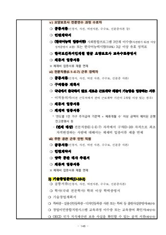 - 148 %u2174) %uc694%uc591%ubcf4%ud638%uc0ac %uc804%ubb38%uc5f0%uc218 %uacfc%uc815 %uc218%ub8cc%uc790%u274d %uacf5%ud1b5%uc11c%ub958(%uc2e0%uccad%uc11c, %uc0ac%uc9c4, %uc5ec%uad8c%uc0ac%ubcf8, %uc218%uc218%ub8cc, %uc2e0%ubd84%uc99d%uc0ac%ubcf8 %ub4f1)%u274d %uc778%ud134%uacc4%uc57d%uc11c%u274d (%ud55c%uad6d%uc5b4%ub2a5%ub825 %uc785%uc99d%uc11c%ub958)%uc0ac%ud68c%ud1b5%ud569%ud504%ub85c%uadf8%ub7a8 3%ub2e8%uacc4 %uc774%uc218%uc99d(%uc0ac%uc804%ud3c9%uac00 61%uc810 %uc774%uc0c1%uc131%uc801%uc99d%uba85%uc11c %ud3ec%ud568)%ub610%ub294 %ud55c%uad6d%uc5b4%ub2a5%ub825%uc2dc%ud5d8(TOPIK)3%uae09 %uc774%uc0c1 %uc720%ud6a8 %uc131%uc801%ud45c%u274d %ud55c%uad6d%ubcf4%uac74%ubcf5%uc9c0%uc778%uc7ac%uc6d0 %ubc1c%uae09 %uc694%uc591%ubcf4%ud638%uc0ac %uad50%uc721%uc218%ub8cc%uc99d%uba85%uc11c%u274d %uccb4%ub958%uc9c0 %uc785%uc99d%uc11c%ub958%u203b %uccb4%uc7ac%ube44 %uc785%uc99d%uc11c%ub958 %uc81c%ucd9c %uba74%uc81c %u2175) %uc804%ubb38%uc9c1%uc885(E-1~E-7) %uadfc%ubb34 %uacbd%ub825%uc790%u274d %uacf5%ud1b5%uc11c%ub958(%uc2e0%uccad%uc11c, %uc0ac%uc9c4, %uc5ec%uad8c %uc0ac%ubcf8, %uc218%uc218%ub8cc, %uc2e0%ubd84%uc99d %uc0ac%ubcf8)%u274d %uad6c%uc9c1%ud65c%ub3d9 %uacc4%ud68d%uc11c%u274d %uad6d%ub0b4%uc5d0%uc11c %ucd9c%uad6d%ud558%uc9c0 %uc54a%uace0 %uc0c8%ub85c%uc6b4 %uadfc%ub85c%uacc4%uc57d %uccb4%uacb0%uc774 %uac00%ub2a5%ud568%uc744 %uc785%uc99d%ud558%ub294 %uc11c%ub958- %uc774%uc801%ub3d9%uc758%uc11c(%uc774%uc804 %uadfc%ubb34%ucc98%uc5d0%uc11c %uc794%uc5ec %uadfc%ub85c%uacc4%uc57d %uae30%uac04%uc774 1%uac1c%uc6d4 %uc774%uc0c1 %uc788%ub294 %uacbd%uc6b0)%u274d %uccb4%ub958%uc9c0 %uc785%uc99d%uc11c%ub958%u274d %uccb4%uc7ac%ube44 %uc785%uc99d%uc11c%ub958** %u2018%uc5f0%ub3c4%ubcc4 1%uc778 %uac00%uad6c %uc8fc%uac70%uae09%uc5ec %uae30%uc900%uc561 %u00d7 %uccb4%ub958%uac1c%uc6d4 %uc218%u2019 %uc774%uc0c1 %uae08%uc561%uc774 %uc608%uce58%ub41c %uc740%ud589%uc794%uace0%uc99d%uba85%uc11c %ub4f1 - (%uba74%uc81c %ub300%uc0c1)%uc804%ubb38%uc9c1%uc885(E-1~E-7) %uc790%uaca9%uc5d0%uc11c %uad6c%uc9c1(D-10) %uc790%uaca9%uc73c%ub85c %ucd5c%ucd08 %uc790%uaca9%ubcc0%uacbd%ud558%ub294 %uc0ac%ub78c%uc5d0 %ub300%ud574%uc11c%ub294 %uccb4%uc7ac%ube44 %uc785%uc99d%uc11c%ub958 %uc81c%ucd9c %uba74%uc81c %u2176) %uc8fc%ud55c %uacf5%uad00 %uadfc%ubb34 %uc778%ud134 %uc9c1%uc6d0%u274d %uacf5%ud1b5%uc11c%ub958(%uc2e0%uccad%uc11c, %uc0ac%uc9c4, %uc5ec%uad8c %uc0ac%ubcf8, %uc218%uc218%ub8cc, %uc2e0%ubd84%uc99d %uc0ac%ubcf8)%u274d %uc778%ud134%uacc4%uc57d%uc11c%u274d %uc591%uad6d %uacf5%uad00 %ub300%uc0ac %ucd94%ucc9c%uc11c%u274d %uccb4%ub958%uc9c0 %uc785%uc99d%uc11c%ub958%u203b %uccb4%uc7ac%ube44 %uc785%uc99d%uc11c%ub958 %uc81c%ucd9c %uba74%uc81c 2)%uae30%uc220%ucc3d%uc5c5%uc900%ube44(D-10-2)%u274d %uacf5%ud1b5%uc11c%ub958(%uc2e0%uccad%uc11c, %uc0ac%uc9c4, %uc5ec%uad8c%uc0ac%ubcf8, %uc218%uc218%ub8cc, %uc2e0%ubd84%uc99d%uc0ac%ubcf8)%u274d %ud559%uc0ac(%uad6d%ub0b4 %uc804%ubb38%ud559%uc0ac) %ud559%uc704 %uc774%uc0c1 %ud559%ub825%uc99d%uba85%uc11c%u274d %uae30%uc220%ucc3d%uc5c5%uacc4%ud68d%uc11c%u274d %ud2b9%ud5c8%uc99d%u00b7%uc2e4%uc6a9%uc2e0%uc548%ub4f1%ub85d%uc99d%u00b7%ub514%uc790%uc778%ub4f1%ub85d%uc99d %uc0ac%ubcf8 %ub610%ub294 %ud2b9%ud5c8 %ub4f1 %ucd9c%uc6d0%uc0ac%uc2e4%uc99d%uba85%uc11c(%ud574%ub2f9%uc790)%u274d %ucc3d%uc5c5%uc774%ubbfc%uc885%ud569%uc9c0%uc6d0%uc2dc%uc2a4%ud15c %uad50%uc721%uacfc%uc815 %uc774%uc218%uc99d %ub610%ub294 %uad50%uc721%ucc38%uc5ec %ud655%uc778%uc11c(%ud574%ub2f9%uc790)%u274d OECD %uad6d%uac00 %uc9c0%uc2dd%uc7ac%uc0b0%uad8c %ubcf4%uc720 %uc0ac%uc2e4%uc744 %ud655%uc778%ud560 %uc218 %uc788%ub294 %uacf5%uc801 %uc11c%ub958(%ud574%ub2f9%uc790)