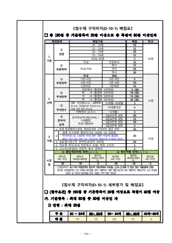 - 150 %u3010%uc810%uc218%uc81c %uad6c%uc9c1%ube44%uc790(D-10-1) %ubc30%uc810%ud45c%u3011%u25a1 %ucd1d 190%uc810 %uc911 %uae30%ubcf8%ud56d%ubaa9%uc774 20%uc810 %uc774%uc0c1%uc73c%ub85c %ucd1d %ub4dd%uc810%uc774 60%uc810 %uc774%uc0c1%uc778%uc790%u3010%uc810%uc218%uc81c %uad6c%uc9c1%ube44%uc790(D-10-1) %uc138%ubd80%ud3c9%uac00 %ubc0f %ubc30%uc810%ud45c%u3011%u25a1(%uc810%uc218%uc694%uac74)%ucd1d 190%uc810 %uc911 %uae30%ubcf8%ud56d%ubaa9%uc774 20%uc810 %uc774%uc0c1%uc73c%ub85c %ub4dd%uc810%uc774 60%uc810 %uc774%uc0c1%uac00. %uae30%ubcf8%ud56d%ubaa9 : %ucd5c%ub300 50%uc810 %uc911 20%uc810 %uc774%uc0c1%uc778 %uc790 1) %uc5f0%ub839 : %ucd5c%ub300 20%uc810%uad6c %ubd8420 ~ 24%uc13825~ 29%uc13830~ 34%uc13835~ 39%uc13840%uc138~49%uc138%ubc30 %uc810101520155%ubc30%uc810%ud56d%ubaa9%ubc30%uc810%uae30%uc900%ubc30%uc810%ube44%uace01. %uae30%ubcf8%u2460%uc5f0%ub83920~ 24%uc1381050%uc81025~ 29%uc1381530~ 34%uc1382035~ 39%uc1381540%uc138~49%uc1385%u2461 %ucd5c%uc885%ud559%ub825%uad6d%ub0b4 %uc804%ubb38%ud559%uc0ac15%uad6d%ub0b4/%uad6d%uc678%ud559%uc0ac15%uc11d%uc0ac20%ubc15%uc0ac302. %uc120%ud0dd%u2460 %ucde8%uc5c5%uacbd%ub825%uad6d%ub0b4%uad6d%uc67870%uc8101%ub144~2%ub1443%ub144~4%ub14453%ub144~4%ub1445%ub144~6%ub144105%ub144%uc774%uc0c17%ub144%uc774%uc0c115%u2461 %uad6d%ub0b4%uc720%ud559%uc804%ubb38%ud559%uc0ac (%uc878%uc5c5%ud6c4 3%ub144%uc774%ub0b4)5 (30)%ud559 %uc0ac (%uc878%uc5c5%ud6c4 3%ub144%uc774%ub0b4)10 (30)%uc11d %uc0ac (%uc878%uc5c5%ud6c4 3%ub144%uc774%ub0b4)15 (30)%ubc15 %uc0ac (%uc878%uc5c5%ud6c4 3%ub144%uc774%ub0b4)20 (30)%u2462 %uad6d%ub0b4%uc5f0%uc218%ub300%ud559 %uc5f0%uad6c%uc0dd(D-2-5), %uad50%ud658%ud559%uc0dd (D-2-6), %uad6d%uacf5%ub9bd%uae30%uad00 %uc5f0%uc218(D-4-2), %uc0ac%uc124 %uae30%uad00 %uc5f0%uc218 (D-4-6)12%uac1c%uc6d4~18%uac1c%uc6d4319%uac1c%uc6d4%uc774%uc0c15%uc5b4%ud559%uc5f0%uc218 (D-4-1)12%uac1c%uc6d4~3%u2463 %ud55c%uad6d%uc5b4%ub2a5%ub825%ud55c%uad6d%uc5b4%ub2a5%ub825%uc2dc%ud5d8(TOPIK) / %uc0ac%ud68c%ud1b5%ud569%ud504%ub85c%uadf8%ub7a8(KIIP)5%uae09/5%ub2e8%uacc4 %uc0c1%ub2f9204%uae09/4%ub2e8%uacc4 %uc0c1%ub2f9153%uae09/3%ub2e8%uacc4 %uc0c1%ub2f9102%uae09/2%ub2e8%uacc4 %uc0c1%ub2f953. %uac00%uc810%u2460 %uad00%uacc4 %uc911%uc559%ud589%uc815%uae30%uad00%uc7a5, %uc7ac%uc678%uacf5%uad00%uc7a5 %uad6c%uc9c1%ube44%uc790 %ubc1c%uae09 %ucd94%ucc9c2070%uc810%u2461 - %uc138%uacc4 %uc6b0%uc218%ub300%ud559 %uc878%uc5c5%uc790(THE 200%ub300, QS 500%ub300)- %uc544%uc2dc%uc544%uad8cQS 1,000%uc704 %uc774%ub0b4 %ud604%uc9c0 %ub300%ud559%uc774%uacf5%uacc4 %uc878%uc5c5%uc0dd20(%ubca0%ud2b8%ub0a8, %uc911%uad6d, %ud0dc%uad6d, %uc77c%ubcf8, %uc778%ub3c4, %uc778%ub3c4%ub124%uc2dc%uc544, %ub9d0%ub808%uc774%uc2dc%uc544, %uc2f1%uac00%ud3ec%ub974, %ud544%ub9ac%ud540)%u2462 %uae00%ub85c%ubc8c%uae30%uc5c5%uadfc%ubb34 %uacbd%ub825%uc790(%ud3ec%ucc9c%uc9c0 500%ub300)20%u2463 %uc774%uacf5%uacc4 %ud559%uc0ac(%uad6d%ub0b4 %uc804%ubb38%ud559%uc0ac %ud3ec%ud568) %ud559%uc704 %uc18c%uc9c0%uc7905%u2464 %uace0%uc18c%ub4dd(5%ub9cc%ub2ec%ub7ec) %uc804%ubb38%uc9c1 %uc885%uc0ac %uacbd%ub825%uc79054.%uac10%uc810%u2460 %ucd9c%uc785%uad6d%uad00%ub9ac%ubc95 %uc704%ubc18(%ub2e8%uc704: %ub9cc %uc6d0)%u2461 %ud615%uc0ac%ucc98%ubc8c %uc804%ub825(%ub2e8%uc704: %ub9cc %uc6d0)%ubc94%uce59%uae08300 %uc774%uc0c1 %ubc94%uce59%uae08100%uc774%uc0c1~300%ubbf8%ub9cc%ubc94%uce59%uae0850%uc774%uc0c1~100%ubbf8%ub9cc%ubc8c%uae08%ud615300 %uc774%uc0c1%ubc8c%uae08%ud615200%uc774%uc0c1~300%ubbf8%ub9cc%ubc8c%uae08%ud615200 %ubbf8%ub9cc-30-10-5-30-10-5%uc2e0%uccad%uc77c%ub85c%ubd80%ud130 5%ub144 %uc774%ub0b4 %ucc98%ubd84%uae08%uc561%uc758 %ud569%uc0b0%uc561 %uae30%uc900(%uacfc%ud0dc%ub8cc %ubbf8%ud3ec%ud568), %u2460%uc640 %u2461%ud56d%ubaa9 %uac04 %ud569%uc0b0 %uc810%uc218 %uc801%uc6a9(%uc911%ubcf5 %uc0b0%uc815)- %u3010%uc8fc%uc758%u3011%uc2e0%uccad%uc77c%ub85c%ubd80%ud130 3%ub144 %uc774%ub0b4%uc5d0 %ubc94%uce59%uae08%uc744 %ubc1b%uc544 %uff62%uccb4%ub958%ud5c8%uac00 %uc81c%ud55c %ud1b5%ud569%uae30%uc900%uff63%uc5d0 %ub530%ub77c %uccb4%ub958%ud5c8%uac00 %uc81c%ud55c%ub418%uac70%ub0983%ub144 %uc774%ub0b4%uc5d0 300%ub9cc %uc6d0 %uc774%uc0c1%uc758 %ubc8c%uae08%ud615%uc744 %ubc1b%uc740 %uc0ac%ub78c%uc740 %uc790%uaca9 %uc81c%ud55c %ub300%uc0c1%uc784