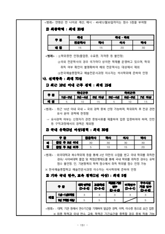 - 151 <%ubc94%ub840> %uc5f0%ub839%uc740 %ub9cc %ub098%uc774%ub85c %uacc4%uc0b0, %uc608%uc2dc - 49%uc13812%uc6d430%uc77c%uae4c%uc9c0%ub294 %uc810%uc218 5%uc810%uc744 %ubd80%uc5ec%ud568 2) %ucd5c%uc885%ud559%ub825 : %ucd5c%ub300 30%uc810%uad6c %ubd84%uad6d%ub0b4%uad6d%ub0b4 %u2024 %uad6d%uc678%uc804%ubb38%ud559%uc0ac%ud559%uc0ac%uc11d%uc0ac%ubc15%uc0ac%ubc30 %uc81015152030<%ubc94%ub840>: %u2460%ud559%uc704%uc99d%ub9cc %uc778%uc815(%uc878%uc5c5%uc99d, %uc218%ub8cc%uc99d, %uc790%uaca9%uc99d %ub4f1 %ubd88%uc778%uc815)%u2461%uad6d%uc678 %uc804%ubb38%ud559%uc0ac%uc758 %uacbd%uc6b0 %uad6d%uac00%ub9c8%ub2e4 %uc0c1%uc774%ud55c %ud559%uc81c%ub97c %uc6b4%uc601%ud558%uace0 %uc788%uc73c%uba70, %ud559%uc704 %ucde8%ub4dd %uc5ec%ubd80 %ud655%uc778%uc774 %ubd88%uba85%ud655%ud558%uc5ec %ud574%uc678 %uc804%ubb38%ud559%uc0ac%ub294 %ub300%uc0c1%uc5d0%uc11c %uc81c%uc678%u2462%ud55c%uad6d%uc608%uc220%uc885%ud569%ud559%uad50 %uc608%uc220%uc804%ubb38%uc0ac%uacfc%uc815 %uc774%uc218%uc790%ub294 %uc11d%uc0ac%ud559%uc704%uc5d0 %uc900%ud558%uc5ec %uc778%uc815%ub098. %uc120%ud0dd%ud56d%ubaa9 : %ucd5c%ub300 70%uc810 1) %ucd5c%uadfc 10%ub144 %uc774%ub0b4 %uadfc%ubb34 %uacbd%ub825 : %ucd5c%ub300 15%uc810%uad6c %ubd84%uad6d%ub0b4%uadfc%ubb34%uad6d%uc678%uadfc%ubb341%ub144~2%ub1443%ub144~4%ub1445%ub144 %uc774%uc0c13%ub144~4%ub1445%ub144~6%ub1447%ub144 %uc774%uc0c1%ubc30 %uc8105101551015<%ubc94%ub840> : %ucd5c%uadfc 10%ub144 %uc774%ub0b4 %uad6d%ub0b4 + %uad6d%uc678 %uacbd%ub825 %uc911%ubcf5 %uc0b0%uc815 %uac00%ub2a5%ud558%uba70, %ud559%uc704%ucde8%ub4dd %ud6c4 %uc804%uacf5 %uad00%ub828%uc720%uc0ac%ubd84%uc57c %uacbd%ub825%uc5d0 %ud55c%uc815%ud568%u261e %uc720%uc0ac%uacbd%ub825 %uc5ec%ubd80%ub294 %uc2e0%uccad%uc790%uac00 %uad00%ub828 %uc99d%ube59%uc11c%ub958%ub97c %uc81c%ucd9c%ud558%uc5ec %uc785%uc99d %uc785%uc99d%ud558%uc5ec%uc57c %ud558%uba70, %uc778%ud134%ub4f1 %uad6c%uc9c1%uacfc%uc815%uc5d0%uc11c%uc758 %uacbd%ub825%uc740 %uc81c%uc678%ud5682) %uad6d%ub0b4 %uc720%ud559(2%ub144 %uc774%uc0c1)%uacbd%ub825 : %ucd5c%ub300 30%uc810%uad6c %ubd84%uc804%ubb38%ud559%uc0ac%ud559%uc0ac%uc11d%uc0ac%ubc15%uc0ac%ubc30 %uc810%uc878%uc5c5 %ud6c4 3%ub144 %uc774%ub0b430 30 3030%uc878%uc5c5 %ud6c4 3%ub144 %uc774%ud6c4 5101520<%ubc94%ub840> : %uc678%uad6d%ub300%ud559%uacfc %ubcf5%uc218%ud559%uc704%uc81c %ub4f1%uc744 %ud1b5%ud574 2%ub144 %ubbf8%ub9cc%uc758 %uc218%uc5c5%uc744 %ubc1b%uace0 %uad6d%ub0b4 %ud559%uc704%ub97c %ucde8%ub4dd%ud55c %uacbd%uc6b0/ %uc0ac%uc774%ubc84%ub300%ud559 %uc878%uc5c5 %ubc0f %ud559%uc810%uc740%ud589%uc81c%ub3c4%ub97c %ud1b5%ud574 %uad6d%ub0b4 %ud559%uc704%ub97c %ucde8%ub4dd%ud55c %uacbd%uc6b0%ub294 %uc720%ud559%uc810%uc218 %ubd88%uc778%uc815. %ub2e8, %uae30%ubcf8%ud56d%ubaa9%uc758 %ud559%ub825 %uc810%uc218%uc5d0%uc11c %ucde8%ub4dd %ud559%uc704%ubcc4 %uc810%uc218 %uc778%uc815 %uac00%ub2a5%u203b %ud55c%uad6d%uc608%uc220%uc885%ud569%ud559%uad50 %uc608%uc220%uc804%ubb38%uc0ac%uacfc%uc815 %uc774%uc218%uc790%ub294 %uc11d%uc0ac%ud559%uc704%uc5d0 %uc900%ud558%uc5ec %uc778%uc815 3) %uae30%ud0c0 %uad6d%ub0b4 %uc5f0%uc218, %uad50%uc721 %uacbd%ub825(1%ub144 %uc774%uc0c1) : %ucd5c%ub300 5%uc810 %uad6c %ubd84%ub300%ud559 %uc5f0%uad6c%uc0dd(D-2-5)%uad50%ud658%ud559%uc0dd(D-2-6) %uad6d%uacf5%ub9bd %uae30%uad00 %uc5f0%uc218(D-4-2)%uc5b4%ud559%uc5f0%uc218(D-4-1)%uc6b0%uc218%uc0ac%uc124 %uae30%uad00 %uc5f0%uc218 (D-4-6)%ubc30%uc8101%ub144~1%ub1446%uac1c%uc6d4333331%ub144 7%uac1c%uc6d4 %uc774%uc0c15555<%ubc94%ub840> : %ub300%ud559, %uae30%uad00 %ub4f1%uc5d0%uc11c %uc5f0%uc218%uae30%uac04%uc744 %uae30%uc7ac%ud558%uc5ec %ubc1c%uae09%ud55c %uacbd%ub825, %uc774%ub825, %uc774%uc218%uc99d %ub4f1%uc73c%ub85c %uc694%uac74 %uc785%uc99d %u203b %ucd5c%uc885 %ud559%ub825%uacfc %uad6d%ub0b4 %uc5f0%uc218, %uad50%uc721, %ud559%ub825%uc740 %uae30%uac04%uc694%uac74%uc744 %ucda9%uc871%ud560 %uacbd%uc6b0 %uc911%ubcf5 %uc801%uc6a9 %uac00%ub2a5