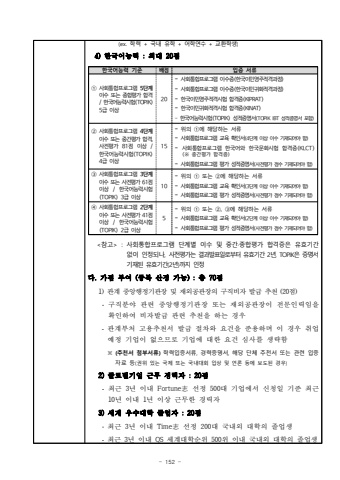 - 152 (ex. %ud559%ub825 + %uad6d%ub0b4%uc720%ud559 + %uc5b4%ud559%uc5f0%uc218 + %uad50%ud658%ud559%uc0dd) 4) %ud55c%uad6d%uc5b4%ub2a5%ub825 : %ucd5c%ub300 20%uc810%ud55c%uad6d%uc5b4%ub2a5%ub825 %uae30%uc900%ubc30%uc810%uc785%uc99d %uc11c%ub958%u2460 %uc0ac%ud68c%ud1b5%ud569%ud504%ub85c%uadf8%ub7a8 5%ub2e8%uacc4%uc774%uc218 %ub610%ub294 %uc885%ud569%ud3c9%uac00 %ud569%uaca9/ %ud55c%uad6d%uc5b4%ub2a5%ub825%uc2dc%ud5d8(TOPIK)5%uae09 %uc774%uc0c120- %uc0ac%ud68c%ud1b5%ud569%ud504%ub85c%uadf8%ub7a8 %uc774%uc218%uc99d(%ud55c%uad6d%uc774%ubbfc%uc601%uc8fc%uc801%uaca9%uacfc%uc815)- %uc0ac%ud68c%ud1b5%ud569%ud504%ub85c%uadf8%ub7a8 %uc774%uc218%uc99d(%ud55c%uad6d%uc774%ubbfc%uadc0%ud654%uc801%uaca9%uacfc%uc815)- %ud55c%uad6d%uc774%ubbfc%uc601%uc8fc%uc801%uaca9%uc2dc%ud5d8 %ud569%uaca9%uc99d(KIPRAT)- %ud55c%uad6d%uc774%ubbfc%uadc0%ud654%uc801%uaca9%uc2dc%ud5d8 %ud569%uaca9%uc99d(KINAT)-%ud55c%uad6d%uc5b4%ub2a5%ub825%uc2dc%ud5d8(TOPIK) %uc131%uc801%uc99d%uba85%uc11c(TOPIK IBT %uc131%uc801%uc99d%uba85%uc11c %ud3ec%ud568)%u2461 %uc0ac%ud68c%ud1b5%ud569%ud504%ub85c%uadf8%ub7a8 4%ub2e8%uacc4%uc774%uc218 %ub610%ub294 %uc911%uac04%ud3c9%uac00 %ud569%uaca9,%uc0ac%uc804%ud3c9%uac00 81%uc810 %uc774%uc0c1 / %ud55c%uad6d%uc5b4%ub2a5%ub825%uc2dc%ud5d8(TOPIK) 4%uae09 %uc774%uc0c115- %uc704%uc758 %u2460%uc5d0 %ud574%ub2f9%ud558%ub294 %uc11c%ub958- %uc0ac%ud68c%ud1b5%ud569%ud504%ub85c%uadf8%ub7a8 %uad50%uc721 %ud655%uc778%uc11c(4%ub2e8%uacc4 %uc774%uc0c1 %uc774%uc218 %uae30%uc7ac%ub418%uc5b4%uc57c %ud568)- %uc0ac%ud68c%ud1b5%ud569%ud504%ub85c%uadf8%ub7a8 %ud55c%uad6d%uc5b4%uc640 %ud55c%uad6d%ubb38%ud654%uc2dc%ud5d8 %ud569%uaca9%uc99d(KLCT)(%u203b %uc911%uac04%ud3c9%uac00 %ud569%uaca9%uc99d)- %uc0ac%ud68c%ud1b5%ud569%ud504%ub85c%uadf8%ub7a8 %ud3c9%uac00 %uc131%uc801%uc99d%uba85%uc11c(%uc0ac%uc804%ud3c9%uac00 %uc810%uc218 %uae30%uc7ac%ub418%uc5b4%uc57c %ud568)%u2462 %uc0ac%ud68c%ud1b5%ud569%ud504%ub85c%uadf8%ub7a8 3%ub2e8%uacc4%uc774%uc218 %ub610%ub294 %uc0ac%uc804%ud3c9%uac00 61%uc810%uc774%uc0c1 / %ud55c%uad6d%uc5b4%ub2a5%ub825%uc2dc%ud5d8(TOPIK) 3%uae09 %uc774%uc0c110- %uc704%uc758 %u2460 %ub610%ub294 %u2461%uc5d0 %ud574%ub2f9%ud558%ub294 %uc11c%ub958- %uc0ac%ud68c%ud1b5%ud569%ud504%ub85c%uadf8%ub7a8 %uad50%uc721 %ud655%uc778%uc11c(3%ub2e8%uacc4 %uc774%uc0c1 %uc774%uc218 %uae30%uc7ac%ub418%uc5b4%uc57c %ud568)- %uc0ac%ud68c%ud1b5%ud569%ud504%ub85c%uadf8%ub7a8 %ud3c9%uac00 %uc131%uc801%uc99d%uba85%uc11c(%uc0ac%uc804%ud3c9%uac00 %uc810%uc218 %uae30%uc7ac%ub418%uc5b4%uc57c %ud568)%u2463%uc0ac%ud68c%ud1b5%ud569%ud504%ub85c%uadf8%ub7a8 2%ub2e8%uacc4%uc774%uc218 %ub610%ub294 %uc0ac%uc804%ud3c9%uac00 41%uc810%uc774%uc0c1 / %ud55c%uad6d%uc5b4%ub2a5%ub825%uc2dc%ud5d8(TOPIK) 2%uae09 %uc774%uc0c15- %uc704%uc758 %u2460 %ub610%ub294 %u2461, %u2462%uc5d0 %ud574%ub2f9%ud558%ub294 %uc11c%ub958- %uc0ac%ud68c%ud1b5%ud569%ud504%ub85c%uadf8%ub7a8 %uad50%uc721 %ud655%uc778%uc11c(2%ub2e8%uacc4 %uc774%uc0c1 %uc774%uc218 %uae30%uc7ac%ub418%uc5b4%uc57c %ud568)%uc0ac%ud68c%ud1b5%ud569%ud504%ub85c%uadf8%ub7a8 %ud3c9%uac00 %uc131%uc801%uc99d%uba85%uc11c(%uc0ac%uc804%ud3c9%uac00 %uc810%uc218 %uae30%uc7ac%ub418%uc5b4%uc57c %ud568)<%ucc38%uace0> : %uc0ac%ud68c%ud1b5%ud569%ud504%ub85c%uadf8%ub7a8 %ub2e8%uacc4%ubcc4 %uc774%uc218 %ubc0f %uc911%uac04%u00b7%uc885%ud569%ud3c9%uac00 %ud569%uaca9%uc99d%uc740 %uc720%ud6a8%uae30%uac04 %uc5c6%uc774 %uc778%uc815%ub418%ub098,%uc0ac%uc804%ud3c9%uac00%ub294 %uacb0%uacfc%ubc1c%ud45c%uc77c%ub85c%ubd80%ud130 %uc720%ud6a8%uae30%uac04 2%ub144, TOPIK%uc740 %uc99d%uba85%uc11c%uae30%uc7ac%ub41c %uc720%ud6a8%uae30%uac04(2%ub144)%uae4c%uc9c0 %uc778%uc815%ub2e4. %uac00%uc810 %ubd80%uc5ec (%uc911%ubcf5 %uc0b0%uc815 %uac00%ub2a5) : %ucd1d 70%uc810 1) %uad00%uacc4 %uc911%uc559%ud589%uc815%uae30%uad00%uc7a5 %ubc0f %uc7ac%uc678%uacf5%uad00%uc7a5%uc758 %uad6c%uc9c1%ube44%uc790 %ubc1c%uae09 %ucd94%ucc9c (20%uc810)-%uad6c%uc9c1%ubd84%uc57c %uad00%ub828 %uc911%uc559%ud589%uc815%uae30%uad00%uc7a5 %ub610%ub294 %uc7ac%uc678%uacf5%uad00%uc7a5%uc774 %uc804%ubb38%uc778%ub825%uc784%uc744 %ud655%uc778%ud558%uc5ec %ube44%uc790%ubc1c%uae09 %uad00%ub828 %ucd94%ucc9c%uc744 %ud558%ub294 %uacbd%uc6b0-%uad00%uacc4%ubd80%ucc98 %uace0%uc6a9%ucd94%ucc9c%uc11c %ubc1c%uae09 %uc808%ucc28%uc640 %uc694%uac74%uc744 %uc900%uc6a9%ud558%uba70 %uc774 %uacbd%uc6b0 %ucde8%uc5c5%uc608%uc815 %uae30%uc5c5%uc774 %uc5c6%uc73c%ubbc0%ub85c %uae30%uc5c5%uc5d0 %ub300%ud55c %uc694%uac74 %uc2ec%uc0ac%ub97c %uc0dd%ub7b5%ud568%u203b (%ucd94%ucc9c%uc11c %ucca8%ubd80%uc11c%ub958) %ud559%ub825%uc785%uc99d%uc11c%ub958, %uacbd%ub825%uc99d%uba85%uc11c, %ud574%ub2f9 %ub2e8%uccb4 %ucd94%ucc9c%uc11c %ub610%ub294 %uad00%ub828 %uc785%uc99d%uc790%ub8cc %ub4f1(%uad8c%uc704 %uc788%ub294 %uad6d%uc81c %ub610%ub294 %uad6d%ub0b4%ub300%ud68c %uc785%uc0c1 %ubc0f %uc5b8%ub860 %ub4f1%uc5d0 %ubcf4%ub3c4%ub41c %uacbd%uc6b0) 2) %uae00%ub85c%ubc8c%uae30%uc5c5 %uadfc%ubb34 %uacbd%ub825%uc790 : 20%uc810 -%ucd5c%uadfc 3%ub144 %uc774%ub0b4 Fortune%u5fd7 %uc120%uc815 500%ub300 %uae30%uc5c5%uc5d0%uc11c %uc2e0%uccad%uc77c %uae30%uc900 %ucd5c%uadfc10%ub144 %uc774%ub0b4 1%ub144 %uc774%uc0c1 %uadfc%ubb34%ud55c %uacbd%ub825%uc790 3) %uc138%uacc4 %uc6b0%uc218%ub300%ud559 %uc878%uc5c5%uc790 : 20%uc810 -%ucd5c%uadfc 3%ub144 %uc774%ub0b4 Time%u5fd7 %uc120%uc815 200%ub300 %uad6d%ub0b4%uc678 %ub300%ud559%uc758 %uc878%uc5c5%uc0dd-%ucd5c%uadfc 3%ub144 %uc774%ub0b4 QS %uc138%uacc4%ub300%ud559%uc21c%uc704 500%uc704 %uc774%ub0b4 %uad6d%ub0b4%uc678 %ub300%ud559%uc758 %uc878%uc5c5%uc0dd