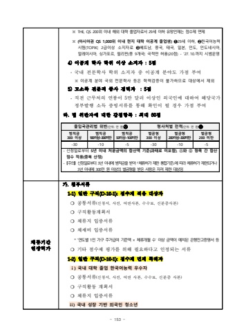- 153 %u203b THE, QS 200%uc704 %uc774%ub0b4 %ud574%uc678 %ub300%ud559 %uc878%uc5c5%uc790%ub85c%uc11c 29%uc138 %uc774%ud558 %uc720%ub9dd%uc778%uc7ac%ub294 %uc810%uc218%uc81c %uba74%uc81c %u203b (%uc544%uc2dc%uc544%uad8c QS 1,000%uc704 %uc774%ub0b4 %ud604%uc9c0 %ub300%ud559 %uc774%uacf5%uacc4 %uc878%uc5c5%uc0dd) %u278a29%uc138 %uc774%ud558, %u278b%ud55c%uad6d%uc5b4%ub2a5%ub825%uc2dc%ud5d8(TOPIK) 2%uae09%uc774%uc0c1 %uc18c%uc9c0%uc790%ub85c %u278c%ubca0%ud2b8%ub0a8, %uc911%uad6d, %ud0dc%uad6d, %uc77c%ubcf8, %uc778%ub3c4, %uc778%ub3c4%ub124%uc2dc%uc544, %ub9d0%ub808%uc774%uc2dc%uc544, %uc2f1%uac00%ud3ec%ub974, %ud544%ub9ac%ud540(%ucd1d 9%uac1c%uad6d) %uad6d%uc801%ub9cc %ud5c8%uc6a9(20%uc810) - %u201827.10.%uae4c%uc9c0 %uc2dc%ubc94%uc6b4%uc601 4) %uc774%uacf5%uacc4 %ud559%uc0ac %ud559%uc704 %uc774%uc0c1 %uc18c%uc9c0%uc790 : 5%uc810 -%uad6d%ub0b4 %uc804%ubb38%ud559%uc0ac %ud559%uc704 %uc18c%uc9c0%uc790 %uc911 %uc774%uacf5%uacc4 %ubd84%uc57c%ub3c4 %uac00%uc810 %ubd80%uc5ec%u203b %uc774%uacf5%uacc4 %ubd84%uc57c %uad6d%uc678 %uc804%ubb38%ud559%uc0ac %ub4f1%uc740 %ud559%ub825%uac80%uc99d%uc774 %ubd88%uac00%ud558%ubbc0%ub85c %ub300%uc0c1%uc5d0%uc11c %uc81c%uc678 5) %uace0%uc18c%ub4dd %uc804%ubb38%uc9c1 %uc885%uc0ac %uacbd%ub825%uc790 : 5%uc810 -%uc9c1%uc804 %uadfc%ubb34%ucc98%uc758 %uc5f0%ubd09%uc774 5%ub9cc %ub2ec%ub7ec %uc774%uc0c1%uc778 %uc678%uad6d%uc778%uc5d0 %ub300%ud558%uc5ec %ud574%ub2f9%uad6d%uac00%uc815%ubd80%ubc1c%ud589 %uc18c%ub4dd %uc99d%ube59%uc11c%ub958%ub97c %ud1b5%ud574 %ud655%uc778%uc774 %ub420 %uacbd%uc6b0 %uac00%uc810 %ubd80%uc5ec%ub77c. %ubc95 %uc704%ubc18%uc790%uc5d0 %ub300%ud55c %uac10%uc810%ud56d%ubaa9 : %ucd5c%ub300 60%uc810%ucd9c%uc785%uad6d%uad00%ub9ac%ubc95 %uc704%ubc18(%ub2e8%uc704: %ub9cc %uc6d0)%u24b6%ud615%uc0ac%ucc98%ubc8c %uc804%ub825(%ub2e8%uc704: %ub9cc %uc6d0)%u24b7%ubc94%uce59%uae08300 %uc774%uc0c1 %ubc94%uce59%uae08100%uc774%uc0c1~300%ubbf8%ub9cc%ubc94%uce59%uae0850%uc774%uc0c1~100%ubbf8%ub9cc%ubc8c%uae08%ud615300 %uc774%uc0c1%ubc8c%uae08%ud615200%uc774%uc0c1~300%ubbf8%ub9cc%ubc8c%uae08%ud615200 %ubbf8%ub9cc-30-10-5-30-10-5-%uc2e0%uccad%uc77c%ub85c%ubd80%ud130 5%ub144 %uc774%ub0b4 %ucc98%ubd84%uae08%uc561%uc758 %ud569%uc0b0%uc561 %uae30%uc900(%uacfc%ud0dc%ub8cc %ubbf8%ud3ec%ud568),%u24b6%uc640 %u24b7 %ud56d%ubaa9 %uac04 %ud569%uc0b0 %uc810%uc218 %uc801%uc6a9(%uc911%ubcf5 %uc0b0%uc815)%u3010%uc8fc%uc758%u3011%uc2e0%uccad%uc77c%ub85c%ubd80%ud130 3%ub144 %uc774%ub0b4%uc5d0 %ubc94%uce59%uae08%uc744 %ubc1b%uc544 %uff62%uccb4%ub958%ud5c8%uac00 %uc81c%ud55c %ud1b5%ud569%uae30%uc900%uff63%uc5d0 %ub530%ub77c %uccb4%ub958%ud5c8%uac00 %uc81c%ud55c%ub418%uac70%ub0983%ub144 %uc774%ub0b4%uc5d0 300%ub9cc %uc6d0 %uc774%uc0c1%uc758 %ubc8c%uae08%ud615%uc744 %ubc1b%uc740 %uc0ac%ub78c%uc740 %uc790%uaca9 %uc81c%ud55c %ub300%uc0c1%uc784%uc5f0%uc7a5%ud5c8%uac00%uac00.%ucca8%ubd80%uc11c%ub9581-1)%uc77c%ubc18 %uad6c%uc9c1(D-10-1):%uc810%uc218%uc81c %uc801%uc6a9 %ub300%uc0c1%uc790%u274d %uacf5%ud1b5%uc11c%ub958(%uc2e0%uccad%uc11c, %uc0ac%uc9c4, %uc5ec%uad8c%uc0ac%ubcf8, %uc218%uc218%ub8cc, %uc2e0%ubd84%uc99d%uc0ac%ubcf8)%u274d %uad6c%uc9c1%ud65c%ub3d9%uacc4%ud68d%uc11c%u274d%uccb4%ub958%uc9c0 %uc785%uc99d%uc11c%ub958 %u274d%uccb4%uc7ac%ube44 %uc785%uc99d%uc11c%ub958* %u2018%uc5f0%ub3c4%ubcc4 1%uc778 %uac00%uad6c %uc8fc%uac70%uae09%uc5ec %uae30%uc900%uc561 %u00d7 %uccb4%ub958%uac1c%uc6d4 %uc218%u2019 %uc774%uc0c1 %uae08%uc561%uc774 %uc608%uce58%ub41c %uc740%ud589%uc794%uace0%uc99d%uba85%uc11c %ub4f1 %u274d%uae30%ud0c0 %uc810%uc218%uc81c %ud3c9%uac00%ub97c %uc704%ud574 %ud544%uc694%ud558%ub2e4%uace0 %uc778%uc815%ub418%ub294 %uc11c%ub9581-2)%uc77c%ubc18 %uad6c%uc9c1(D-10-1):%uc810%uc218%uc81c %uba74%uc81c %ud2b9%ub840%uc790%u2170) %uad6d%ub0b4 %ub300%ud559 %uc878%uc5c5 %ud55c%uad6d%uc5b4%ub2a5%ub825 %uc6b0%uc218%uc790 %u274d %uacf5%ud1b5%uc11c%ub958(%uc2e0%uccad%uc11c, %uc0ac%uc9c4, %uc5ec%uad8c %uc0ac%ubcf8, %uc218%uc218%ub8cc, %uc2e0%ubd84%uc99d %uc0ac%ubcf8) %u274d %uad6c%uc9c1%ud65c%ub3d9 %uacc4%ud68d%uc11c%u274d %uccb4%ub958%uc9c0 %uc785%uc99d%uc11c%ub958%u2171) %uad6d%ub0b4 %uc131%uc7a5 %uae30%ubc18 %uc678%uad6d%uc778 %uccad%uc18c%ub144