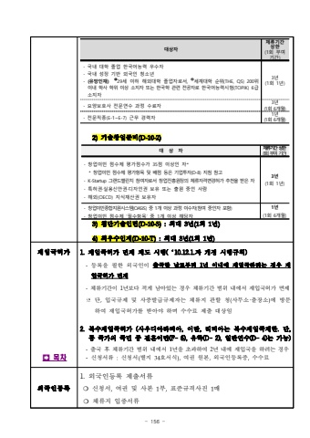 - 156 %ub300%uc0c1%uc790%uccb4%ub958%uae30%uac04 %uc0c1%ud55c(1%ud68c %ubd80%uc5ec %uae30%uac04)%u2219 %uad6d%ub0b4 %ub300%ud559 %uc878%uc5c5 %ud55c%uad6d%uc5b4%ub2a5%ub825 %uc6b0%uc218%uc790%u2219 %uad6d%ub0b4 %uc131%uc7a5 %uae30%ubc18 %uc678%uad6d%uc778 %uccad%uc18c%ub144%u2219 (%uc720%ub9dd%uc778%uc7ac) %u278a29%uc138 %uc774%ud558 %ud574%uc678%ub300%ud559 %uc878%uc5c5%uc790%ub85c%uc11c, %u278b%uc138%uacc4%ub300%ud559 %uc21c%uc704(THE, QS)200%uc704 %uc774%ub0b4 %ud559%uc0ac %ud559%uc704 %uc774%uc0c1 %uc18c%uc9c0%uc790 %ub610%ub294 %ud55c%uad6d%ud559 %uad00%ub828 %uc804%uacf5%uc790%ub85c%ud55c%uad6d%uc5b4%ub2a5%ub825%uc2dc%ud5d8(TOPIK) 6%uae09 %uc18c%uc9c0%uc7903%ub144(1%ud68c 1%ub144)%u2219 %uc694%uc591%ubcf4%ud638%uc0ac %uc804%ubb38%uc5f0%uc218 %uacfc%uc815 %uc218%ub8cc%uc7903%ub144(1%ud68c 6%uac1c%uc6d4)%u2219 %uc804%ubb38%uc9c1%uc885(E-1~E-7) %uadfc%ubb34 %uacbd%ub825%uc7901%ub144(1%ud68c 6%uac1c%uc6d4)2)%uae30%uc220%ucc3d%uc5c5%uc900%ube44(D-10-2)3)%ucca8%ub2e8%uae30%uc220%uc778%ud134(D-10-3):%ucd5c%ub300 3%ub144%ud68c %ub1444)%ucd5c%uc6b0%uc218%uc778%uc7ac(D-10-T):%ucd5c%ub300 3%ub144(1%ud68c 1%ub144)%ub300 %uc0c1 %uc790%uccb4%ub958%uae30%uac04 %uc0c1%ud55c(1%ud68c %ubd80%uc5ec %uae30%uac04)%u2219 %ucc3d%uc5c5%uc774%ubbfc %uc810%uc218%uc81c %ud3c9%uac00%uc810%uc218%uac00 35%uc810 %uc774%uc0c1%uc778 %uc790* *%ucc3d%uc5c5%uc774%ubbfc %uc810%uc218%uc81c %ud3c9%uac00%ud56d%ubaa9 %ubc0f %ubc30%uc810 %ub4f1%uc740 %uae30%uc5c5%ud22c%uc790(D-8) %uc9c0%uce68 %ucc38%uace0%u2219 K-Startup %uadf8%ub79c%ub4dc%ucc4c%ub9b0%uce58 %ucc38%uc5ec%uc790%ub85c%uc11c %ucc3d%uc5c5%uc9c4%ud765%uc6d0%uc7a5%uc758 %uccb4%ub958%uc790%uaca9%ubcc0%uacbd%ud5c8%uac00 %ucd94%ucc9c%uc744 %ubc1b%uc740 %uc790%u2219 %ud2b9%ud5c8%uad8c%u00b7%uc2e4%uc6a9%uc2e0%uc548%uad8c%u00b7%ub514%uc790%uc778%uad8c %ubcf4%uc720 %ub610%ub294 %ucd9c%uc6d0 %uc911%uc778 %uc0ac%ub78c%u2219 %ud574%uc678(OECD) %uc9c0%uc2dd%uc7ac%uc0b0%uad8c %ubcf4%uc720%uc790 3%ub144(1%ud68c 1%ub144)%u2219 %ucc3d%uc5c5%uc774%ubbfc%uc885%ud569%uc9c0%uc6d0%uc2dc%uc2a4%ud15c(OASIS) %uc911 1%uac1c %uc774%uc0c1 %uacfc%uc815 %uc774%uc218%uc790(%ucc38%uc5ec %uc911%uc778%uc790 %ud3ec%ud568)%u2219 %ucc3d%uc5c5%uc774%ubbfc %uc810%uc218%uc81c %u2018%ud544%uc218%ud56d%ubaa9%u2019 %uc911 1%uac1c %uc774%uc0c1 %ud574%ub2f9%uc790 1%ub144(1%ud68c 6%uac1c%uc6d4)%uc7ac%uc785%uad6d%ud5c8%uac00%uf000%ubaa9%ucc281. %uc7ac%uc785%uad6d%ud5c8%uac00 %uba74%uc81c %uc81c%ub3c4 %uc2dc%ud589(%u201810.12.1.%uc790 %uac1c%uc815 %uc2dc%ud589%uaddc%uce59)-%ub4f1%ub85d%uc744 %ud544%ud55c %uc678%uad6d%uc778%uc774 %ucd9c%uad6d%ud55c %ub0a0%ub85c%ubd80%ud130 1%ub144 %uc774%ub0b4%uc5d0 %uc7ac%uc785%uad6d%ud558%ub824%ub294 %uacbd%uc6b0 %uc7ac%uc785%uad6d%ud5c8%uac00 %uba74%uc81c-%uccb4%ub958%uae30%uac04%uc774 1%ub144%ubcf4%ub2e4 %uc801%uac8c %ub0a8%uc544%uc788%ub294 %uacbd%uc6b0 %uccb4%ub958%uae30%uac04 %ubc94%uc704 %ub0b4%uc5d0%uc11c %uc7ac%uc785%uad6d%ud5c8%uac00 %uba74%uc81c%u203b%ub2e8,%uc785%uad6d%uaddc%uc81c %ubc0f %uc0ac%uc99d%ubc1c%uae09%uaddc%uc81c%uc790%ub294 %uccb4%ub958%uc9c0 %uad00%ud560 %uccad(%uc0ac%ubb34%uc18c%u00b7%ucd9c%uc7a5%uc18c)%uc5d0 %ubc29%ubb38%ud558%uc5ec %uc7ac%uc785%uad6d%ud5c8%uac00%ub97c %ubc1b%uc544%uc57c %ud558%uba70 %uc218%uc218%ub8cc %uc81c%ucd9c %ub300%uc0c1%uc7842. %ubcf5%uc218%uc7ac%uc785%uad6d%ud5c8%uac00 (%uc0ac%uc6b0%ub514%uc544%ub77c%ube44%uc544, %uc774%ub780, %ub9ac%ube44%uc544%ub294 %ubcf5%uc218%uc7ac%uc785%uad6d%uc81c%ud55c. %ub2e8, %ub3d9 %uad6d%uac00%uc758 %uad6d%ubbfc %uc911 %uacb0%ud63c%uc774%ubbfc(F%u00ad6), %uc720%ud559(D%u00ad2), %uc77c%ubc18%uc5f0%uc218(D%u00ad4)%ub294 %uac00%ub2a5)-%ucd9c%uad6d %ud6c4 %uccb4%ub958%uae30%uac04 %ubc94%uc704 %ub0b4%uc5d0%uc11c 1%ub144%uc744 %ucd08%uacfc%ud558%uc5ec 2%ub144 %ub0b4%uc5d0 %uc7ac%uc785%uad6d%uc744 %ud558%ub824%ub294 %uacbd%uc6b0-%uc2e0%uccad%uc11c%ub958 :%uc2e0%uccad%uc11c(%ubcc4%uc9c0 34%ud638%uc11c%uc2dd),%uc5ec%uad8c %uc6d0%ubcf8,%uc678%uad6d%uc778%ub4f1%ub85d%uc99d,%uc218%uc218%ub8cc%uc678%uad6d%uc778%ub4f1%ub85d1. %uc678%uad6d%uc778%ub4f1%ub85d %uc81c%ucd9c%uc11c%ub958%u274d %uc2e0%uccad%uc11c,%uc5ec%uad8c %ubc0f %uc0ac%ubcf8 1%ubd80,%ud45c%uc900%uaddc%uaca9%uc0ac%uc9c4 1%ub9e4%u274d %uccb4%ub958%uc9c0 %uc785%uc99d%uc11c%ub958