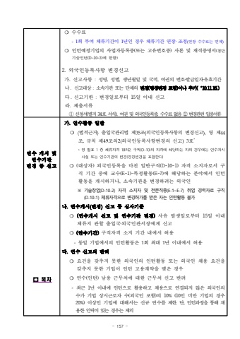 - 157 %u274d %uc218%uc218%ub8cc-1%ud68c %ubd80%uc5ec %uccb4%ub958%uae30%uac04%uc774 1%ub144%uc778 %uacbd%uc6b0 %uccb4%ub958%uae30%uac04 %uc5f0%uc7a5%u2027%uc870%uc815(%uc5f0%uc7a5 %uc218%uc218%ub8cc%ub294 %uba74%uc81c)%u274d %uc778%ud134%uc608%uc815%uae30%uc5c5%uc758 %uc0ac%uc5c5%uc790%ub4f1%ub85d%uc99d(%ub610%ub294 %uace0%uc720%ubc88%ud638%uc99d) %uc0ac%ubcf8 %ubc0f %uc7ac%uc9c1%uc99d%uba85%uc11c(%ucca8%ub2e8%uae30%uc220%uc778%ud134(D-10-3)%uc5d0 %ud55c%ud568)2. %uc678%uad6d%uc778%ub4f1%ub85d%uc0ac%ud56d %ubcc0%uacbd%uc2e0%uace0%uac00. %uc2e0%uace0%uc0ac%ud56d : %uc131%uba85, %uc131%ubcc4, %uc0dd%ub144%uc6d4%uc77c %ubc0f %uad6d%uc801, %uc5ec%uad8c%uc758 %ubc88%ud638%u2027%ubc1c%uae09%uc77c%uc790%u2027%uc720%ud6a8%uae30%uac04%ub098.%uc2e0%uace0%ub300%uc0c1 : %uc18c%uc18d%uae30%uad00 %ub610%ub294 %ub2e8%uccb4%uc758 %ubcc0%uacbd(%uba85%uce6d%ubcc0%uacbd %ud3ec%ud568)%uc774%ub098 %ucd94%uac00(%u201810.11.16.)%ub2e4.%uc2e0%uace0%uae30%ud55c : %ubcc0%uacbd%uc77c%ub85c%ubd80%ud130 15%uc77c %uc774%ub0b4 %uc2e0%uace0%ub77c. %uc81c%ucd9c%uc11c%ub958%u2460 %uc2e0%uccad%uc11c(%ubcc4%uc9c0 34%ud638 %uc11c%uc2dd), %uc5ec%uad8c %ubc0f %uc678%uad6d%uc778%ub4f1%ub85d%uc99d, %uc218%uc218%ub8cc %uc5c6%uc74c %u2461 %ubcc0%uacbd%uad00%ub828 %uc785%uc99d%uc11c%ub958%uc5f0%uc218%uac1c%uc2dc%ubc0f%uc5f0%uc218%uae30%uad00%ubcc0%uacbd%ub4f1%uc2e0%uace0%uf000%ubaa9%ucc28%uac00.%uc5f0%uc218%ud65c%ub3d9 %uc77c%ubc18%u274d(%ubc95%uc801%uadfc%uac70)%ucd9c%uc785%uad6d%uad00%ub9ac%ubc95 %uc81c35%uc870(%uc678%uad6d%uc778%ub4f1%ub85d%uc0ac%ud56d%uc758 %ubcc0%uacbd%uc2e0%uace0),%uc601 %uc81c44%uc870,%uaddc%uce59 %uc81c49%uc870%uc7582(%uc678%uad6d%uc778%ub4f1%ub85d%uc0ac%ud56d%ubcc0%uacbd%uc758 %uc2e0%uace0)3%ud638**%uc601%ubcc4%ud45c1%uc911%uccb4%ub958%uc790%uaca918%uc7582.%uad6c%uc9c1(D-10)%uc758%uc790%uaca9%uc5d0%ud574%ub2f9%ud558%ub294%uc790%uc758%uacbd%uc6b0%uc5d0%ub294%uc5f0%uc218%uac1c%uc2dc%uc0ac%uc2e4%ub610%ub294%uc5f0%uc218%uae30%uad00%uc758%ubcc0%uacbd(%uba85%uce6d%ubcc0%uacbd%uc744%ud3ec%ud568%ud55c%ub2e4)%u274d(%ub300%uc0c1%uc790) %uc678%uad6d%uc778%ub4f1%ub85d%uc744 %ub9c8%uce5c %uc77c%ubc18%uad6c%uc9c1(D-10-1) %uc790%uaca9 %uc18c%uc9c0%uc790%ub85c%uc11c %uad6c%uc9c1 %uae30%uac04 %uc911%uc5d0 %uad50%uc218(E-1)~%ud2b9%uc815%ud65c%ub3d9(E-7)%uc5d0 %ud574%ub2f9%ud558%ub294 %ubd84%uc57c%uc5d0%uc11c %uc778%ud134%ud65c%ub3d9%uc744 %uac1c%uc2dc%ud558%uac70%ub098, %uc18c%uc18d%uae30%uad00%uc744 %ubcc0%uacbd%ud558%ub824%ub294 %uc678%uad6d%uc778%u203b %uae30%uc220%ucc3d%uc5c5(D-10-2) %uc790%uaca9 %uc18c%uc9c0%uc790 %ubc0f %uc804%ubb38%uc9c1%uc885(E-1~E-7) %ucde8%uc5c5 %uacbd%ub825%uc790%ub85c %uad6c%uc9c1 (D-10-1) %uccb4%ub958%uc790%uaca9%uc73c%ub85c %ubcc0%uacbd%ud5c8%uac00%ub97c %ubc1b%uc740 %uc790%ub294 %uc778%ud134%ud65c%ub3d9 %ubd88%uac00%ub098.%uc5f0%uc218%uac1c%uc2dc(%ubcc0%uacbd)%uc2e0%uace0 %ub4f1 %uc2ec%uc0ac%uae30%uc900%u274d(%uc5f0%uc218%uac1c%uc2dc %uc2e0%uace0 %ubc0f %uc5f0%uc218%uae30%uad00 %ubcc0%uacbd)%uc0ac%uc720 %ubc1c%uc0dd%uc77c%ub85c%ubd80%ud130 15%uc77c %uc774%ub0b4 %uccb4%ub958%uc9c0 %uad00%ud560 %ucd9c%uc785%uad6d%u2027%uc678%uad6d%uc778%uad00%uc11c%uc7a5%uc5d0%uac8c %uc2e0%uace0%u274d(%uc5f0%uc218%uae30%uac04)%uad6c%uc9c1%uc790%uaca9 %uc18c%uc9c0 %uae30%uac04 %ub0b4%uc5d0%uc11c %ud5c8%uc6a9-%ub3d9%uc77c %uae30%uc5c5%uc5d0%uc11c%uc758 %uc778%ud134%ud65c%ub3d9%uc740 1%ud68c %ucd5c%ub300 1%ub144 %uc774%ub0b4%uc5d0%uc11c %ud5c8%uc6a9%ub2e4. %uc5f0%uc218 %uc2e0%uace0%uc758 %ubc18%ub824 %u274d %uc694%uac74%uc744 %uac16%ucd94%uc9c0 %ubabb%ud55c %uc678%uad6d%uc778%uc758 %uc778%ud134%ud65c%ub3d9 %ub610%ub294 %uc678%uad6d%uc778 %ucc44%uc6a9 %uc694%uac74%uc744 %uac16%ucd94%uc9c0 %ubabb%ud55c %uae30%uc5c5%uc774 %uc778%ud134 %uace0%uc6a9%uacc4%uc57d%uc744 %ub9fa%uc740 %uacbd%uc6b0 %u274d%uc5f0%uc218(%uc778%ud134) %ub0a8%uc6a9 %uadfc%ubb34%ucc98%uc5d0 %ub300%ud55c %uadfc%ubb34%ucc98 %uc2e0%uace0 %ubc18%ub824-%ucd5c%uadfc 1%ub144 %uc774%ub0b4%uc5d0 %uc778%ud134%uc73c%ub85c %ud65c%uc6a9%ud558%uace0 %ucc44%uc6a9%uc73c%ub85c %uc5f0%uacb0%ub418%uc9c0 %uc54a%uc740 %uc678%uad6d%uc778%uc758 %uc218%uac00%uae30%uc5c5 %uc0c1%uc2dc%uadfc%ub85c%uc790 %uc218(%uc678%uad6d%uc778 %ud3ec%ud568)%uc758 10% (10%uc778 %ubbf8%ub9cc %uae30%uc5c5%uc758 %uacbd%uc6b0 20%) %uc774%uc0c1%uc778 %uae30%uc5c5%uc5d0 %ub300%ud574%uc11c%ub294 %uc2e0%uaddc %uc5f0%uc218%ub97c%uc81c%ud55c. %ub2e8, %uc778%ud134%uacfc%uc815%uc744 %ud1b5%ud574 %ucc44%uc6a9%ud55c %uc778%ub825%uc774 %uc788%ub294 %uacbd%uc6b0%ub294 %uc81c%uc678
