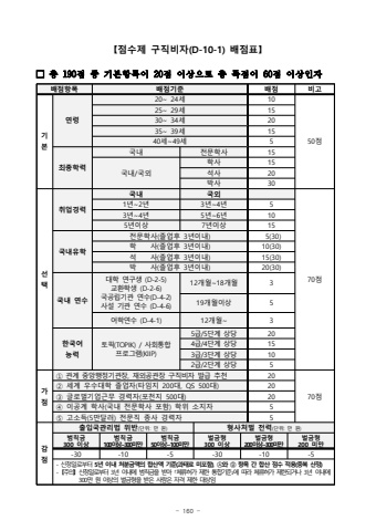 - 160 %u3010%uc810%uc218%uc81c %uad6c%uc9c1%ube44%uc790(D-10-1) %ubc30%uc810%ud45c%u3011%u25a1 %ucd1d 190%uc810 %uc911 %uae30%ubcf8%ud56d%ubaa9%uc774 20%uc810 %uc774%uc0c1%uc73c%ub85c %ucd1d %ub4dd%uc810%uc774 60%uc810 %uc774%uc0c1%uc778%uc790%ubc30%uc810%ud56d%ubaa9%ubc30%uc810%uae30%uc900%ubc30%uc810%ube44%uace0%uae30%ubcf8%uc5f0%ub83920~ 24%uc1381050%uc81025~ 29%uc1381530~ 34%uc1382035~ 39%uc1381540%uc138~49%uc1385%ucd5c%uc885%ud559%ub825%uad6d%ub0b4 %uc804%ubb38%ud559%uc0ac15%uad6d%ub0b4/%uad6d%uc678%ud559%uc0ac15%uc11d%uc0ac20%ubc15%uc0ac30%uc120%ud0dd%ucde8%uc5c5%uacbd%ub825%uad6d%ub0b4%uad6d%uc67870%uc8101%ub144~2%ub1443%ub144~4%ub14453%ub144~4%ub1445%ub144~6%ub144105%ub144%uc774%uc0c17%ub144%uc774%uc0c115%uad6d%ub0b4%uc720%ud559%uc804%ubb38%ud559%uc0ac(%uc878%uc5c5%ud6c4 3%ub144%uc774%ub0b4)5(30)%ud559 %uc0ac(%uc878%uc5c5%ud6c4 3%ub144%uc774%ub0b4)10(30)%uc11d %uc0ac(%uc878%uc5c5%ud6c4 3%ub144%uc774%ub0b4)15(30)%ubc15 %uc0ac(%uc878%uc5c5%ud6c4 3%ub144%uc774%ub0b4)20(30)%uad6d%ub0b4 %uc5f0%uc218%ub300%ud559 %uc5f0%uad6c%uc0dd (D-2-5)%uad50%ud658%ud559%uc0dd (D-2-6)%uad6d%uacf5%ub9bd%uae30%uad00 %uc5f0%uc218(D-4-2)%uc0ac%uc124 %uae30%uad00 %uc5f0%uc218 (D-4-6)12%uac1c%uc6d4~18%uac1c%uc6d4319%uac1c%uc6d4%uc774%uc0c15%uc5b4%ud559%uc5f0%uc218 (D-4-1)12%uac1c%uc6d4~3%ud55c%uad6d%uc5b4 %ub2a5%ub825%ud1a0%ud53d(TOPIK) / %uc0ac%ud68c%ud1b5%ud569%ud504%ub85c%uadf8%ub7a8(KIIP)5%uae09/5%ub2e8%uacc4 %uc0c1%ub2f9204%uae09/4%ub2e8%uacc4 %uc0c1%ub2f9153%uae09/3%ub2e8%uacc4 %uc0c1%ub2f9102%uae09/2%ub2e8%uacc4 %uc0c1%ub2f95%uac00%uc810%u2460 %uad00%uacc4 %uc911%uc559%ud589%uc815%uae30%uad00%uc7a5, %uc7ac%uc678%uacf5%uad00%uc7a5 %uad6c%uc9c1%ube44%uc790 %ubc1c%uae09 %ucd94%ucc9c2070%uc810%u2461 %uc138%uacc4 %uc6b0%uc218%ub300%ud559 %uc878%uc5c5%uc790(%ud0c0%uc784%uc9c0 200%ub300, QS 500%ub300) 20%u2462 %uae00%ub85c%ubc8c%uae30%uc5c5%uadfc%ubb34 %uacbd%ub825%uc790(%ud3ec%ucc9c%uc9c0 500%ub300)20%u2463 %uc774%uacf5%uacc4 %ud559%uc0ac(%uad6d%ub0b4 %uc804%ubb38%ud559%uc0ac %ud3ec%ud568) %ud559%uc704 %uc18c%uc9c0%uc7905%u2464 %uace0%uc18c%ub4dd(5%ub9cc%ub2ec%ub7ec) %uc804%ubb38%uc9c1 %uc885%uc0ac %uacbd%ub825%uc7905%uac10%uc810%ucd9c%uc785%uad6d%uad00%ub9ac%ubc95 %uc704%ubc18(%ub2e8%uc704: %ub9cc %uc6d0)%ud615%uc0ac%ucc98%ubc8c %uc804%ub825(%ub2e8%uc704: %ub9cc %uc6d0)%ubc94%uce59%uae08300 %uc774%uc0c1 %ubc94%uce59%uae08100%uc774%uc0c1~300%ubbf8%ub9cc%ubc94%uce59%uae0850%uc774%uc0c1~100%ubbf8%ub9cc%ubc8c%uae08%ud615300 %uc774%uc0c1%ubc8c%uae08%ud615200%uc774%uc0c1~300%ubbf8%ub9cc%ubc8c%uae08%ud615200 %ubbf8%ub9cc-30-10-5-30-10-5-%uc2e0%uccad%uc77c%ub85c%ubd80%ud130 5%ub144 %uc774%ub0b4 %ucc98%ubd84%uae08%uc561%uc758 %ud569%uc0b0%uc561 %uae30%uc900(%uacfc%ud0dc%ub8cc %ubbf8%ud3ec%ud568),%u24b6%uc640 %u24b7 %ud56d%ubaa9 %uac04 %ud569%uc0b0 %uc810%uc218 %uc801%uc6a9(%uc911%ubcf5 %uc0b0%uc815)- %u3010%uc8fc%uc758%u3011%uc2e0%uccad%uc77c%ub85c%ubd80%ud130 3%ub144 %uc774%ub0b4%uc5d0 %ubc94%uce59%uae08%uc744 %ubc1b%uc544 %uff62%uccb4%ub958%ud5c8%uac00 %uc81c%ud55c %ud1b5%ud569%uae30%uc900%uff63%uc5d0 %ub530%ub77c %uccb4%ub958%ud5c8%uac00 %uc81c%ud55c%ub418%uac70%ub0983%ub144 %uc774%ub0b4%uc5d0 300%ub9cc %uc6d0 %uc774%uc0c1%uc758 %ubc8c%uae08%ud615%uc744 %ubc1b%uc740 %uc0ac%ub78c%uc740 %uc790%uaca9 %uc81c%ud55c %ub300%uc0c1%uc784