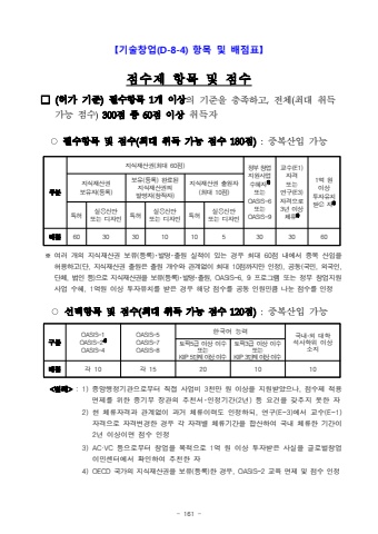 - 161 %u3010%uae30%uc220%ucc3d%uc5c5(D-8-4) %ud56d%ubaa9 %ubc0f %ubc30%uc810%ud45c%u3011%uc810%uc218%uc81c%ud56d%ubaa9%ubc0f%uc810%uc218%u25a1(%ud5c8%uac00 %uae30%uc900)%ud544%uc218%ud56d%ubaa9 1%uac1c %uc774%uc0c1%uc758 %uae30%uc900%uc744 %ucda9%uc871%ud558%uace0,%uc804%uccb4(%ucd5c%ub300 %ucde8%ub4dd%uac00%ub2a5 %uc810%uc218)300%uc810 %uc911 60%uc810%uc774%uc0c1%ucde8%ub4dd%uc790%u25cb%ud544%uc218%ud56d%ubaa9 %ubc0f %uc810%uc218(%ucd5c%ub300 %ucde8%ub4dd %uac00%ub2a5 %uc810%uc218 180%uc810):%uc911%ubcf5%uc0b0%uc785 %uac00%ub2a5%uad6c%ubd84%uc9c0%uc2dd%uc7ac%uc0b0%uad8c(%ucd5c%ub300 60%uc810)%uc815%ubd80 %ucc3d%uc5c5%uc9c0%uc6d0%uc0ac%uc5c5 %uc218%ud61c%uc7901)%ub610%ub294OASIS-6%ub610%ub294OASIS-9%uad50%uc218(E1) %uc790%uaca9 %ub610%ub294 %uc5f0%uad6c(E3) %uc790%uaca9%uc73c%ub85c 3%ub144 %uc774%uc0c1 %uccb4%ub9582)1%uc5b5 %uc6d0 %uc774%uc0c1 %ud22c%uc790%uc720%uce58 %ubc1b%uc740 %uc7903)%uc9c0%uc2dd%uc7ac%uc0b0%uad8c %ubcf4%uc720%uc790(%ub4f1%ub85d)%ubcf4%uc720(%ub4f1%ub85d) %uc644%ub8cc%ub41c %uc9c0%uc2dd%uc7ac%uc0b0%uad8c%uc758 %ubc1c%uba85%uc790(%ucc3d%uc791%uc790)%uc9c0%uc2dd%uc7ac%uc0b0%uad8c %ucd9c%uc6d0%uc790(%ucd5c%ub300 10%uc810)%ud2b9%ud5c8%uc2e4%uc6a9%uc2e0%uc548%ub610%ub294 %ub514%uc790%uc778%ud2b9%ud5c8%uc2e4%uc6a9%uc2e0%uc548 %ub610%ub294 %ub514%uc790%uc778%ud2b9%ud5c8%uc2e4%uc6a9%uc2e0%uc548 %ub610%ub294 %ub514%uc790%uc778%ubc30%uc81060303010105303060%u203b %uc5ec%ub7ec %uac1c%uc758 %uc9c0%uc2dd%uc7ac%uc0b0%uad8c %ubcf4%uc720(%ub4f1%ub85d)%uff65%ubc1c%uba85%uff65%ucd9c%uc6d0 %uc2e4%uc801%uc774 %uc788%ub294 %uacbd%uc6b0 %ucd5c%ub300 60%uc810 %ub0b4%uc5d0%uc11c %uc911%ubcf5 %uc0b0%uc785%uc744 %ud5c8%uc6a9%ud558%uace0(%ub2e8, %uc9c0%uc2dd%uc7ac%uc0b0%uad8c %ucd9c%uc6d0%uc740 %ucd9c%uc6d0 %uac1c%uc218%uc640 %uad00%uacc4%uc5c6%uc774 %ucd5c%ub300 10%uc810%uae4c%uc9c0%ub9cc %uc778%uc815), %uacf5%ub3d9(%uad6d%ubbfc, %uc678%uad6d%uc778, %ub2e8%uccb4, %ubc95%uc778 %ub4f1)%uc73c%ub85c %uc9c0%uc2dd%uc7ac%uc0b0%uad8c%uc744 %ubcf4%uc720(%ub4f1%ub85d)%uff65%ubc1c%uba85%uff65%ucd9c%uc6d0, OASIS-6, 9 %ud504%ub85c%uadf8%ub7a8 %ub610%ub294 %uc815%ubd80 %ucc3d%uc5c5%uc9c0%uc6d0%uc0ac%uc5c5 %uc218%ud61c, 1%uc5b5%uc6d0 %uc774%uc0c1 %ud22c%uc790%uc720%uce58%ub97c %ubc1b%uc740 %uacbd%uc6b0 %ud574%ub2f9 %uc810%uc218%ub97c %uacf5%ub3d9 %uc778%uc6d0%ubbfc%ud07c %ub098%ub208 %uc810%uc218%ub97c %uc778%uc815%u25cb%uc120%ud0dd%ud56d%ubaa9 %ubc0f %uc810%uc218(%ucd5c%ub300 %ucde8%ub4dd %uac00%ub2a5 %uc810%uc218 120%uc810):%uc911%ubcf5%uc0b0%uc785 %uac00%ub2a5%uad6c%ubd84OASIS-1OASIS-24)OASIS-4OASIS-5OASIS-7OASIS-8%ud55c%uad6d%uc5b4 %ub2a5%ub825%uad6d%ub0b4%u2027%uc678 %ub300%ud559%uc11d%uc0ac%ud559%uc704 %uc774%uc0c1 %uc18c%uc9c0%ud1a0%ud53d5%uae09 %uc774%uc0c1 %uc774%uc218%ub610%ub294KIIP 5%ub2e8%uacc4 %uc774%uc0c1 %uc774%uc218%ud1a0%ud53d3%uae09 %uc774%uc0c1 %uc774%uc218%ub610%ub294KIIP 3%ub2e8%uacc4 %uc774%uc0c1 %uc774%uc218%ubc30%uc810%uac01 10%uac01 15201010<%ubc94%ub840>: 1)%uc911%uc559%ud589%uc815%uae30%uad00%uc73c%ub85c%ubd80%ud130 %uc9c1%uc811 %uc0ac%uc5c5%ube44 3%ucc9c%ub9cc %uc6d0 %uc774%uc0c1%uc744 %uc9c0%uc6d0%ubc1b%uc558%uc73c%ub098, %uc810%uc218%uc81c %uc801%uc6a9 %uba74%uc81c%ub97c %uc704%ud55c %uc911%uae30%ubd80 %uc7a5%uad00%uc758 %ucd94%ucc9c%uc11c%uff65%uc778%uc815%uae30%uac04(2%ub144) %ub4f1 %uc694%uac74%uc744 %uac16%ucd94%uc9c0 %ubabb%ud55c %uc7902) %ud604 %uccb4%ub958%uc790%uaca9%uacfc %uad00%uacc4%uc5c6%uc774 %uacfc%uac70 %uccb4%ub958%uc774%ub825%ub3c4 %uc778%uc815%ud558%ub418, %uc5f0%uad6c(E-3)%uc5d0%uc11c %uad50%uc218(E-1) %uc790%uaca9%uc73c%ub85c %uc790%uaca9%ubcc0%uacbd%ud55c %uacbd%uc6b0 %uac01 %uc790%uaca9%ubcc4 %uccb4%ub958%uae30%uac04%uc744 %ud569%uc0b0%ud558%uc5ec %uad6d%ub0b4 %uccb4%ub958%ud55c %uae30%uac04%uc774 2%ub144 %uc774%uc0c1%uc774%uba74 %uc810%uc218 %uc778%uc8153) AC%u00b7VC %ub4f1%uc73c%ub85c%ubd80%ud130 %ucc3d%uc5c5%uc744 %ubaa9%uc801%uc73c%ub85c 1%uc5b5 %uc6d0 %uc774%uc0c1 %ud22c%uc790%ubc1b%uc740 %uc0ac%uc2e4%uc744 %uae00%ub85c%ubc8c%ucc3d%uc5c5%uc774%ubbfc%uc13c%ud130%uc5d0%uc11c %ud655%uc778%ud558%uc5ec %ucd94%ucc9c%ud55c %uc7904) OECD %uad6d%uac00%uc758 %uc9c0%uc2dd%uc7ac%uc0b0%uad8c%uc744 %ubcf4%uc720(%ub4f1%ub85d)%ud55c %uacbd%uc6b0, OASIS-2 %uad50%uc721 %uba74%uc81c %ubc0f %uc810%uc218 %uc778%uc815