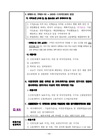 - 168 %uf0003. %uc720%ud559(D-2), %uad6c%uc9c1(D-10) %u27a0 %uad50%uc218(E-1)%uc790%uaca9%uc73c%ub85c%uc758 %ubcc0%uacbd%uac00.%uc790%uaca9%uc694%uac74 (%uc544%ub798 %u2460,%u2461,%u2462%uc694%uac74%uc744 %ubaa8%ub450 %ucda9%uc871%ud558%uc5ec%uc57c %ud568)%u2460%uad6c%uc9c1(D-10)%uc790%uaca9 %ub610%ub294 %uc720%ud559(D-2)%uc790%uaca9%uc744 %uc18c%uc9c0%ud558%uace0 %ud569%ubc95 %uccb4%ub958 %uc911%uc778 %uc790%u2461%ucde8%uc5c5%ud65c%ub3d9%uc744 %ud558%ub824%ub294 %ubd84%uc57c%uac00 %uad50%uc218(E-1)%u2024%ud68c%ud654%uc9c0%ub3c4(E-2)%u2024%uc5f0%uad6c(E-3)%u2024%uae30%uc220%uc9c0%ub3c4(E-4)%u2024%uc804%ubb38%uc9c1%uc5c5(E-5)%u2024%uc608%uc220%ud765%ud589(E-6)%u2024%ud2b9%uc815%ud65c%ub3d9(E-7)%uccb4%ub958%uc790%uaca9%uc5d0%ud574%ub2f9%ud558%uace0 %ud574%ub2f9 %uc790%uaca9%uc694%uac74 %ub4f1%uc744 %uad6c%ube44%ud558%uc5ec%uc57c %ud568%u2462%ucde8%uc5c5%ud558%ub824%ub294 %ud574%ub2f9 %uae30%uad00%u2024%ub2e8%uccb4 %ub4f1%uc758 %ub300%ud45c%uc790%uc640 %uace0%uc6a9%uacc4%uc57d%uc744 %uccb4%uacb0%ud558%uc5ec%uc57c %ud568%u203b%uc720%ud559(D-2) %uc790%uaca9 %uc18c%uc9c0%uc790%ub294 %uad6c%uc9c1(D-10)%uc790%uaca9%uc73c%ub85c %ubcc0%uacbd%ud560 %uc218 %uc788%ub294 %uc694%uac74%uc744 %uac16%ucd98 %uc878%uc5c5%uc608%uc815%uc790%ub97c %uc758%ubbf8(%ub2e8, %uc790%uad6d %ub610%ub294 %uc81c3%uad6d%uc758 %ub300%ud559%uc5d0%uc11c %uc774%ubbf8 %ud559%uc0ac %uc774%uc0c1%uc758 %ud559%uc704%ub97c %ucde8%ub4dd%ud558%uace0 %ud544%uc694%ud55c %uacbd%ub825%uc694%uac74 %ub4f1%uc744 %uac16%ucd98 %uacbd%uc6b0%uc5d0%ub294%uc7ac%ud559 %uc911%uc774%ub77c %ud558%ub354%ub77c%ub3c4 %ubcc0%uacbd %ud5c8%uc6a9)%ub098. %uc81c%ucd9c%uc11c%ub958%u2460 %uc2e0%uccad%uc11c(%ubcc4%uc9c0 34%ud638%uc11c%uc2dd), %uc5ec%uad8c %ubc0f %uc678%uad6d%uc778%ub4f1%ub85d%uc99d, %uc218%uc218%ub8cc %u2461%uace0%uc6a9%uacc4%uc57d%uc11c %u2462 %ud559%uc704%uc99d %ub610%ub294 %uacbd%ub825%uc99d%uba85%uc11c- %uc870%uad50%uc218 %uc774%uc0c1%uc758 %uc790%uaca9%uae30%uc900%uc5d0 %ud574%ub2f9%ud558%ub294 %uc804%uc784%uad50%uc218 %ub4f1%uc758 %uacbd%uc6b0 %uc81c%ucd9c %uc0dd%ub7b5%u2463%uace0%uc6a9%uc5c5%uccb4 %ub4f1 %uc124%ub9bd%uad00%ub828 %uc11c%ub958(%uc0ac%uc5c5%uc790%ub4f1%ub85d%uc99d, %ub4f1%uae30%ubd80%ub4f1%ubcf8 %ub4f1)4. %uc774%uacf5%uacc4%ub300%ud559 %uc878%uc5c5 %uc720%ud559%uc0dd %uc911 %uad50%uc721%u2024%uacfc%ud559%uae30%uc220 %ubd84%uc57c%uc758 %uc5f0%uad6c%u2024%uc9c0%ub3c4 %ud65c%ub3d9%uc5d0 %uc885%uc0ac%ud558%ub824%ub294 %uacbd%uc6b0(%uc11d%uc0ac %uc774%uc0c1%uc758 %ud559%uc704 %ucde8%ub4dd%uc790%ub9cc %uac00%ub2a5 %uc81c%ucd9c%uc11c%ub958%u2460%uc2e0%uccad%uc11c(%ubcc4%uc9c0 34%ud638%uc11c%uc2dd),%uc5ec%uad8c %ubc0f %uc678%uad6d%uc778%ub4f1%ub85d%uc99d,%uc218%uc218%ub8cc %u2461%uc878%uc5c5%uc99d%uba85%uc11c %u2462%uace0%uc6a9%uacc4%uc57d%uc11c %u2463%ucd1d(%ud559)%uc7a5%uc758 %uace0%uc6a9%ucd94%ucc9c%uc11c %u2464%uc0ac%uc5c5%uc790%ub4f1%ub85d%uc99d5. %uc0ac%uc99d%uba74%uc81c(B-1) %uc790%uaca9%uc73c%ub85c %uc785%uad6d%ud55c %ub3c5%uc77c%uc778%uc5d0 %ub300%ud55c %uc7a5%uae30%uccb4%ub958%uc790%uaca9%uc73c%ub85c %ubcc0%uacbd%uac00.%ud5c8%uac00%uccb4%ub958%uc790%uaca9 :%uae30%uc220%uc5f0%uc218(D-3),%ube44%uc804%ubb38%ucde8%uc5c5(E-9)%ubc0f %uad00%uad11%ucde8%uc5c5(H-1)%uc744%uc81c%uc678%ud55c %ubaa8%ub4e0 %uc7a5%uae30%uccb4%ub958%uc790%uaca9%ub098.%ud5c8%uac00%uae30%uac04 :%uccb4%ub958%uc790%uaca9%ubcc4 1%ud68c %ubd80%uc5ec%ud560 %uc218 %uc788%ub294 %uccb4%ub958%uae30%uac04%uc758 %uc0c1%ud55c%uccb4%ub958%uae30%uac04%uc5f0%uc7a5%ud5c8%uac00%uc81c%ucd9c%uc11c%ub958%u2460%uc2e0%uccad%uc11c(%uc81c 34%ud638 %uc11c%uc2dd),%uc5ec%uad8c,%ud45c%uc900%uaddc%uaca9%uc0ac%uc9c4 1%uc7a5,%uc218%uc218%ub8cc %u2461%uace0%uc6a9%uacc4%uc57d%uc11c %uc6d0%ubcf8 %ubc0f %uc0ac%ubcf8,%uae30%ud0c0 %uc2ec%uc0ac%uc5d0 %ud544%uc694%ud55c %uc790%ub8cc*(%ud544%uc694%uc2dc 1~2%uc885 %uc81c%ucd9c)