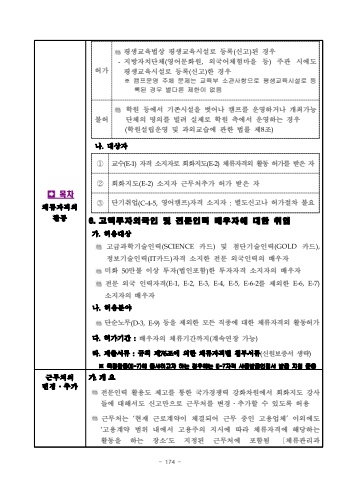 - 174 %uf000%ubaa9%ucc28%uccb4%ub958%uc790%uaca9%uc678%ud65c%ub3d9%ud5c8%uac00%ud3c9%uc0dd%uad50%uc721%ubc95%uc0c1 %ud3c9%uc0dd%uad50%uc721%uc2dc%uc124%ub85c %ub4f1%ub85d(%uc2e0%uace0)%ub41c %uacbd%uc6b0 -%uc9c0%ubc29%uc790%uce58%ub2e8%uccb4(%uc601%uc5b4%ubb38%ud654%uc6d0,%uc678%uad6d%uc5b4%uccb4%ud5d8%ub9c8%uc744 %ub4f1)%uc8fc%uad00 %uc2dc%uc5d0%ub3c4 %ud3c9%uc0dd%uad50%uc721%uc2dc%uc124%ub85c %ub4f1%ub85d(%uc2e0%uace0)%ud55c %uacbd%uc6b0%u203b %ucea0%ud504%uc6b4%uc601 %uc8fc%uccb4 %ubb38%uc81c%ub294 %uad50%uc721%ubd80%uc18c%uad00%uc0ac%ud56d%uc73c%ub85c %ud3c9%uc0dd%uad50%uc721%uc2dc%uc124%ub85c %ub4f1%ub85d%ub41c %uacbd%uc6b0 %ubcc4%ub2e4%ub978 %uc81c%ud55c%uc774 %uc5c6%uc74c%ubd88%ud5c8%ud559%uc6d0 %ub4f1%uc5d0%uc11c %uae30%uc874%uc2dc%uc124%uc744 %ubc97%uc5b4%ub098 %ucea0%ud504%ub97c %uc6b4%uc601%ud558%uac70%ub098 %uac1c%ucd5c%uac00%ub2a5 %ub2e8%uccb4%uc758 %uba85%uc758%ub97c %ube4c%ub824 %uc2e4%uc81c%ub85c %ud559%uc6d0 %uce21%uc5d0%uc11c %uc6b4%uc601%ud558%ub294 %uacbd%uc6b0(%ud559%uc6d0%uc124%ub9bd%uc6b4%uc601 %ubc0f %uacfc%uc678%uad50%uc2b5%uc5d0 %uad00%ud55c %ubc95%ub960 %uc81c8%uc870)%ub098.%ub300%uc0c1%uc790%u2460%uad50%uc218(E-1)%uc790%uaca9 %uc18c%uc9c0%uc790%ub85c %ud68c%ud654%uc9c0%ub3c4(E-2)%uccb4%ub958%uc790%uaca9%uc678 %ud65c%ub3d9 %ud5c8%uac00%ub97c %ubc1b%uc740 %uc790%u2461%ud68c%ud654%uc9c0%ub3c4(E-2)%uc18c%uc9c0%uc790 %uadfc%ubb34%ucc98%ucd94%uac00 %ud5c8%uac00 %ubc1b%uc740 %uc790%u2462%ub2e8%uae30%ucde8%uc5c5(C-4-5,%uc601%uc5b4%ucea0%ud504)%uc790%uaca9 %uc18c%uc9c0%uc790 :%ubcc4%ub3c4%uc2e0%uace0%ub098 %ud5c8%uac00%uc808%ucc28 %ubd88%uc6946. %uace0%uc561%ud22c%uc790%uc678%uad6d%uc778 %ubc0f %uc804%ubb38%uc778%ub825 %ubc30%uc6b0%uc790%uc5d0 %ub300%ud55c %ucde8%uc5c5%uac00.%ud5c8%uc6a9%ub300%uc0c1%uace0%uae09%uacfc%ud559%uae30%uc220%uc778%ub825%uce74%ub4dc%ubc0f %ucca8%ub2e8%uae30%uc220%uc778%ub825%uce74%ub4dc%uc815%ubcf4%uae30%uc220%uc778%ub825(IT%uce74%ub4dc)%uc790%uaca9 %uc18c%uc9c0%ud55c %uc804%ubb38 %uc678%uad6d%uc778%ub825%uc758 %ubc30%uc6b0%uc790 %ubbf8%ud654 50%ub9cc%ubd88 %uc774%uc0c1 %ud22c%uc790(%ubc95%uc778%ud3ec%ud568)%ud55c %ud22c%uc790%uc790%uaca9 %uc18c%uc9c0%uc790%uc758 %ubc30%uc6b0%uc790%uc804%ubb38 %uc678%uad6d %uc778%ub825%uc790%uaca9(E-1,E-2,E-3,E-4,E-5,E-6-2%ub97c %uc81c%uc678%ud55c E-6,E-7)%uc18c%uc9c0%uc790%uc758 %ubc30%uc6b0%uc790%ub098.%ud5c8%uc6a9%ubd84%uc57c%ub2e8%uc21c%ub178%ubb34(D-3,E-9)%ub4f1%uc744 %uc81c%uc678%ud55c %ubaa8%ub4e0 %uc9c1%uc885%uc5d0 %ub300%ud55c %uccb4%ub958%uc790%uaca9%uc678 %ud65c%ub3d9%ud5c8%uac00%ub2e4.%ud5c8%uac00%uae30%uac04 :%ubc30%uc6b0%uc790%uc758 %uccb4%ub958%uae30%uac04%uae4c%uc9c0(%uacc4%uc18d%uc5f0%uc7a5 %uac00%ub2a5)%ub77c.%uc81c%ucd9c%uc11c%ub958 :%uaddc%uce59 %uc81c76%uc870%uc5d0 %uc758%ud55c %uccb4%ub958%uc790%uaca9%ubcc4 %ucca8%ubd80%uc11c%ub958(%uc2e0%uc6d0%ubcf4%uc99d%uc11c %uc0dd%ub7b5)%u203b %ud2b9%uc815%ud65c%ub3d9(E-7)%uc5d0 %uc885%uc0ac%ud558%uace0%uc790 %ud558%ub294 %uacbd%uc6b0%uc5d0%ub294 E-7%uc790%uaca9 %uc0ac%uc99d%ubc1c%uae09%uc778%uc815%uc11c %ubc1c%uae09 %uc9c0%uce68 %uc900%uc6a9%uadfc%ubb34%ucc98%uc758%ubcc0%uacbd%u2024%ucd94%uac00%uac00.%uac1c %uc694%uc804%ubb38%uc778%ub825 %ud65c%uc6a9%ub3c4 %uc81c%uace0%ub97c %ud1b5%ud55c %uad6d%uac00%uacbd%uc7c1%ub825 %uac15%ud654%ucc28%uc6d0%uc5d0%uc11c %ud68c%ud654%uc9c0%ub3c4 %uac15%uc0ac%ub4e4%uc5d0%ub300%ud574%uc11c%ub3c4 %uc2e0%uace0%ub9cc%uc73c%ub85c %uadfc%ubb34%ucc98%ub97c %ubcc0%uacbd%u2024%ucd94%uac00%ud560 %uc218 %uc788%ub3c4%ub85d %ud5c8%uc6a9%uadfc%ubb34%ucc98%ub294 %u2018%ud604%uc7ac %uadfc%ub85c%uacc4%uc57d%uc774 %uccb4%uacb0%ub418%uc5b4 %uadfc%ubb34 %uc911%uc778 %uace0%uc6a9%uc5c5%uccb4%u2019%uc774%uc678%uc5d0%ub3c4 %u2018%uace0%uc6a9%uacc4%uc57d %ubc94%uc704 %ub0b4%uc5d0%uc11c %uace0%uc6a9%uc8fc%uc758 %uc9c0%uc2dc%uc5d0 %ub530%ub77c %uccb4%ub958%uc790%uaca9%uc5d0 %ud574%ub2f9%ud558%ub294 %ud65c%ub3d9%uc744 %ud558%ub294 %uc7a5%uc18c%u2019%ub3c4 %uc9c0%uc815%ub41c %uadfc%ubb34%ucc98%uc5d0 %ud3ec%ud568%ub428 %u3014%uccb4%ub958%uad00%ub9ac%uacfc