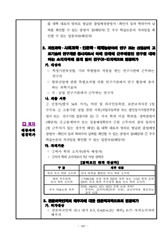 - 187 %uf000%uccb4%ub958%uc790%uaca9%ubcc0%uacbd%ud5c8%uac00%u2785 %ub300%ud559 %ub300%ud45c%uc790 %uba85%uc758%ub85c %ubc1c%uae09%ub41c %uc878%uc5c5%uc608%uc815%uc99d%uba85%uc11c%u00b7%ud655%uc778%uc11c %ub4f1%uacfc %ud559%uc704%uc218%uc5ec %ub0a0%uc9dc%ub97c %ud655%uc778%ud560 %uc218 %uc788%ub294%uc99d%uba85%uc11c%ub4f1(%ud574%ub2f9%uc790)%u2466 %uc6b0%uc218 %ud559%uc220%ub17c%ubb38%uc758 %uc800%uc790%uc784%uc744 %ud655%uc778%ud560 %uc218 %uc788%ub294 %uc785%uc99d%uc790%ub8cc(%ud574%ub2f9%uc790) 2. %uc790%uc5f0%uacfc%ud559%u00b7%uc0ac%ud68c%uacfc%ud559%u00b7%uc778%ubb38%ud559%u00b7%uc608%uccb4%ub2a5%ubd84%uc57c%uc758 %uc5f0%uad6c %ub610%ub294 %uc0b0%uc5c5%uc0c1%uc758 %uace0%ub3c4%uae30%uc220%uc758 %uc5f0%uad6c%uac1c%ubc1c %uc885%uc0ac%uc790%ub85c%uc11c %uc544%ub798 %ub2e8%uccb4%uc5d0 %uadfc%ubb34%uc608%uc815%uc778 %uc5f0%uad6c%uc6d0 %ub300%ud558%uc5ec%ub294 %uc18c%uc9c0%uc790%uaca9%uc5d0 %uad00%uacc4 %uc5c6%uc774 %uc5f0%uad6c(E-3)%uc790%uaca9%uc73c%ub85c %ubcc0%uacbd%ud5c8%uac00%uac00.%ub300%uc0c1%uc790%u25e6%ud2b9%uc815%uae30%uad00%uc721%uc131%ubc95,%uae30%ud0c0 %ud2b9%ubcc4%ubc95%uc758 %uc801%uc6a9%uc744 %ubc1b%ub294 %uc5f0%uad6c%uae30%uad00%uc5d0 %uadfc%ubb34%ud558%ub294 %uc5f0%uad6c%uc790%u25e6%ubc29%uc704%uc0b0%uc5c5%uc5d0 %uad00%ud55c %ud2b9%ubcc4%uc870%uce58%ubc95 %uc758%ud55c %uc5f0%uad6c%uae30%uad00%uc5d0%uc11c %uc5f0%uad6c %ud65c%ub3d9%uc5d0 %uc885%uc0ac%ud558%ub294 %uacfc%ud559%uae30%uc220%uc790%u25e6%uad6d%u2024%uacf5%ub9bd %uc5f0%uad6c%uae30%uad00%uc5d0%uc11c %uadfc%ubb34%ud558%ub294 %uc5f0%uad6c%uc790%ub098.%uc81c%ucd9c %uc11c%ub958%u2460%uc2e0%uccad%uc11c(%ubcc4%uc9c0 34%ud638 %uc11c%uc2dd),%uc5ec%uad8c %ubc0f %uc678%uad6d%uc778%ub4f1%ub85d%uc99d,%ud45c%uc900%uaddc%uaca9%uc0ac%uc9c4 1%uc7a5,%uc218%uc218%ub8cc%u2461%uace0%uc6a9%uae30%uad00 %uc124%ub9bd %uad00%ub828 %uc11c%ub958(%uc0ac%uc5c5%uc790%ub4f1%ub85d%uc99d %ub610%ub294 %ubc95%uc778%ub4f1%uae30%uc0ac%ud56d%uc804%ubd80%uc99d%uba85%uc11c%ub610%ub294 %uc5f0%uad6c%uae30%uad00 %uc785%uc99d%uc11c%ub958%ub4f1)%u2462%uc11d%uc0ac %ud559%uc704 %uc774%uc0c1 %ud559%uc704%uc99d,%uacbd%ub825%uc99d%uba85%uc11c(%ud574%ub2f9%uc790)%u2463%uace0%uc6a9%uacc4%uc57d%uc11c %ub610%ub294 %uc784%uc6a9%uc608%uc815%ud655%uc778%uc11c %u2464%uc6d0 %uadfc%ubb34%ucc98%uc758 %uc7a5%uc758 %ub3d9%uc758%uc11c(%uc6d0 %uadfc%ubb34%ucc98%uac00 %uc788%ub294 %uacbd%uc6b0%ub9cc %ud574%ub2f9)%u2785 %ub300%ud559 %ub300%ud45c%uc790 %uba85%uc758%ub85c %ubc1c%uae09%ub41c %uc878%uc5c5%uc608%uc815%uc99d%uba85%uc11c%u00b7%ud655%uc778%uc11c %ub4f1%uacfc %ud559%uc704%uc218%uc5ec %ub0a0%uc9dc%ub97c %ud655%uc778%ud560 %uc218 %uc788%ub294%uc99d%uba85%uc11c%ub4f1(%ud574%ub2f9%uc790)%u2466 %uc6b0%uc218%ud559%uc220%ub17c%ubb38%uc758 %uc800%uc790%uc784%uc744 %ud655%uc778%ud560 %uc218 %uc788%ub294 %uc785%uc99d%uc790%ub8cc(%ud574%ub2f9%uc790) %ub2e4.%uc790%uaca9%uae30%uc900%u25e6%u2460%ubc15%uc0ac %ud559%uc704 %uc18c%uc9c0%uc790(%ucde8%ub4dd %uc608%uc815%uc790)%u25e6%u2461%uc11d%uc0ac %ud559%uc704 %uc18c%uc9c0%uc790%ub85c%uc11c 3%ub144 %uc774%uc0c1 %uacbd%ub825%uc7903. %uc804%ubb38%uc678%uad6d%uc778%ub825%uc758 %ubc30%uc6b0%uc790%uc5d0 %ub300%ud55c %uc804%ubb38%uc9c1%uc790%uaca9%uc73c%ub85c%uc758 %ubcc0%uacbd%ud5c8%uac00%uac00.%ud5c8%uac00%ub300%uc0c1%u25e6%uc804%ubb38%uc678%uad6d%uc778%ub825%u300aE-1%ub0b4%uc9c0 E-5,E-6(E-6-2%ub294 %uc81c%uc678),E-7%u300b%uc790%uaca9%uc18c%uc9c0%uc790%uc758 %ubc30%uc6b0%uc790%uad6c%ubd84%uc138%ubd80%ub0b4%uc6a9%uad6d%ub0b4%uc11d%uc0ac%ud559%uc704%uc18c%uc9c0%uc790%uad6d%ub0b4%ub300%ud559%uc744%uc878%uc5c5%ud55c%uc11d%uc0ac%ud559%uc704%uc18c%uc9c0%uc790%ud574%uc678%uc6b0%uc218%ub300%ud559%uc11d%uc0ac%ud559%uc704%uc18c%uc9c0%uc790%u2460TIMES%u8a8c%uc120%uc815%uc138%uacc4200%ub300%ub300%ud559%ub610%ub294%u2461QS%uc138%uacc4%uc21c%uc704500%uc704%uc774%ub0b4%ud574%uc678%uc6b0%uc218%ub300%ud559%uc878%uc5c5%uc11d%uc0ac%ud559%uc704%uc18c%uc9c0%uc790%uc6b0%uc218%ud559%uc220%ub17c%ubb38%uc800%uc790SCIE,A&HCI,SCI,SSCI%ub4f1%uc7ac%ub17c%ubb38%uc800%uc790**%uc8fc%uc800%uc790,%uacf5%uc800%uc790(%uc81c2%uc800%uc790%uc774%ud558),%uad50%uc2e0%uc800%uc790%ub85c%ud655%uc778%ub418%ub294%uacbd%uc6b0%uc778%uc815%u3010%uacbd%ub825%uc694%uac74%uba74%uc81c%ub300%uc0c1%uc790%u3011