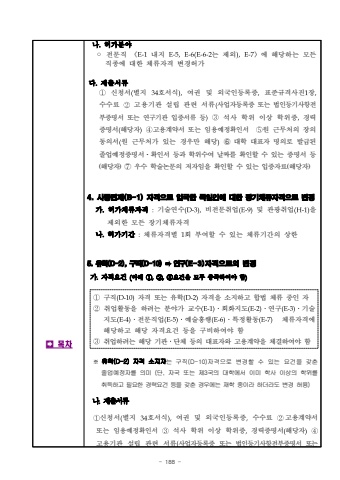 - 188 %uf000%ub098.%ud5c8%uac00%ubd84%uc57c%u25e6%uc804%ubb38%uc9c1 %u300aE-1%ub0b4%uc9c0 E-5,E-6(E-6-2%ub294 %uc81c%uc678),E-7%u300b%uc5d0 %ud574%ub2f9%ud558%ub294 %ubaa8%ub4e0 %uc9c1%uc885%uc5d0 %ub300%ud55c %uccb4%ub958%uc790%uaca9 %ubcc0%uacbd%ud5c8%uac00%ub2e4.%uc81c%ucd9c%uc11c%ub958%u2460%uc2e0%uccad%uc11c(%ubcc4%uc9c0 34%ud638%uc11c%uc2dd),%uc5ec%uad8c %ubc0f %uc678%uad6d%uc778%ub4f1%ub85d%uc99d,%ud45c%uc900%uaddc%uaca9%uc0ac%uc9c41%uc7a5,%uc218%uc218%ub8cc%u2461%uace0%uc6a9%uae30%uad00 %uc124%ub9bd %uad00%ub828 %uc11c%ub958(%uc0ac%uc5c5%uc790%ub4f1%ub85d%uc99d %ub610%ub294 %ubc95%uc778%ub4f1%uae30%uc0ac%ud56d%uc804%ubd80%uc99d%uba85%uc11c %ub610%ub294 %uc5f0%uad6c%uae30%uad00 %uc785%uc99d%uc11c%ub958%ub4f1)%u2462%uc11d%uc0ac %ud559%uc704 %uc774%uc0c1 %ud559%uc704%uc99d,%uacbd%ub825%uc99d%uba85%uc11c(%ud574%ub2f9%uc790)%u2463%uace0%uc6a9%uacc4%uc57d%uc11c %ub610%ub294 %uc784%uc6a9%uc608%uc815%ud655%uc778%uc11c%u2464%uc6d0 %uadfc%ubb34%ucc98%uc758 %uc7a5%uc758 %ub3d9%uc758%uc11c(%uc6d0 %uadfc%ubb34%ucc98%uac00 %uc788%ub294 %uacbd%uc6b0%ub9cc %ud574%ub2f9)%u2785 %ub300%ud559 %ub300%ud45c%uc790 %uba85%uc758%ub85c %ubc1c%uae09%ub41c %uc878%uc5c5%uc608%uc815%uc99d%uba85%uc11c%u00b7%ud655%uc778%uc11c %ub4f1%uacfc %ud559%uc704%uc218%uc5ec %ub0a0%uc9dc%ub97c %ud655%uc778%ud560 %uc218 %uc788%ub294%uc99d%uba85%uc11c%ub4f1(%ud574%ub2f9%uc790)%u2466 %uc6b0%uc218 %ud559%uc220%ub17c%ubb38%uc758 %uc800%uc790%uc784%uc744 %ud655%uc778%ud560 %uc218 %uc788%ub294 %uc785%uc99d%uc790%ub8cc(%ud574%ub2f9%uc790)4. %uc0ac%uc99d%uba74%uc81c(B-1) %uc790%uaca9%uc73c%ub85c %uc785%uad6d%ud55c %ub3c5%uc77c%uc778%uc5d0 %ub300%ud55c %uc7a5%uae30%uccb4%ub958%uc790%uaca9%uc73c%ub85c %ubcc0%uacbd%uac00.%ud5c8%uac00%uccb4%ub958%uc790%uaca9:%uae30%uc220%uc5f0%uc218(D-3),%ube44%uc804%ubb38%ucde8%uc5c5(E-9)%ubc0f %uad00%uad11%ucde8%uc5c5(H-1)%uc744%uc81c%uc678%ud55c %ubaa8%ub4e0 %uc7a5%uae30%uccb4%ub958%uc790%uaca9%ub098.%ud5c8%uac00%uae30%uac04:%uccb4%ub958%uc790%uaca9%ubcc4 1%ud68c %ubd80%uc5ec%ud560 %uc218 %uc788%ub294 %uccb4%ub958%uae30%uac04%uc758 %uc0c1%ud55c5. %uc720%ud559(D-2), %uad6c%uc9c1(D-10) %u27a0 %uc5f0%uad6c(E-3)%uc790%uaca9%uc73c%ub85c%uc758 %ubcc0%uacbd%uac00.%uc790%uaca9%uc694%uac74 (%uc544%ub798 %u2460,%u2461,%u2462%uc694%uac74%uc744 %ubaa8%ub450 %ucda9%uc871%ud558%uc5ec%uc57c %ud568)%u2460%uad6c%uc9c1(D-10)%uc790%uaca9 %ub610%ub294 %uc720%ud559(D-2)%uc790%uaca9%uc744 %uc18c%uc9c0%ud558%uace0 %ud569%ubc95 %uccb4%ub958 %uc911%uc778 %uc790%u2461%ucde8%uc5c5%ud65c%ub3d9%uc744 %ud558%ub824%ub294 %ubd84%uc57c%uac00 %uad50%uc218(E-1)%u2024%ud68c%ud654%uc9c0%ub3c4(E-2)%u2024%uc5f0%uad6c(E-3)%u2024%uae30%uc220%uc9c0%ub3c4(E-4)%u2024%uc804%ubb38%uc9c1%uc5c5(E-5)%u2024%uc608%uc220%ud765%ud589(E-6)%u2024%ud2b9%uc815%ud65c%ub3d9(E-7)%uccb4%ub958%uc790%uaca9%uc5d0%ud574%ub2f9%ud558%uace0 %ud574%ub2f9 %uc790%uaca9%uc694%uac74 %ub4f1%uc744 %uad6c%ube44%ud558%uc5ec%uc57c %ud568%u2462%ucde8%uc5c5%ud558%ub824%ub294 %ud574%ub2f9 %uae30%uad00%u2024%ub2e8%uccb4 %ub4f1%uc758 %ub300%ud45c%uc790%uc640 %uace0%uc6a9%uacc4%uc57d%uc744 %uccb4%uacb0%ud558%uc5ec%uc57c %ud568%u203b %uc720%ud559(D-2) %uc790%uaca9 %uc18c%uc9c0%uc790%ub294 %uad6c%uc9c1(D-10)%uc790%uaca9%uc73c%ub85c %ubcc0%uacbd%ud560 %uc218 %uc788%ub294 %uc694%uac74%uc744 %uac16%ucd98 %uc878%uc5c5%uc608%uc815%uc790%ub97c %uc758%ubbf8 (%ub2e8, %uc790%uad6d %ub610%ub294 %uc81c3%uad6d%uc758 %ub300%ud559%uc5d0%uc11c %uc774%ubbf8 %ud559%uc0ac %uc774%uc0c1%uc758 %ud559%uc704%ub97c %ucde8%ub4dd%ud558%uace0 %ud544%uc694%ud55c %uacbd%ub825%uc694%uac74 %ub4f1%uc744 %uac16%ucd98 %uacbd%uc6b0%uc5d0%ub294%uc7ac%ud559 %uc911%uc774%ub77c %ud558%ub354%ub77c%ub3c4 %ubcc0%uacbd %ud5c8%uc6a9)%ub098.%uc81c%ucd9c%uc11c%ub958%u2460%uc2e0%uccad%uc11c(%ubcc4%uc9c0 34%ud638%uc11c%uc2dd),%uc5ec%uad8c %ubc0f %uc678%uad6d%uc778%ub4f1%ub85d%uc99d,%uc218%uc218%ub8cc%u2461%uace0%uc6a9%uacc4%uc57d%uc11c %ub610%ub294 %uc784%uc6a9%uc608%uc815%ud655%uc778%uc11c%u2462%uc11d%uc0ac %ud559%uc704 %uc774%uc0c1 %ud559%uc704%uc99d,%uacbd%ub825%uc99d%uba85%uc11c(%ud574%ub2f9%uc790)%u2463%uace0%uc6a9%uae30%uad00 %uc124%ub9bd %uad00%ub828 %uc11c%ub958(%uc0ac%uc5c5%uc790%ub4f1%ub85d%uc99d %ub610%ub294 %ubc95%uc778%ub4f1%uae30%uc0ac%ud56d%uc804%ubd80%uc99d%uba85%uc11c %ub610%ub294