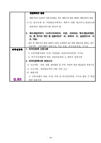 - 190 %uc7ac%uc785%uad6d%ud5c8%uac00 %uba74%uc81c-%uccb4%ub958%uae30%uac04%uc774 1%ub144%ubcf4%ub2e4 %uc801%uac8c %ub0a8%uc544%uc788%ub294 %uacbd%uc6b0 %uccb4%ub958%uae30%uac04 %ubc94%uc704 %ub0b4%uc5d0%uc11c %uc7ac%uc785%uad6d%ud5c8%uac00 %uba74%uc81c%u203b%ub2e8,%uc785%uad6d%uaddc%uc81c %ubc0f %uc0ac%uc99d%ubc1c%uae09%uaddc%uc81c%uc790%ub294 %uccb4%ub958%uc9c0 %uad00%ud560 %uccad(%uc0ac%ubb34%uc18c%u00b7%ucd9c%uc7a5%uc18c)%uc5d0 %ubc29%ubb38%ud558%uc5ec %uc7ac%uc785%uad6d%ud5c8%uac00%ub97c %ubc1b%uc544%uc57c %ud5682. %ubcf5%uc218%uc7ac%uc785%uad6d%ud5c8%uac00 (%uc0ac%uc6b0%ub514%uc544%ub77c%ube44%uc544, %uc774%ub780, %ub9ac%ube44%uc544%ub294 %ubcf5%uc218%uc7ac%uc785%uad6d%uc81c%ud55c. %ub2e8, %ub3d9 %uad6d%uac00%uc758 %uad6d%ubbfc %uc911 %uacb0%ud63c%uc774%ubbfc(F%u00ad6), %uc720%ud559(D%u00ad2), %uc77c%ubc18%uc5f0%uc218(D%u00ad4)%ub294 %uac00%ub2a5)-%ucd9c%uad6d %ud6c4 %uccb4%ub958%uae30%uac04 %ubc94%uc704 %ub0b4%uc5d0%uc11c 1%ub144%uc744 %ucd08%uacfc%ud558%uc5ec 2%ub144 %ub0b4%uc5d0 %uc7ac%uc785%uad6d%uc744 %ud558%ub824%ub294 %uacbd%uc6b0-%uc2e0%uccad%uc11c%ub958 :%uc2e0%uccad%uc11c(%ubcc4%uc9c0 34%ud638%uc11c%uc2dd),%uc5ec%uad8c %uc6d0%ubcf8,%uc678%uad6d%uc778%ub4f1%ub85d%uc99d,%uc218%uc218%ub8cc%uc678%uad6d%uc778%ub4f1%ub85d%uf0001. %uc678%uad6d%uc778%ub4f1%ub85d %uc2e0%uccad%uc11c%ub958%u2460%uc2e0%uccad%uc11c(%ubcc4%uc9c034%ud638 %uc11c%uc2dd),%uc5ec%uad8c%uc6d0%ubcf8,%ud45c%uc900%uaddc%uaca9%uc0ac%uc9c41%uc7a5,%uc218%uc218%ub8cc%u2461%u2018%ubd80%uac00%uac00%uce58%uc138%ubc95%u2019%uc5d0 %ub530%ub978 %uc0ac%uc5c5%uc790%ub4f1%ub85d%uc99d %u2462%uccb4%ub958%uc9c0 %uc785%uc99d%uc11c%ub9582. %uc678%uad6d%uc778%ub4f1%ub85d%uc0ac%ud56d %ubcc0%uacbd%uc2e0%uace0%uac00.%uc2e0%uace0%uc0ac%ud56d :%uc131%uba85,%uc131%ubcc4,%uc0dd%ub144%uc6d4%uc77c %ubc0f %uad6d%uc801,%uc5ec%uad8c%uc758 %ubc88%ud638%u2027%ubc1c%uae09%uc77c%uc790%u2027%uc720%ud6a8%uae30%uac04%ub098.%uc2e0%uace0%uae30%ud55c :%ubcc0%uacbd%uc77c%ub85c%ubd80%ud130 15%uc77c %uc774%ub0b4 %uc2e0%uace0%ub2e4%uc81c%ucd9c%uc11c%ub958%u2460%uc2e0%uccad%uc11c(%ubcc4%uc9c0 34%ud638 %uc11c%uc2dd),%uc5ec%uad8c %ubc0f %uc678%uad6d%uc778%ub4f1%ub85d%uc99d%uc218%uc218%ub8cc %uc5c6%uc74c %ubcc0%uacbd%uad00%ub828 %uc785%uc99d%uc11c%ub958