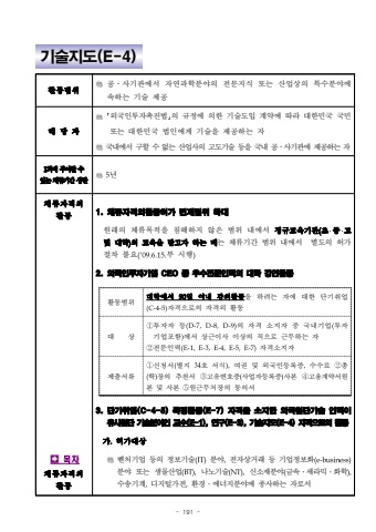 - 191 %uae30%uc220%uc9c0%ub3c4(E-4)%ud65c%ub3d9%ubc94%uc704%uacf5%u2024%uc0ac%uae30%uad00%uc5d0%uc11c %uc790%uc5f0%uacfc%ud559%ubd84%uc57c%uc758 %uc804%ubb38%uc9c0%uc2dd %ub610%ub294 %uc0b0%uc5c5%uc0c1%uc758 %ud2b9%uc218%ubd84%uc57c%uc5d0 %uc18d%ud558%ub294 %uae30%uc220 %uc81c%uacf5 %ud574%ub2f9%uc790%uff62%uc678%uad6d%uc778%ud22c%uc790%ucd09%uc9c4%ubc95%uff63%uc758 %uaddc%uc815%uc5d0 %uc758%ud55c %uae30%uc220%ub3c4%uc785 %uacc4%uc57d%uc5d0 %ub530%ub77c %ub300%ud55c%ubbfc%uad6d %uad6d%ubbfc %ub610%ub294 %ub300%ud55c%ubbfc%uad6d %ubc95%uc778%uc5d0%uac8c %uae30%uc220%uc744 %uc81c%uacf5%ud558%ub294 %uc790%uad6d%ub0b4%uc5d0%uc11c %uad6c%ud560 %uc218 %uc5c6%ub294 %uc0b0%uc5c5%uc0ac%uc758 %uace0%ub3c4%uae30%uc220 %ub4f1%uc744 %uad6d%ub0b4 %uacf5%u2024%uc0ac%uae30%uad00%uc5d0 %uc81c%uacf5%ud558%ub294 %uc7901%ud68c%uc5d0%ubd80%uc5ec%ud560%uc218%uc788%ub294%uccb4%ub958%uae30%uac04%uc0c1%ud55c5%ub144%uccb4%ub958%uc790%uaca9%uc678%ud65c%ub3d9%uf000%ubaa9%ucc28%uccb4%ub958%uc790%uaca9%uc678%ud65c%ub3d91. %uccb4%ub958%uc790%uaca9%uc678%ud65c%ub3d9%ud5c8%uac00 %uba74%uc81c%ubc94%uc704 %ud655%ub300%uc6d0%ub798%uc758 %uccb4%ub958%ubaa9%uc801%uc744 %uce68%ud574%ud558%uc9c0 %uc54a%uc740 %ubc94%uc704 %ub0b4%uc5d0%uc11c %uc815%uaddc%uad50%uc721%uae30%uad00(%ucd08%u2027%uc911%u2027%uace0 %ubc0f%ub300%ud559)%uc758 %uad50%uc721%uc744 %ubc1b%uace0%uc790 %ud558%ub294 %ub54c%ub294 %uccb4%ub958%uae30%uac04 %ubc94%uc704 %ub0b4%uc5d0%uc11c %ubcc4%ub3c4%uc758 %ud5c8%uac00 %uc808%ucc28 %ubd88%uc694(%u201809.6.15.%ubd80 %uc2dc%ud589)2. %uc678%uad6d%uc778%ud22c%uc790%uae30%uc5c5 CEO %ub4f1 %uc6b0%uc218%uc804%ubb38%uc778%ub825%uc758 %ub300%ud559 %uac15%uc5f0%ud65c%ub3d9%ud65c%ub3d9%ubc94%uc704%ub300%ud559%uc5d0%uc11c 90%uc77c %uc774%ub0b4 %uac15%uc758%ud65c%ub3d9%uc744 %ud558%ub824%ub294 %uc790%uc5d0 %ub300%ud55c %ub2e8%uae30%ucde8%uc5c5(C-4-5)%uc790%uaca9%uc73c%ub85c%uc758 %uc790%uaca9%uc678 %ud65c%ub3d9%ub300 %uc0c1%u2460%ud22c%uc790%uc790 %ub4f1(D-7,D-8,D-9)%uc758 %uc790%uaca9 %uc18c%uc9c0%uc790 %uc911 %uad6d%ub0b4%uae30%uc5c5(%ud22c%uc790%uae30%uc5c5%ud3ec%ud568)%uc5d0%uc11c %uc0c1%uadfc%uc774%uc0ac %uc774%uc0c1%uc758 %uc9c1%uc73c%ub85c %uadfc%ubb34%ud558%ub294 %uc790%u2461%uc804%ubb38%uc778%ub825(E-1,E-3,E-4,E-5,E-7)%uc790%uaca9%uc18c%uc9c0%uc790%uc81c%ucd9c%uc11c%ub958%u2460%uc2e0%uccad%uc11c(%ubcc4%uc9c0 34%ud638 %uc11c%uc2dd),%uc5ec%uad8c %ubc0f %uc678%uad6d%uc778%ub4f1%ub85d%uc99d,%uc218%uc218%ub8cc %u2461%ucd1d(%ud559)%uc7a5%uc758 %ucd94%ucc9c%uc11c %u2462%uace0%uc720%ubc88%ud638%uc99d(%uc0ac%uc5c5%uc790%ub4f1%ub85d%uc99d)%uc0ac%ubcf8 %u2463%uace0%uc6a9%uacc4%uc57d%uc11c%uc6d0%ubcf8 %ubc0f %uc0ac%ubcf8 %u2464%uc6d0%uadfc%ubb34%ucc98%uc7a5%uc758 %ub3d9%uc758%uc11c3.%ub2e8%uae30%ucde8%uc5c5(C-4-5) %ud2b9%uc815%ud65c%ub3d9(E-7) %uc790%uaca9%uc744 %uc18c%uc9c0%ud55c %uc678%uad6d%ucca8%ub2e8%uae30%uc220 %uc778%ub825%uc774 %uc720%uc0ac%ucca8%ub2e8 %uae30%uc220%ubd84%uc57c%uc778 %uad50%uc218(E-1), %uc5f0%uad6c(E-3), %uae30%uc220%uc9c0%ub3c4(E-4) %uc790%uaca9%uc73c%ub85c%uc758 %ud65c%ub3d9%uac00.%ud5c8%uac00%ub300%uc0c1%ubca4%ucc98%uae30%uc5c5 %ub4f1%uc758 %uc815%ubcf4%uae30%uc220(IT)%ubd84%uc57c,%uc804%uc790%uc0c1%uac70%ub798 %ub4f1 %uae30%uc5c5%uc815%ubcf4%ud654(e-business)%ubd84%uc57c %ub610%ub294 %uc0dd%ubb3c%uc0b0%uc5c5(BT),%ub098%ub178%uae30%uc220(NT),%uc2e0%uc18c%uc7ac%ubd84%uc57c(%uae08%uc18d%u2024%uc138%ub77c%ubbf9%u2024%ud654%ud559),%uc218%uc1a1%uae30%uacc4,%ub514%uc9c0%ud138%uac00%uc804,%ud658%uacbd%u2024%uc5d0%ub108%uc9c0%ubd84%uc57c%uc5d0 %uc885%uc0ac%ud558%ub294 %uc790%ub85c%uc11c