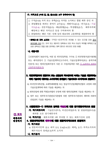 - 194 %uf000%uccb4%ub958%uc790%uaca9%ubcc0%uacbd%ud5c8%uac00%uac00.%uc790%uaca9%uc694%uac74 (%uc544%ub798 %u2460,%u2461,%u2462%uc694%uac74%uc744 %ubaa8%ub450 %ucda9%uc871%ud558%uc5ec%uc57c %ud568)%u2460%uad6c%uc9c1(D-10)%uc790%uaca9 %ub610%ub294 %uc720%ud559(D-2)%uc790%uaca9%uc744 %uc18c%uc9c0%ud558%uace0 %ud569%ubc95 %uccb4%ub958 %uc911%uc778 %uc790%u2461%ucde8%uc5c5%ud65c%ub3d9%uc744 %ud558%ub824%ub294 %ubd84%uc57c%uac00 %uad50%uc218(E-1)%u2024%ud68c%ud654%uc9c0%ub3c4(E-2)%u2024%uc5f0%uad6c(E-3)%u2024%uae30%uc220%uc9c0%ub3c4(E-4)%u2024%uc804%ubb38%uc9c1%uc5c5(E-5)%u2024%uc608%uc220%ud765%ud589(E-6)%u2024%ud2b9%uc815%ud65c%ub3d9(E-7)%uccb4%ub958%uc790%uaca9%uc5d0%ud574%ub2f9%ud558%uace0 %ud574%ub2f9 %uc790%uaca9%uc694%uac74 %ub4f1%uc744 %uad6c%ube44%ud558%uc5ec%uc57c %ud568%u2462%ucde8%uc5c5%ud558%ub824%ub294 %ud574%ub2f9 %uae30%uad00%u2024%ub2e8%uccb4 %ub4f1%uc758 %ub300%ud45c%uc790%uc640 %uace0%uc6a9%uacc4%uc57d%uc744 %uccb4%uacb0%ud558%uc5ec%uc57c %ud568%u203b%uc720%ud559(D-2) %uc790%uaca9 %uc18c%uc9c0%uc790%ub294 %uad6c%uc9c1(D-10)%uc790%uaca9%uc73c%ub85c %ubcc0%uacbd%ud560 %uc218 %uc788%ub294 %uc694%uac74%uc744 %uac16%ucd98 %uc878%uc5c5%uc608%uc815%uc790%ub97c %uc758%ubbf8(%ub2e8, %uc790%uad6d %ub610%ub294 %uc81c3%uad6d%uc758 %ub300%ud559%uc5d0%uc11c %uc774%ubbf8 %ud559%uc0ac %uc774%uc0c1%uc758 %ud559%uc704%ub97c %ucde8%ub4dd%ud558%uace0 %ud544%uc694%ud55c %uacbd%ub825%uc694%uac74 %ub4f1%uc744 %uac16%ucd98 %uacbd%uc6b0%uc5d0%ub294%uc7ac%ud559 %uc911%uc774%ub77c %ud558%ub354%ub77c%ub3c4 %ubcc0%uacbd %ud5c8%uc6a9)%ub098.%uc81c%ucd9c%uc11c%ub958%u2460%uc2e0%uccad%uc11c(%ubcc4%uc9c0 34%ud638%uc11c%uc2dd),%uc5ec%uad8c %ubc0f %uc678%uad6d%uc778%ub4f1%ub85d%uc99d,%uc218%uc218%ub8cc %u2461%ud30c%uacac%uba85%ub839%uc11c(%ubcf8%uc0ac%ubc1c%ud589)%ub610%ub294 %uc7ac%uc9c1%uc99d%uba85%uc11c%u2462%uae30%uc220%ub3c4%uc785%uacc4%uc57d%uc2e0%uace0%uc218%ub9ac%uc11c,%uae30%uc220%ub3c4%uc785%uacc4%uc57d%uc11c(%ub610%ub294 %uc6a9%uc5ed%uac70%ub798%uc778%uc99d%uc11c)%ub610%ub294 %ubc29%uc704%uc0b0%uc5c5%uccb4%uc9c0%uc815%uc11c %uc0ac%ubcf8 %u2463%uc0ac%uc5c5%uc790%ub4f1%ub85d%uc99d %uc0ac%ubcf8 %u2464%uc18c%uad00%ubd80%ucc98 %uc7a5%uad00%uc758 %uace0%uc6a9%ucd94%ucc9c%uc11c(%ud544%uc694%uc2dc)2. %uc790%uc5f0%uacfc%ud559%ubd84%uc57c%uc758 %uc804%ubb38%uc9c0%uc2dd %ub610%ub294 %uc0b0%uc5c5%uc0c1%uc758 %ud2b9%uc218%ubd84%uc57c%uc5d0 %uc18d%ud558%ub294 %uae30%uc220%uc744 %uc81c%uacf5%ud558%ub824%ub294 %uc544%ub798 %uae30%uc220%uc790%uc5d0 %ub300%ud558%uc5ec%ub294 %uc18c%uc9c0%uc790%uaca9%uc5d0 %uad00%uacc4%uc5c6%uc774 %uae30%uc220%uc9c0%ub3c4(E-4)%uc790%uaca9%uc73c%ub85c %ubcc0%uacbd%ud5c8%uac00%uc678%uad6d%uc778%ud22c%uc790%ucd09%uc9c4%ubc95,%uc870%uc138%ud2b9%ub840%uc81c%ud55c%ubc95 %ub610%ub294 %ud56d%uacf5%uc6b0%uc8fc%uc0b0%uc5c5%uac1c%ubc1c%ucd09%uc9c4%ubc95%uc758 %uaddc%uc815%uc5d0 %uc758%ud55c %uae30%uc220%ub3c4%uc785%uacc4%uc57d%uc5d0 %ub530%ub77c %uae30%uc220%uc744 %uc81c%uacf5%ud558%ub294 %uc790%ubc29%uc704%uc0b0%uc5c5%uc5d0 %uad00%ud55c %ud2b9%ubcc4%uc870%uce58%ubc95%uc758 %uaddc%uc815%uc5d0 %uc758%ud55c %ubc29%uc704%uc0b0%uc5c5%uccb4%uc5d0 %uae30%uc220%uc744 %uc81c%uacf5%ud558%ub294 %uc790%uc815%ubd80 %ub610%ub294 %uc815%ubd80%ud22c%uc790%uae30%uad00%uad00%ub9ac%uae30%ubcf8%ubc95%uc5d0 %uc758%ud55c %uc815%ubd80%ud22c%uc790%uae30%uad00%uacfc%uc758 %uacc4%uc57d%uc5d0 %uc758%ud558%uc5ec%uc0b0%uc5c5%uc0c1%uc758 %uae30%uc220%uc744 %uc81c%uacf5%ud558%ub294 %uc7903. %uc0ac%uc99d%uba74%uc81c(B-1) %uc790%uaca9%uc73c%ub85c %uc785%uad6d%ud55c %ub3c5%uc77c%uc778%uc5d0 %ub300%ud55c %uc7a5%uae30%uccb4%ub958%uc790%uaca9%uc73c%ub85c %ubcc0%uacbd%uac00.%ud5c8%uac00%uccb4%ub958%uc790%uaca9:%uae30%uc220%uc5f0%uc218(D-3),%ube44%uc804%ubb38%ucde8%uc5c5(E-9)%ubc0f %uad00%uad11%ucde8%uc5c5(H-1)%uc744%uc81c%uc678%ud55c %ubaa8%ub4e0 %uc7a5%uae30%uccb4%ub958%uc790%uaca9%ub098.%ud5c8%uac00%uae30%uac04:%uccb4%ub958%uc790%uaca9%ubcc4 1%ud68c %ubd80%uc5ec%ud560 %uc218 %uc788%ub294 %uccb4%ub958%uae30%uac04%uc758 %uc0c1%ud55c4. %uc804%ubb38%uc678%uad6d%uc778%ub825%uc758 %ubc30%uc6b0%uc790%uc5d0 %ub300%ud55c %uc804%ubb38%uc9c1%uc790%uaca9%uc73c%ub85c%uc758 %ubcc0%uacbd%ud5c8%uac00%uac00.%ud5c8%uac00%ub300%uc0c1%uc804%ubb38%uc678%uad6d%uc778%ub825%u300aE-1%ub0b4%uc9c0 E-5,E-6(E-6-2%ub294 %uc81c%uc678),E-7%u300b%uc790%uaca9%uc18c%uc9c0%uc790%uc758 %ubc30%uc6b0%uc790%ub85c%uc11c %ub3d9%ubc18(F-3)%uc790%uaca9 %uc18c%uc9c0%uc790%ub098.%ud5c8%uac00%ubd84%uc57c