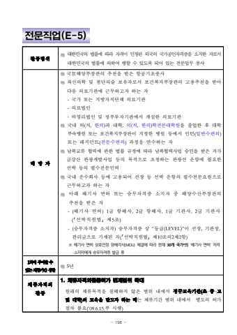 - 196 %uc804%ubb38%uc9c1%uc5c5(E-5)%ud65c%ub3d9%ubc94%uc704%ub300%ud55c%ubbfc%uad6d%uc758 %ubc95%ub960%uc5d0 %ub530%ub77c %uc790%uaca9%uc774 %uc778%uc815%ub41c %uc678%uad6d%uc758 %uad6d%uac00%uacf5%uc778%uc790%uaca9%uc99d%uc744 %uc18c%uc9c0%ud55c %uc790%ub85c%uc11c %ub300%ud55c%ubbfc%uad6d%uc758 %ubc95%ub960%uc5d0 %uc758%ud558%uc5ec %ud589%ud560 %uc218 %uc788%ub3c4%ub85d %ub418%uc5b4 %uc788%ub294 %uc804%ubb38%uc5c5%ubb34 %uc885%uc0ac%ud574%ub2f9%uc790%uad6d%ud1a0%ud574%uc591%ubd80%uc7a5%uad00%uc758 %ucd94%ucc9c%uc744 %ubc1b%uc740 %ud56d%uacf5%uae30%uc870%uc885%uc0ac%ucd5c%uc2e0%uc758%ud559 %ubc0f %ucca8%ub2e8%uc758%uc220 %ubcf4%uc720%uc790%ub85c%uc11c %ubcf4%uac74%ubcf5%uc9c0%ubd80%uc7a5%uad00%uc758 %uace0%uc6a9%ucd94%ucc9c%uc744 %ubc1b%uc544 %ub2e4%uc74c %uc758%ub8cc%uae30%uad00%uc5d0 %uadfc%ubb34%ud558%uace0%uc790 %ud558%ub294 %uc790-%uad6d%uac00 %ub610%ub294 %uc9c0%ubc29%uc790%uce58%ub2e8%uccb4 %uc758%ub8cc%uae30%uad00-%uc758%ub8cc%ubc95%uc778-%ube44%uc601%ub9ac%ubc95%uc778 %ubc0f %uc815%ubd80%ud22c%uc790%uae30%uad00%uc5d0%uc11c %uac1c%uc124%ud55c %uc758%ub8cc%uae30%uad00%uad6d%ub0b4 %uc758(%uce58,%ud55c%uc758)%uacfc %ub300%ud559,%uc758(%uce58,%ud55c%uc758)%ud559%uc804%ubb38%ub300%ud559%uc6d0%uc744 %uc878%uc5c5%ud55c %ud6c4 %ub300%ud559 %ubd80%uc18d%ubcd1%uc6d0 %ub610%ub294 %ubcf4%uac74%ubcf5%uc9c0%ubd80%uc7a5%uad00%uc774 %uc9c0%uc815%ud55c %ubcd1%uc6d0 %ub4f1%uc5d0%uc11c %uc778%ud134(%uc77c%ubc18%uc218%ub828%uc758)%ub610%ub294 %ub808%uc9c0%ub358%ud2b8(%uc804%ubb38%uc218%ub828%uc758)%uacfc%uc815%uc744 %uc5f0%uc218%ud558%ub294 %uc790%ub0a8%ubd81%uad50%ub958 %ud611%ub825%uc5d0 %uad00%ud55c %ubc95%ub960 %uaddc%uc815%uc5d0 %ub530%ub77c %ub0a8%ubd81%ud611%ub825%uc0ac%uc5c5 %uc2b9%uc778%uc744 %ubc1b%uc740 %uc790%uac00 %uae08%uac15%uc0b0%uad00%uad11%uac1c%ubc1c%uc0ac%uc5c5 %ub4f1%uc758 %ubaa9%uc801%uc73c%ub85c %ucd08%uccad%ud558%ub294 %uad00%uad11%uc120 %uc6b4%ud56d%uc5d0 %ud544%uc694%ud55c%uc120%ubc15 %ub4f1%uc758 %ud544%uc218%uc804%ubb38%uc778%ub825%uad6d%ub0b4 %uc6b4%uc218%ud68c%uc0ac %ub4f1%uc5d0 %uace0%uc6a9%ub418%uc5b4 %uc120%uc7a5 %ub4f1 %uc120%ubc15 %uc6b4%ud56d%uc758 %ud544%uc218%uc804%ubb38%uc694%uc6d0%uc73c%ub85c %uadfc%ubb34%ud558%uace0%uc790 %ud558%ub294 %uc790%uc544%ub798 %ud574%uae30%uc0ac %uba74%ud5c8 %ub610%ub294 %uc2b9%ubb34%uc790%uaca9%uc99d %uc18c%uc9c0%uc790 %uc911 %ud574%uc591%uc218%uc0b0%ubd80%uc7a5%uad00%uc758 %ucd94%ucc9c%uc744 %ubc1b%uc740 %uc790-(%ud574%uae30%uc0ac %uba74%ud5c8)1%uae09 %ud56d%ud574%uc0ac,2%uae09 %ud56d%ud574%uc0ac,1%uae09 %uae30%uad00%uc0ac,2%uae09 %uae30%uad00%uc0ac(%uc120%ubc15%uc9c1%uc6d0%ubc95%uff63%uc81c5%uc870)-(%uc2b9%ubb34%uc790%uaca9%uc99d %uc18c%uc9c0%uc790)%uc2b9%ubb34%uc790%uaca9%uc99d %uc0c1 %u201c%ub4f1%uae09(LEVEL)%u201d%uc774 %uc120%uc7a5,%uae30%uad00%uc7a5,%uad00%ub9ac%uae09%uc73c%ub85c %uae30%uc7ac%ub41c %uc790(%uc120%ubc15%uc9c1%uc6d0%ubc95%uff63%uc81c10%uc870%uc7582%uc81c2%ud56d)%u203b%ud574%uae30%uc0ac %uba74%ud5c8 %uc0c1%ud638%uc778%uc815 %uc591%ud574%uac01%uc11c(MOU) %uccb4%uacb0%uc5d0 %ub530%ub77c %ud604%uc7ac 30%uac1c %uad6d%uac00*%uc758%u2018%ud574%uae30%uc0ac %uba74%ud5c8%u2019 %uc790%uaca9 %uc18c%uc9c0%uc790%uc5d0%uac8c %uc2b9%ubb34%uc790%uaca9%uc99d %ubc1c%uae09 %uc9111%ud68c%uc5d0%ubd80%uc5ec%ud560%uc218%uc788%ub294%uccb4%ub958%uae30%uac04%uc0c1%ud55c5%ub144%uccb4%ub958%uc790%uaca9%uc678%ud65c%ub3d91. %uccb4%ub958%uc790%uaca9%uc678%ud65c%ub3d9%ud5c8%uac00 %uba74%uc81c%ubc94%uc704 %ud655%ub300%uc6d0%ub798%uc758 %uccb4%ub958%ubaa9%uc801%uc744 %uce68%ud574%ud558%uc9c0 %uc54a%uc740 %ubc94%uc704 %ub0b4%uc5d0%uc11c %uc815%uaddc%uad50%uc721%uae30%uad00(%ucd08%u2027%uc911%u2027%uace0 %ubc0f%ub300%ud559)%uc758 %uad50%uc721%uc744 %ubc1b%uace0%uc790 %ud558%ub294 %ub54c%ub294 %uccb4%ub958%uae30%uac04 %ubc94%uc704 %ub0b4%uc5d0%uc11c %ubcc4%ub3c4%uc758 %ud5c8%uac00 %uc808%ucc28 %ubd88%uc694(%u201909.6.15.%ubd80 %uc2dc%ud589)