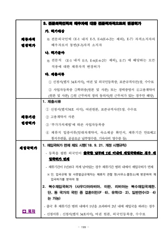- 199 %uccb4%ub958%uc790%uaca9%ubcc0%uacbd%ud5c8%uac003. %uc804%ubb38%uc678%uad6d%uc778%ub825%uc758 %ubc30%uc6b0%uc790%uc5d0 %ub300%ud55c %uc804%ubb38%uc9c1%uc790%uaca9%uc73c%ub85c%uc758 %ubcc0%uacbd%ud5c8%uac00%uac00.%ud5c8%uac00%ub300%uc0c1%uc804%ubb38%uc678%uad6d%uc778%ub825%u300aE-1%ub0b4%uc9c0 E-5,E-6(E-6-2%ub294 %uc81c%uc678),E-7%u300b%uc790%uaca9%uc18c%uc9c0%uc790%uc758 %ubc30%uc6b0%uc790%ub85c%uc11c %ub3d9%ubc18(F-3)%uc790%uaca9 %uc18c%uc9c0%uc790%ub098.%ud5c8%uac00%ubd84%uc57c%uc804%ubb38%uc9c1 %u300aE-1%ub0b4%uc9c0 E-5,E-6(E-6-2%ub294 %uc81c%uc678),E-7%u300b%uc5d0 %ud574%ub2f9%ud558%ub294 %ubaa8%ub4e0 %uc9c1%uc885%uc5d0 %ub300%ud55c %uccb4%ub958%uc790%uaca9 %ubcc0%uacbd%ud5c8%uac00%ub2e4.%uc81c%ucd9c%uc11c%ub958%u2460%uc2e0%uccad%uc11c(%ubcc4%uc9c0 34%ud638%uc11c%uc2dd),%uc5ec%uad8c %ubc0f %uc678%uad6d%uc778%ub4f1%ub85d%uc99d,%ud45c%uc900%uaddc%uaca9%uc0ac%uc9c41%uc7a5,%uc218%uc218%ub8cc%u2461%uc0ac%uc5c5%uc790%ub4f1%ub85d%uc99d %u2462%ud559%uc704%uc99d(%uc6d0%ubcf8 %ubc0f %uc0ac%ubcf8)%ub610%ub294 %uacbd%ub825%uc99d%uba85%uc11c %u2463%uace0%uc6a9%uacc4%uc57d%uc11c (%uc6d0%ubcf8 %ubc0f %uc0ac%ubcf8)%u2464%uc6d0 %uadfc%ubb34%ucc98%uc758 %uc7a5%uc758 %ub3d9%uc758%uc11c(%uc6d0 %uadfc%ubb34%ucc98%uac00 %uc788%ub294 %uacbd%uc6b0%ub9cc %ud574%ub2f9)%uccb4%ub958%uae30%uac04%uc5f0%uc7a5%ud5c8%uac001. %uc81c%ucd9c%uc11c%ub958%u2460%uc2e0%uccad%uc11c(%ubcc4%uc9c034%ud638 %uc11c%uc2dd),%uc5ec%uad8c%uc6d0%ubcf8,%ud45c%uc900%uaddc%uaca9%uc0ac%uc9c41%uc7a5,%uc218%uc218%ub8cc%u2461%uace0%uc6a9%uacc4%uc57d%uc11c %uc0ac%ubcf8%u2462%u2018%ubd80%uac00%uac00%uce58%uc138%ubc95%u2019%uc5d0 %ub530%ub978 %uc0ac%uc5c5%uc790%ub4f1%ub85d%uc99d %u2463%uccb4%ub958%uc9c0 %uc785%uc99d%uc11c%ub958(%uc784%ub300%ucc28%uacc4%uc57d%uc11c,%uc219%uc18c%uc81c%uacf5 %ud655%uc778%uc11c,%uccb4%ub958%uae30%uac04 %ub9cc%ub8cc%uc608%uace0 %ud1b5%uc9c0%uc6b0%ud3b8%ubb3c,%uacf5%uacf5%uc694%uae08 %ub0a9%ubd80%uc601%uc218%uc99d,%uae30%uc219%uc0ac%ube44 %uc601%uc218%uc99d %ub4f1)%uc7ac%uc785%uad6d%ud5c8%uac00%uf000%ubaa9%ucc281. %uc7ac%uc785%uad6d%ud5c8%uac00 %uba74%uc81c %uc81c%ub3c4 %uc2dc%ud589(%u201918. 9. 21. %uac1c%uc815 %uc2dc%ud589%uaddc%uce59)-%ub4f1%ub85d%uc744 %ud544%ud55c %uc678%uad6d%uc778%uc774 %ucd9c%uad6d%ud55c %ub0a0%ubd80%ud130 1%ub144 %uc774%ub0b4%uc5d0 %uc7ac%uc785%uad6d%ud558%ub824%ub294%uacbd%uc6b0 %uc7ac%uc785%uad6d%ud5c8%uac00 %uba74%uc81c-%uccb4%ub958%uae30%uac04%uc774 1%ub144%ubcf4%ub2e4 %uc801%uac8c %ub0a8%uc544%uc788%ub294 %uacbd%uc6b0 %uccb4%ub958%uae30%uac04 %ubc94%uc704 %ub0b4%uc5d0%uc11c %uc7ac%uc785%uad6d%ud5c8%uac00 %uba74%uc81c%u203b %ub2e8, %uc785%uad6d%uaddc%uc81c %ubc0f %uc0ac%uc99d%ubc1c%uae09%uaddc%uc81c%uc790%ub294 %uccb4%ub958%uc9c0 %uad00%ud560 %uccad(%uc0ac%ubb34%uc18c%u00b7%ucd9c%uc7a5%uc18c)%uc5d0 %ubc29%ubb38%ud558%uc5ec %uc7ac%uc785%uad6d%ud5c8%uac00%ub97c %ubc1b%uc544%uc57c %ud5682. %ubcf5%uc218%uc7ac%uc785%uad6d%ud5c8%uac00 (%uc0ac%uc6b0%ub514%uc544%ub77c%ube44%uc544, %uc774%ub780, %ub9ac%ube44%uc544%ub294 %ubcf5%uc218%uc7ac%uc785%uad6d%uc81c%ud55c. %ub2e8, %ub3d9 %uad6d%uac00%uc758 %uad6d%ubbfc %uc911 %uacb0%ud63c%uc774%ubbfc(F%u00ad6), %uc720%ud559(D%u00ad2), %uc77c%ubc18%uc5f0%uc218(D%u00ad4)%ub294 %uac00%ub2a5)-%ucd9c%uad6d %ud6c4 %uccb4%ub958%uae30%uac04 %ubc94%uc704 %ub0b4%uc5d0%uc11c 1%ub144%uc744 %ucd08%uacfc%ud558%uc5ec 2%ub144 %ub0b4%uc5d0 %uc7ac%uc785%uad6d%uc744 %ud558%ub824%ub294 %uacbd%uc6b0-%uc2e0%uccad%uc11c%ub958 :%uc2e0%uccad%uc11c(%ubcc4%uc9c0 34%ud638%uc11c%uc2dd),%uc5ec%uad8c %uc6d0%ubcf8,%uc678%uad6d%uc778%ub4f1%ub85d%uc99d,%uc218%uc218%ub8cc