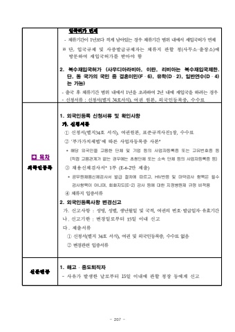 - 207 %uc785%uad6d%ud5c8%uac00 %uba74%uc81c-%uccb4%ub958%uae30%uac04%uc774 1%ub144%ubcf4%ub2e4 %uc801%uac8c %ub0a8%uc544%uc788%ub294 %uacbd%uc6b0 %uccb4%ub958%uae30%uac04 %ubc94%uc704 %ub0b4%uc5d0%uc11c %uc7ac%uc785%uad6d%ud5c8%uac00 %uba74%uc81c%u203b%ub2e8,%uc785%uad6d%uaddc%uc81c %ubc0f %uc0ac%uc99d%ubc1c%uae09%uaddc%uc81c%uc790%ub294 %uccb4%ub958%uc9c0 %uad00%ud560 %uccad(%uc0ac%ubb34%uc18c%u00b7%ucd9c%uc7a5%uc18c)%uc5d0 %ubc29%ubb38%ud558%uc5ec %uc7ac%uc785%uad6d%ud5c8%uac00%ub97c %ubc1b%uc544%uc57c %ud5682. %ubcf5%uc218%uc7ac%uc785%uad6d%ud5c8%uac00 (%uc0ac%uc6b0%ub514%uc544%ub77c%ube44%uc544, %uc774%ub780, %ub9ac%ube44%uc544%ub294 %ubcf5%uc218%uc7ac%uc785%uad6d%uc81c%ud55c. %ub2e8, %ub3d9 %uad6d%uac00%uc758 %uad6d%ubbfc %uc911 %uacb0%ud63c%uc774%ubbfc(F%u00ad6), %uc720%ud559(D%u00ad2), %uc77c%ubc18%uc5f0%uc218(D%u00ad4)%ub294 %uac00%ub2a5)-%ucd9c%uad6d %ud6c4 %uccb4%ub958%uae30%uac04 %ubc94%uc704 %ub0b4%uc5d0%uc11c 1%ub144%uc744 %ucd08%uacfc%ud558%uc5ec 2%ub144 %ub0b4%uc5d0 %uc7ac%uc785%uad6d%uc744 %ud558%ub824%ub294 %uacbd%uc6b0-%uc2e0%uccad%uc11c%ub958 :%uc2e0%uccad%uc11c(%ubcc4%uc9c0 34%ud638%uc11c%uc2dd),%uc5ec%uad8c %uc6d0%ubcf8,%uc678%uad6d%uc778%ub4f1%ub85d%uc99d,%uc218%uc218%ub8cc%uf000%ubaa9%ucc28%uc678%uad6d%uc778%ub4f1%ub85d1. %uc678%uad6d%uc778%ub4f1%ub85d %uc2e0%uccad%uc11c%ub958 %ubc0f %ud655%uc778%uc0ac%ud56d%uac00.%uc2e0%uccad%uc11c%ub958%u2460%uc2e0%uccad%uc11c(%ubcc4%uc9c034%ud638 %uc11c%uc2dd),%uc5ec%uad8c%uc6d0%ubcf8,%ud45c%uc900%uaddc%uaca9%uc0ac%uc9c41%uc7a5,%uc218%uc218%ub8cc%u2461%u2018%ubd80%uac00%uac00%uce58%uc138%ubc95%u2019%uc5d0 %ub530%ub978 %uc0ac%uc5c5%uc790%ub4f1%ub85d%uc99d %uc0ac%ubcf8** %ud574%ub2f9 %uc678%uad6d%uc778%uc744 %uace0%uc6a9%ud55c %ub2e8%uccb4 %ubc0f %uae30%uc5c5 %ub4f1%uc758 %uc0ac%uc5c5%uc790%ub4f1%ub85d%uc99d %ub610%ub294 %uace0%uc720%ubc88%ud638%uc99d %ub4f1 (%uc9c1%uc811 %uace0%uc6a9%uad00%uacc4%uac00 %uc5c6%ub294 %uacbd%uc6b0%uc5d0%ub294 %ucd08%uccad%ub2e8%uccb4 %ub610%ub294 %uc18c%uc18d %ub2e8%uccb4 %ub4f1%uc758 %uc0ac%uc5c5%uc790%ub4f1%ub85d%uc99d %ub4f1)%u2462%ucc44%uc6a9%uc2e0%uccb4%uac80%uc0ac%uc11c*1%ubd80 (E-6-2%ub9cc %uc81c%ucd9c)* %uacf5%ubb34%uc6d0%ucc44%uc6a9%uc2e0%uccb4%uac80%uc0ac%uc11c %ubc1c%uae09 %uc808%ucc28%uc5d0 %ub530%ub974%uace0, HIV%ubc18%uc751 %ubc0f %ub9c8%uc57d%uac80%uc0ac %ud56d%ubaa9%uc740 %ud544%uc218 %uac80%uc0ac%ud56d%ubaa9%uc774 %uc544%ub2c8%uba70, %ud68c%ud654%uc9c0%ub3c4(E-2) %uac15%uc0ac %ub4f1%uc5d0 %ub300%ud55c %uc9c0%uc815%ubcd1%uc6d0%uc81c %uaddc%uc815 %ube44%uc801%uc6a9%u2463 %uccb4%ub958%uc9c0 %uc785%uc99d%uc11c%ub9582. %uc678%uad6d%uc778%ub4f1%ub85d%uc0ac%ud56d %ubcc0%uacbd%uc2e0%uace0%uac00.%uc2e0%uace0%uc0ac%ud56d :%uc131%uba85,%uc131%ubcc4,%uc0dd%ub144%uc6d4%uc77c %ubc0f %uad6d%uc801,%uc5ec%uad8c%uc758 %ubc88%ud638%u2027%ubc1c%uae09%uc77c%uc790%u2027%uc720%ud6a8%uae30%uac04%ub098.%uc2e0%uace0%uae30%ud55c :%ubcc0%uacbd%uc77c%ub85c%ubd80%ud130 15%uc77c %uc774%ub0b4 %uc2e0%uace0%ub2e4.%uc81c%ucd9c%uc11c%ub958%u2460%uc2e0%uccad%uc11c(%ubcc4%uc9c0 34%ud638 %uc11c%uc2dd),%uc5ec%uad8c %ubc0f %uc678%uad6d%uc778%ub4f1%ub85d%uc99d,%uc218%uc218%ub8cc %uc5c6%uc74c%u2461%ubcc0%uacbd%uad00%ub828 %uc785%uc99d%uc11c%ub958%uc2e0%ubd84%ubcc0%ub3d91. %ud574%uace0 %u2024 %uc911%ub3c4%ud1f4%uc9c1%uc790 - %uc0ac%uc720%uac00 %ubc1c%uc0dd%ud55c %ub0a0%ub85c%ubd80%ud130 15%uc77c %uc774%ub0b4%uc5d0 %uad00%ud560 %uccad%uc7a5 %ub4f1%uc5d0%uac8c %uc2e0%uace0