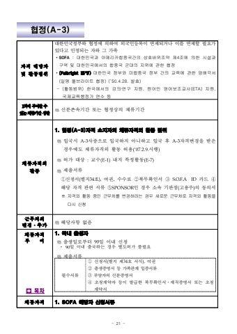- 21 -%ud611%uc815(A-3)%uc790%uaca9%ud574%ub2f9%uc790%ubc0f%ud65c%ub3d9%ubc94%uc704%ub300%ud55c%ubbfc%uad6d%uc815%ubd80%uc640 %ud611%uc815%uc5d0 %uc758%ud558%uc5ec %uc678%uad6d%uc778%ub4f1%ub85d%uc774 %uba74%uc81c%ub418%uac70%ub098 %uc774%ub97c %uba74%uc81c%ud560 %ud544%uc694%uac00 %uc788%ub2e4%uace0 %uc778%uc815%ub418%ub294 %uc790%uc640 %uadf8 %uac00%uc871%uf000SOFA: %ub300%ud55c%ubbfc%uad6d%uacfc %uc544%uba54%ub9ac%uce74%ud569%uc911%uad6d%uac04%uc758 %uc0c1%ud638%ubc14%uc704%uc870%uc57d %uc81c4%uc870%uc5d0 %uc758%ud55c %uc2dc%uc124%uacfc %uad6c%uc5ed %ubc0f %ub300%ud55c%ubbfc%uad6d%uc5d0%uc11c%uc758 %ud569%uc911%uad6d %uad70%ub300%uc758 %uc9c0%uc704%uc5d0 %uad00%ud55c %ud611%uc815%uf000(Fulbright %ud611%uc815)%ub300%ud55c%ubbfc%uad6d %uc815%ubd80%uc640 %ubbf8%ud569%uc911%uad6d %uc815%ubd80 %uac04%uc758 %uad50%uc721%uc5d0 %uad00%ud55c %uc591%ud574%uac01%uc11c(%uc77c%uba85 %ud480%ube0c%ub77c%uc774%ud2b8 %ud611%uc815) (%u201850.4.28. %ubc1c%ud6a8)- (%ud65c%ub3d9%ubc94%uc704) %ud55c%uad6d%uc5d0%uc11c%uc758 %uac15%uc758%u2024%uc5f0%uad6c %uc9c0%uc6d0, %uc6d0%uc5b4%ubbfc %uc601%uc5b4%ubcf4%uc870%uad50%uc0ac(ETA) %uc9c0%uc6d0, %uad6d%uc81c%uad50%uc721%ud589%uc815%uac00 %uc5f0%uc218 %ub4f11%ud68c%uc5d0%ubd80%uc5ec%ud560%uc218%uc788%ub294%uccb4%ub958%uae30%uac04%uc0c1%ud55c%uc2e0%ubd84%uc874%uc18d%uae30%uac04 %ub610%ub294 %ud611%uc815%uc0c1%uc758 %uccb4%ub958%uae30%uac04%uccb4%ub958%uc790%uaca9%uc678%ud65c%ub3d91. %ud611%uc815(A-3)%uc790%uaca9 %uc18c%uc9c0%uc790%uc758 %uccb4%ub958%uc790%uaca9%uc678 %ud65c%ub3d9 %ubc94%uc704%uc785%uad6d%uc2dc A-3%uc0ac%uc99d%uc73c%ub85c %uc785%uad6d%ud558%uc9c0 %uc544%ub2c8%ud558%uace0 %uc785%uad6d %ud6c4 A-3%uc790%uaca9%ubcc0%uacbd%uc744 %ubc1b%uc740 %uacbd%uc6b0%uc5d0%ub3c4 %uccb4%ub958%uc790%uaca9%uc678 %ud65c%ub3d9 %ud5c8%uc6a9(%u201807.2.9.%uc2dc%ud589)%ud5c8%uac00 %ub300%uc0c1 :%uad50%uc218(E-1)%ub0b4%uc9c0 %ud2b9%uc815%ud65c%ub3d9(E-7)%uc81c%ucd9c%uc11c%ub958%u2460%uc2e0%uccad%uc11c(%ubcc4%uc9c034%ud638),%uc5ec%uad8c,%uc218%uc218%ub8cc %u2461%ubcf5%ubb34%ud655%uc778%uc11c %uce74%ub4dc %ud574%ub2f9 %uc790%uaca9 %uad00%ub828 %uc11c%ub958 %u2464SPONSOR%uc778 %uacbd%uc6b0 %uc18c%uc18d %uae30%uad00%uc7a5(%uace0%uc6a9%uc8fc)%uc758 %ub3d9%uc758%uc11c%u203b %uc790%uaca9%uc678 %ud65c%ub3d9 %uc911%uc778 %uadfc%ubb34%ucc98%ub97c %ubcc0%uacbd%ud558%ub824%ub294 %uacbd%uc6b0 %uc0c8%ub85c%uc6b4 %uadfc%ubb34%ucc98%ub85c %uc790%uaca9%uc678 %ud65c%ub3d9%uc744 %ub2e4%uc2dc %uc2e0%uccad%uadfc%ubb34%ucc98%uc758%ubcc0%uacbd%u2024%ucd94%uac00%ud574%ub2f9%uc0ac%ud56d %uc5c6%uc74c%uccb4%ub958%uc790%uaca9%ubd80%uc5ec%uf000%ubaa9%ucc281. %uad6d%ub0b4 %ucd9c%uc0dd%uc790 %ucd9c%uc0dd%uc77c%ub85c%ubd80%ud130 90%uc77c %uc774%ub0b4 %uc2e0%uccad%uf00090%uc77c %uc774%ub0b4 %ucd9c%uad6d%ud558%ub294 %uacbd%uc6b0 %ubcc4%ub3c4%ud5c8%uac00 %ubd88%ud544%uc694%uc81c%ucd9c%uc11c%ub958%ud544%uc218%uc11c%ub958%u2460%uc2e0%uccad%uc11c(%ubcc4%uc9c0 %uc81c34%ud638 %uc11c%uc2dd),%uc5ec%uad8c%u2461%ucd9c%uc0dd%uc99d%uba85%uc11c %ub4f1 %uac00%uc871%uad00%uacc4 %uc785%uc99d%uc11c%ub958%u2462%ubd80%uc591%uc790%uc758%uc2e0%ubd84%uc99d%uba85%uc11c %u2463%ucd08%uccad%uacc4%uc57d%uc790 %ub4f1%uc774 %ubc1c%uae09%ud55c %ubcf5%ubb34%ud655%uc778%uc11c%u2024%uc7ac%uc9c1%uc99d%uba85%uc11c %ub610%ub294 %ucd08%uccad%uacc4%uc57d%uc11c%uccb4%ub958%uc790%uaca91. SOFA %ud574%ub2f9%uc790 %uc2e0%uccad%uc11c%ub958