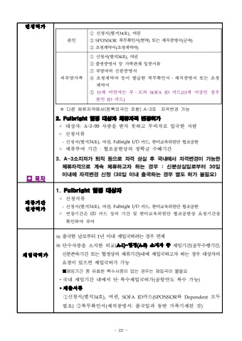 - 22 -%ubcc0%uacbd%ud5c8%uac00%uf000%ubcf8%uc778%u2460%uc2e0%uccad%uc11c(%ubcc4%uc9c034%ud638),%uc5ec%uad8c %u2461SPONSOR%ubcf5%ubb34%ud655%uc778%uc11c(%ud604%uc5ed)%ub610%ub294 %uc7ac%uc9c1%uc99d%uba85%uc11c(%uad70%uc18d)%u2462%ucd08%uccad%uacc4%uc57d%uc11c(%ucd08%uccad%uacc4%uc57d%uc790)%ud53c%ubd80%uc591%uac00%uc871%u2460%uc2e0%uccad%uc11c(%ubcc4%uc9c034%ud638),%uc5ec%uad8c%u2461%ucd9c%uc0dd%uc99d%uba85%uc11c %ub4f1 %uac00%uc871%uad00%uacc4 %uc785%uc99d%uc11c%ub958%u2462%ubd80%uc591%uc790%uc758%uc2e0%ubd84%uc99d%uba85%uc11c%u2463%ucd08%uccad%uacc4%uc57d%uc790 %ub4f1%uc774 %ubc1c%uae09%ud55c %ubcf5%ubb34%ud655%uc778%uc11c%u2024%uc7ac%uc9c1%uc99d%uba85%uc11c %ub610%ub294 %ucd08%uccad%uacc4%uc57d%uc11c%u246411%uc138 %ubbf8%ub9cc%uc790%ub294 %ubd80%u2024%ubaa8%uc758 SOFAID%uce74%ub4dc(11%uc138 %uc774%uc0c1%uc778 %uacbd%uc6b0 %ubcf8%uc778 ID%uce74%ub4dc)%u203b %ub2e4%ub978 %uccb4%ub958%uc790%uaca9%uc5d0%uc11c(%ub4f1%ub85d%uc678%uad6d%uc778 %ud3ec%ud568) A-3%ub85c %uc790%uaca9%ubcc0%uacbd %uac00%ub2a52. Fulbright %ud611%uc815 %ub300%uc0c1%uc790 %uccb4%ub958%uc790%uaca9 %ubcc0%uacbd%ud5c8%uac00%u25e6 %ub300%uc0c1%uc790: A-3-99 %uc0ac%uc99d%uc744 %ubc1b%uc9c0 %ubabb%ud558%uace0 %ubb34%ube44%uc790%ub85c %uc785%uad6d%ud55c %uc0ac%ub78c%u25e6 %uc2e0%uccad%uc11c%ub958-%uc2e0%uccad%uc11c(%ubcc4%uc9c034%ud638),%uc5ec%uad8c,FulbrightI/D%uce74%ub4dc,%ud55c%ubbf8%uad50%uc721%uc704%uc6d0%ub2e8 %ud611%uc870%uacf5%ud55c%u25e6 %uccb4%ub958%ubd80%uc5ec %uae30%uac04 : %ud611%uc870%uacf5%ud55c%uc0c1%uc758 %uc7a5%ud559%uae08 %uc218%ud61c%uae30%uac043. A-3%uc18c%uc9c0%uc790%uac00 %ud1f4%uc9c1 %ub4f1%uc73c%ub85c %uc790%uaca9 %uc0c1%uc2e4 %ud6c4 %uad6d%ub0b4%uc5d0%uc11c %uc790%uaca9%ubcc0%uacbd%uc774 %uac00%ub2a5%ud55c %uccb4%ub958%uc790%uaca9%uc73c%ub85c %uacc4%uc18d %uccb4%ub958%ud558%uace0%uc790 %ud558%ub294 %uacbd%uc6b0 : %uc2e0%ubd84%uc0c1%uc2e4%uc77c%ub85c%ubd80%ud130 30%uc77c %uc774%ub0b4%uc5d0 %uc790%uaca9%ubcc0%uacbd %uc2e0%uccad (30%uc77c %uc774%ub0b4 %ucd9c%uad6d%ud558%ub294 %uacbd%uc6b0 %ubcc4%ub3c4 %ud5c8%uac00 %ubd88%ud544%uc694)%uccb4%ub958%uae30%uac04%uc5f0%uc7a5%ud5c8%uac001. Fulbright %ud611%uc815 %ub300%uc0c1%uc790%u25e6 %uc2e0%uccad%uc11c%ub958-%uc2e0%uccad%uc11c(%ubcc4%uc9c034%ud638),%uc5ec%uad8c,FulbrightI/D%uce74%ub4dc,%ud55c%ubbf8%uad50%uc721%uc704%uc6d0%ub2e8 %ud611%uc870%uacf5%ud55c%u25e6 %uc5f0%uc7a5%uae30%uac04%uc740 I/D %uce74%ub4dc %uc0c1%uc758 %uae30%uac04 %ubc0f %ud55c%ubbf8%uad50%uc721%uc704%uc6d0%ub2e8 %ud611%uc870%uacf5%ud55c%uc0c1 %uc694%uccad%uae30%uac04%uc744 %ud655%uc778%ud558%uc5ec %ubd80%uc5ec%uc7ac%uc785%uad6d%ud5c8%uac00%ucd9c%uad6d%ud55c %ub0a0%ub85c%ubd80%ud130 1%ub144 %uc774%ub0b4 %uc7ac%uc785%uad6d%ud558%ub824%ub294 %uacbd%uc6b0 %uba74%uc81c%ub2e8%uc218%uc0ac%uc99d%uc744 %uc18c%uc9c0%ud55c %uc678%uad50(A-1)~%ud611%uc815(A-3)%uc18c%uc9c0%uc790 %uc911 %uc7ac%uc784%uae30%uac04(%uacf5%ubb34%uc218%ud589%uae30%uac04,%uc2e0%ubd84%uc874%uc18d%uae30%uac04 %ub610%ub294 %ud611%uc815%uc0c1%uc758 %uccb4%ub958%uae30%uac04)%ub0b4%uc5d0 %uc7ac%uc785%uad6d%ud558%uace0%uc790 %ud558%ub294 %uacbd%uc6b0 %ub300%uc0c1%uc790%uc758%uc694%uccad%uc774 %uc788%uc73c%uba74 %uc7ac%uc785%uad6d%ud5c8%uac00 %uac00%ub2a5%u203b%uc7ac%uc784%uae30%uac04 %uc911 %uc720%ud6a8%ud55c %ubcf5%uc218%uc0ac%uc99d%uc774 %uc788%ub294 %uacbd%uc6b0%ub294 %uc7ac%uc785%uad6d%uc774 %ubd88%ud544%uc694%uf000%uad6d%ub0b4 %uc7ac%uc784%uae30%uac04 %ub0b4%uc5d0%uc11c %ub2e8%u2027%ubcf5%uc218%uc7ac%uc785%uad6d%ud5c8%uac00(%uacf5%ud56d%ub9cc%ub3c4 %ubcf5%uc218 %uac00%ub2a5)%uf000%uc81c%ucd9c%uc11c%ub958%u2460%uc2e0%uccad%uc11c(%ubcc4%uc9c034%ud638),%uc5ec%uad8c,SOFAID%uce74%ub4dc(SPONSOR%uc640 Dependent%ubaa8%ub450 %ud544%uc694)%u2461%ubcf5%ubb34%ud655%uc778%uc11c(%uc7ac%uc9c1%uc99d%uba85%uc11c:%ucd9c%uad6d%uc77c%uacfc %ub3d9%ubc18 %uac00%uc871%uae30%uc7ac%ub41c %uac83)