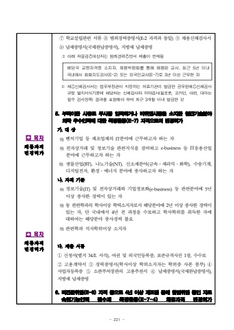 - 221 -%uf000%ubaa9%ucc28%uccb4%ub958%uc790%uaca9%ubcc0%uacbd%ud5c8%uac00%uf000%ubaa9%ucc28%uccb4%ub958%uc790%uaca9%ubcc0%uacbd%ud5c8%uac00%u2466%ud559%uad50%uc124%ub9bd%uad00%ub828 %uc11c%ub958 %u2467%ubc94%uc8c4%uacbd%ub825%uc99d%uba85%uc11c(E-2%uc790%uaca9%uacfc %ub3d9%uc77c)%u2468%ucc44%uc6a9%uc2e0%uccb4%uac80%uc0ac%uc11c%u2469%ub0a9%uc138%uc99d%uba85%uc11c(%uad6d%uc138%uc644%ub0a9%uc99d%uba85%uc11c),%uc9c0%ubc29%uc138 %ub0a9%uc138%uc99d%uba85%u203b%uc544%ub798%uc790%uc728%uac80%uc99d%ub300%uc0c1%uc790%ub294%ubc94%uc8c4%uacbd%ub825%uc99d%uba85%uc11c%uc81c%ucd9c%uc774%uba74%uc81c%ub428%ud574%ub2f9%uad6d %uad50%uc6d0%uc790%uaca9%uc99d %uc18c%uc9c0%uc790, %ucc44%uc6a9%ubc15%ub78c%ud68c%ub97c %ud1b5%ud574 %ucc44%uc6a9%ub41c %uad50%uc0ac, %ucd5c%uadfc 5%ub144 %uc774%ub0b4 %uad6d%ub0b4%uc5d0%uc11c %ud68c%ud654%uc9c0%ub3c4%uac15%uc0ac(E-2) %ub610%ub294 %uc678%uad6d%uc778%uad50%uc0ac(E-7)%ub85c 3%ub144 %uc774%uc0c1 %uadfc%ubb34%ud55c %uc790%u203b%ucc44%uc6a9%uc2e0%uccb4%uac80%uc0ac%uc11c%ub294%ubc95%ubb34%ubd80%uc7a5%uad00%uc774%uc9c0%uc815%ud558%ub294%uc758%ub8cc%uae30%uad00%uc774%ubc1c%uae09%ud55c%uacf5%ubb34%uc6d0%ucc44%uc6a9%uc2e0%uccb4%uac80%uc0ac%uaddc%uc815%ubcc4%uc9c0%uc11c%uc2dd%uae30%uc900%uc5d0%ud574%ub2f9%ud558%ub294%uc2e0%uccb4%uac80%uc0ac%uc640%ub9c8%uc57d%uac80%uc0ac(%ud544%ub85c%ud3f0,%ucf54%uce74%uc778,%uc544%ud3b8,%ub300%ub9c8%ub294%ud544%uc218%uac80%uc0ac%ud56d%ubaa9)%uacb0%uacfc%ub97c%ud3ec%ud568%ud574%uc57c%ud558%uba70%ucd5c%uadfc3%uac1c%uc6d4%uc774%ub0b4%ubc1c%uae09%ud55c%uac835. %ubd80%ub4dd%uc774%ud55c %uc0ac%uc720%ub85c %ubb34%uc0ac%uc99d %uc785%uad6d%ud558%uac70%ub098 %ube44%ucde8%uc5c5%uc0ac%uc99d%uc744 %uc18c%uc9c0%ud55c %ucca8%ub2e8%uae30%uc220%ubd84%uc57c %uc678%uad6d %uc6b0%uc218%uc778%ub825%uc5d0 %ub300%ud55c %ud2b9%uc815%ud65c%ub3d9(E-7) %uc790%uaca9%uc73c%ub85c%uc758 %ubcc0%uacbd%ud5c8%uac00%uac00.%ub300 %uc0c1%ubca4%ucc98%uae30%uc5c5 %ub4f1 %uc81c%uc870%uc5c5%uccb4%uc758 IT%ubd84%uc57c%uc5d0 %uadfc%ubb34%ud558%uace0%uc790 %ud558%ub294 %uc790%uc804%uc790%uc0c1%uac70%ub798 %ubc0f %uc815%ubcf4%uae30%uc220 %uad00%ub828%uc9c0%uc2dd%uc744 %uacb8%ube44%ud558%uace0 e-business%ub4f1 IT%uc751%uc6a9%uc0b0%uc5c5 %ubd84%uc57c%uc5d0 %uadfc%ubb34%ud558%uace0%uc790 %ud558%ub294 %uc790%uc0dd%ubb3c%uc0b0%uc5c5(BT),%ub098%ub178%uae30%uc220(NT),%uc2e0%uc18c%uc7ac%ubd84%uc57c(%uae08%uc18d%u2024%uc138%ub77c%ubbf9%u2024%ud654%ud559),%uc218%uc1a1%uae30%uacc4,%ub514%uc9c0%ud138%uc804%uc790,%ud658%uacbd%u2024%uc5d0%ub108%uc9c0 %ubd84%uc57c%uc5d0 %uc885%uc0ac%ud558%uace0%uc790 %ud558%ub294 %uc790%ub098.%uc790%uaca9 %uae30%uc900%uc815%ubcf4%uae30%uc220(IT)%ubc0f %uc804%uc790%uc0c1%uac70%ub798%uc640 %uae30%uc5c5%uc815%ubcf4%ud654(e-business)%ub4f1 %uad00%ub828%ubd84%uc57c%uc5d0 5%ub144 %uc774%uc0c1 %uc885%uc0ac%ud55c %uacbd%ub825%uc774 %uc788%ub294 %uc790%ub3d9 %uad00%ub828%ud559%uacfc%uc758 %ud559%uc0ac%uc774%uc0c1 %ud559%ub825%uc18c%uc9c0%uc790%ub85c%uc11c %ud574%ub2f9%ubd84%uc57c%uc5d0 2%ub144 %uc774%uc0c1 %uc885%uc0ac%ud55c %uacbd%ub825%uc774 %uc788%ub294 %uc790,%ub2e8 %uad6d%ub0b4%uc5d0%uc11c 4%ub144 %uc804 %uacfc%uc815%uc744 %uc218%ub8cc%ud558%uace0 %ud559%uc0ac%ud559%uc704%ub97c %ucde8%ub4dd%ud55c %uc790%uc5d0 %ub300%ud558%uc5ec%ub294 %ud574%ub2f9%ubd84%uc57c %uc885%uc0ac%uacbd%ub825 %ubd88%uc694%uad00%ub828%ud559%uacfc %uc11d%uc0ac%ud559%uc704%uc774%uc0c1 %uc18c%uc9c0%uc790%ub2e4.%uc81c%ucd9c %uc11c%ub958%u2460%uc2e0%uccad%uc11c(%ubcc4%uc9c0 34%ud638 %uc11c%uc2dd),%uc5ec%uad8c %ubc0f %uc678%uad6d%uc778%ub4f1%ub85d%uc99d,%ud45c%uc900%uaddc%uaca9%uc0ac%uc9c4 1%uc7a5,%uc218%uc218%ub8cc%u2461%uace0%uc6a9%uacc4%uc57d%uc11c %u2462%uacbd%ub825%uc99d%uba85%uc11c(%ud559%uc0ac%uc774%uc0c1 %ud559%uc704%uc18c%uc9c0%uc790%ub294 %ud559%uc704%uc99d %uc0ac%ubcf8 %ucca8%ubd80)%u2463%uc0ac%uc5c5%uc790%ub4f1%ub85d%uc99d %u2464%uc18c%uad00%ubd80%ucc98%uc7a5%uad00%uc758 %uace0%uc6a9%ucd94%ucc9c%uc11c %u2465%ub0a9%uc138%uc99d%uba85%uc11c(%uad6d%uc138%uc644%ub0a9%uc99d%uba85%uc11c),%uc9c0%ubc29%uc138 %ub0a9%uc138%uc99d%uba856. %ube44%uc804%ubb38%ucde8%uc5c5(E-9) %uc790%uaca9 %ub4f1%uc73c%ub85c 4%ub144 %uc774%uc0c1 %uc81c%uc870%uc5c5 %ub4f1%uc5d0 %ud569%ubc95%ucde8%uc5c5 %uc911%uc778 %uc790%ub85c %uc219%ub828%uae30%ub2a5%uc778%ub825 %uc810%uc218%uc81c %ud2b9%uc815%ud65c%ub3d9(E-7-4) %uccb4%ub958%uc790%uaca9 %ubcc0%uacbd%ud5c8%uac00