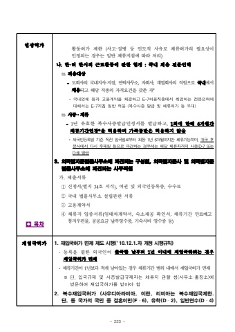 - 223 -%uc5f0%uc7a5%ud5c8%uac00%uf000%ud65c%ub3d9%ud5c8%uac00 %uc81c%ud55c(%uc0ac%uace0%u00b7%uc9c8%ubcd1 %ub4f1 %uc778%ub3c4%uc801 %uc0ac%uc720%ub85c %uccb4%ub958%ud5c8%uac00%uc758%ud544%uc694%uc131%uc774 %uc778%uc815%ub418%ub294 %uacbd%uc6b0%ub294 %uc77c%ubc18 %uccb4%ub958%uc9c0%uce68%uc5d0 %ub530%ub77c %ucc98%ub9ac)%ub098.%ud55c%u00b7%ub7ec %ud55c%uc2dc%uc801 %uadfc%ub85c%ud65c%ub3d9%uc5d0 %uad00%ud55c %ud611%uc815 :%uad6d%ub0b4 %ucc44%uc6a9 %uc804%ubb38%uc778%ub825%uc801%uc6a9%ub300%uc0c1-%ubaa8%ud68c%uc0ac%uc758 %uad6d%ub0b4%uc9c0%uc0ac%u00b7%uc9c0%uc810,%uc5f0%ub77d%uc0ac%ubb34%uc18c,%uc790%ud68c%uc0ac,%uacc4%uc5f4%ud68c%uc0ac%uc758%uc9c1%uc6d0%uc73c%ub85c %uad6d%ub0b4%uc5d0%uc11c%ucc44%uc6a9%ub418%uace0 %ud574%ub2f9 %uc9c1%uc885%uc758 %uc790%uaca9%uc694%uac74%uc744 %uac16%ucd98 %uc790**%uad6d%ub0b4%uc5c5%uccb4%ub4f1%uacfc%uace0%uc6a9%uacc4%uc57d%uc744%uccb4%uacb0%ud558%uace0E-7%ud5c8%uc6a9%uc9c1%uc885%uc5d0%uc11c%ucde8%uc5c5%ud558%ub294%uc804%ubb38%uc778%ub825%uc5d0%ub300%ud574%uc11c%ub294E-7%uc9c0%uce68%uc77c%ubc18%uc801%uc6a9(%ubcf5%uc218%uc0ac%uc99d%ubc1c%uae09%ubc0f%uccb4%ub958%ud5c8%uac00%ub4f1%uc6b0%ub300)%uc0ac%uc99d%u2024%uccb4%ub958-1%ub144 %uc720%ud6a8%ud55c %ubcf5%uc218%uc0ac%uc99d%ubc1c%uae09%uc778%uc815%uc11c%ub97c %ubc1c%uae09%ud558%uace0,1%ud68c%uc5d0 %ud55c%ud574 6%uac1c%uc6d4%uac04 %uccb4%ub958%uae30%uac04%uc5f0%uc7a5*%uc744 %ud5c8%uc6a9%ud558%uba70 %uac00%uc871%ub3d9%ubc18%uc740 %ud5c8%uc6a9%ud558%uc9c0 %uc54a%uc74c*%uc678%uad6d%uc778%ub4f1%ub85d%uc77c%uae30%uc900%uc9c1%uc804%uc785%uad6d%uc77c%ub85c%ubd80%ud130%ucd5c%uc7a51%ub1446%uac1c%uc6d4%uae4c%uc9c0%ub9cc%uccb4%ub958%uac00%ub2a5%ud558%uba70,%uadc0%uad6d%ud6c4%ubcf8%uc0ac%uc5d0%uc11c%ub2e4%uc2dc%uc8fc%uc7ac%uc6d0%ub4f1%uc73c%ub85c%ud30c%uacac%ud558%ub294%uacbd%uc6b0%uc5d0%ub294%ud574%ub2f9%uccb4%ub958%uc790%uaca9%uc758%uc0ac%uc99d(D-7%ub610%ub294D-8)%ubc1c%uae093. %uc678%uad6d%ubc95%uc790%ubb38%ubc95%ub960%uc0ac%ubb34%uc18c%uc5d0 %ud30c%uacac%ub418%ub294 %uad6c%uc131%uc6d0, %uc678%uad6d%ubc95%uc790%ubb38%uc0ac %ubc0f %uc678%uad6d%ubc95%uc790%ubb38%ubc95%ub960%uc0ac%ubb34%uc18c%uc5d0 %ud30c%uacac%ub418%ub294 %uc0ac%ubb34%uc9c1%uc6d0%uac00.%uc81c%ucd9c%uc11c%ub958%u2460%uc2e0%uccad%uc11c(%ubcc4%uc9c0 34%ud638 %uc11c%uc2dd),%uc5ec%uad8c %ubc0f %uc678%uad6d%uc778%ub4f1%ub85d%uc99d,%uc218%uc218%ub8cc%u2461%uad6d%ub0b4 %ubc95%ub960%uc0ac%ubb34%uc18c %uc124%ub9bd%uad00%ub828 %uc11c%ub958%u2462%uace0%uc6a9%uacc4%uc57d%uc11c%u2463%uccb4%ub958%uc9c0 %uc785%uc99d%uc11c%ub958(%uc784%ub300%ucc28%uacc4%uc57d%uc11c,%uc219%uc18c%uc81c%uacf5 %ud655%uc778%uc11c,%uccb4%ub958%uae30%uac04 %ub9cc%ub8cc%uc608%uace0 %ud1b5%uc9c0%uc6b0%ud3b8%ubb3c,%uacf5%uacf5%uc694%uae08 %ub0a9%ubd80%uc601%uc218%uc99d,%uae30%uc219%uc0ac%ube44 %uc601%uc218%uc99d %ub4f1)%uc7ac%uc785%uad6d%ud5c8%uac001. %uc7ac%uc785%uad6d%ud5c8%uac00 %uba74%uc81c %uc81c%ub3c4 %uc2dc%ud589(%u201910.12.1.%uc790 %uac1c%uc815 %uc2dc%ud589%uaddc%uce59)-%ub4f1%ub85d%uc744 %ud544%ud55c %uc678%uad6d%uc778%uc774 %ucd9c%uad6d%ud55c %ub0a0%ubd80%ud130 1%ub144 %uc774%ub0b4%uc5d0 %uc7ac%uc785%uad6d%ud558%ub824%ub294%uacbd%uc6b0%uc7ac%uc785%uad6d%ud5c8%uac00 %uba74%uc81c-%uccb4%ub958%uae30%uac04%uc774 1%ub144%ubcf4%ub2e4 %uc801%uac8c %ub0a8%uc544%uc788%ub294 %uacbd%uc6b0 %uccb4%ub958%uae30%uac04 %ubc94%uc704 %ub0b4%uc5d0%uc11c %uc7ac%uc785%uad6d%ud5c8%uac00 %uba74%uc81c%u203b%ub2e8,%uc785%uad6d%uaddc%uc81c%ubc0f%uc0ac%uc99d%ubc1c%uae09%uaddc%uc81c%uc790%ub294%uccb4%ub958%uc9c0%uad00%ud560%uccad(%uc0ac%ubb34%uc18c%u00b7%ucd9c%uc7a5%uc18c)%uc5d0%ubc29%ubb38%ud558%uc5ec%uc7ac%uc785%uad6d%ud5c8%uac00%ub97c%ubc1b%uc544%uc57c%ud5682. %ubcf5%uc218%uc7ac%uc785%uad6d%ud5c8%uac00 (%uc0ac%uc6b0%ub514%uc544%ub77c%ube44%uc544, %uc774%ub780, %ub9ac%ube44%uc544%ub294 %ubcf5%uc218%uc7ac%uc785%uad6d%uc81c%ud55c. %ub2e8, %ub3d9 %uad6d%uac00%uc758 %uad6d%ubbfc %uc911 %uacb0%ud63c%uc774%ubbfc(F%u00ad6), %uc720%ud559(D%u00ad2), %uc77c%ubc18%uc5f0%uc218(D%u00ad4)