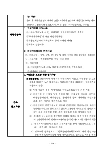 - 224 -%ub294 %uac00%ub2a5)-%ucd9c%uad6d %ud6c4 %uccb4%ub958%uae30%uac04 %ubc94%uc704 %ub0b4%uc5d0%uc11c 1%ub144%uc744 %ucd08%uacfc%ud558%uc5ec 2%ub144 %ub0b4%uc5d0 %uc7ac%uc785%uad6d%uc744 %ud558%ub824%ub294 %uacbd%uc6b0-%uc2e0%uccad%uc11c%ub958 :%uc2e0%uccad%uc11c(%ubcc4%uc9c0 34%ud638%uc11c%uc2dd),%uc5ec%uad8c %uc6d0%ubcf8,%uc678%uad6d%uc778%ub4f1%ub85d%uc99d,%uc218%uc218%ub8cc%uc678%uad6d%uc778%ub4f1%ub85d1. %uc678%uad6d%uc778%ub4f1%ub85d %uc2e0%uccad%uc11c%ub958%u2460%uc2e0%uccad%uc11c(%ubcc4%uc9c034%ud638 %uc11c%uc2dd),%uc5ec%uad8c%uc6d0%ubcf8,%ud45c%uc900%uaddc%uaca9%uc0ac%uc9c41%uc7a5,%uc218%uc218%ub8cc%u2461%u2018%ubd80%uac00%uac00%uce58%uc138%ubc95%u2019%uc5d0 %ub530%ub978 %uc0ac%uc5c5%uc790%ub4f1%ub85d%uc99d%u2462%ucc44%uc6a9%uc2e0%uccb4%uac80%uc0ac%uc11c(%uc678%uad6d%uc778%ud559%uad50 %ub4f1%uc758 %uad50%uc0ac%ub9cc %ud574%ub2f9)%u2463%uccb4%ub958%uc9c0 %uc785%uc99d%uc11c%ub9582. %uc678%uad6d%uc778%ub4f1%ub85d%uc0ac%ud56d %ubcc0%uacbd%uc2e0%uace0%uac00.%uc2e0%uace0%uc0ac%ud56d :%uc131%uba85,%uc131%ubcc4,%uc0dd%ub144%uc6d4%uc77c %ubc0f %uad6d%uc801,%uc5ec%uad8c%uc758 %ubc88%ud638%u2027%ubc1c%uae09%uc77c%uc790%u2027%uc720%ud6a8%uae30%uac04%ub098.%uc2e0%uace0%uae30%ud55c :%ubcc0%uacbd%uc77c%ub85c%ubd80%ud130 15%uc77c %uc774%ub0b4 %uc2e0%uace0%ub2e4.%uc81c%ucd9c%uc11c%ub958%u2460%uc2e0%uccad%uc11c(%ubcc4%uc9c0 34%ud638 %uc11c%uc2dd),%uc5ec%uad8c %ubc0f %uc678%uad6d%uc778%ub4f1%ub85d%uc99d,%uc218%uc218%ub8cc %uc5c6%uc74c%u2461%ubcc0%uacbd%uad00%ub828 %uc785%uc99d%uc11c%ub958%uae30%ud0c0%ucc38%uace0%uc0ac%ud56d1. %uad6d%ubbfc%uace0%uc6a9 %ubcf4%ud638%ub97c %uc704%ud55c %uc2ec%uc0ac%uae30%uc900 %u274d (%uc801%uc6a9%uc6d0%uce59)%uc804%ubb38%uc778%ub825%uc5d0 %ub300%ud574%uc11c%ub294 %uad6d%ubbfc%ub300%uccb4%uac00 %uc5b4%ub835%uace0, %uad6d%ubd80%ucc3d%ucd9c %ubc0f %uace0%uc6a9%ucc3d%ucd9c%uc5d0 %uae30%uc5ec%ub3c4%uac00 %ub192%uc740 %uc810 %uac10%uc548%ud558%uc5ec %uc784%uae08%uc694%uac74 %uae30%uc900%uc744 %uc81c%uc678%ud558%uace0%ub294%uc6d0%uce59%uc801%uc73c%ub85c %uc801%uc6a9%ud558%uc9c0%uc54a%uc74c%u2460 %uc544%ub798 %uac01%ud638%uc758 %uacbd%uc6b0 %uc608%uc678%uc801%uc73c%ub85c %uad6d%ubbfc%uace0%uc6a9%ubcf4%ud638%uc2ec%uc0ac %uae30%uc900 %uc801%uc6a9%u2170) %uc804%ubb38%uc778%ub825 %uc911 %ucd08%uccad%uc7a5 %ub0a8%ubc1c %uc6b0%ub824%uac00 %uc788%ub294 %uae30%uacc4%uacf5%ud559 %uae30%uc220%uc790, %uc81c%ub3c4%uc0ac, %uc5ec%ud589%uc0c1%ud488%uac1c%ubc1c%uc790, %ud574%uc678%uc601%uc5c5%uc6d0, %ud1b5%u2024%ubc88%uc5ed%uac00 %ub4f1%uc5d0 %ub300%ud574%uc11c%ub294 %uad6d%ubbfc%uace0%uc6a9%ubcf4%ud638 %uc2ec%uc0ac %uae30%uc900%uc744 %uc608%uc678%uc801%uc73c%ub85c %uc801%uc6a9%u2171) %uc804%ubb38%uc778%ub825%uc911 %uad6d%ubbfc%uace0%uc6a9%ubcf4%ud638 %uc9c1%uc885%uacfc %uc900%uc804%ubb38%uc778%ub825, %uc77c%ubc18%uae30%ub2a5%uc778%ub825, %uc219%ub828%uae30%ub2a5%uc778%ub825%uc740 %uad6d%ubbfc%uace0%uc6a9 %uce68%ud574 %uc18c%uc9c0%uac00 %uc5c6%ub3c4%ub85d %uace0%uc6a9%uc5c5%uccb4 %uc790%uaca9%uc694%uac74 %ubc0f %uc5c5%uccb4%ub2f9%uc678%uad6d%uc778 %uace0%uc6a9 %ud5c8%uc6a9%uc778%uc6d0 %uc0c1%ud55c, %ucd5c%uc800 %uc784%uae08%uc694%uac74 %ub4f1%uc744 %uc124%uc815%ud558%uc5ec %uc801%uc6a9%u2461%uc704 %u2460%uc758 %u2170), %u2171)%uc5d0%ub3c4 %ubd88%uad6c%ud558%uace0 %uc544%ub798%uc758 %uac01%ud638%uc758 %uacbd%uc6b0 %uc9c1%uc885%uc5d0 %uad00%uacc4%uc5c6%uc774 %uc77c%ubc18%uc6d0%uce59%uc5d0 %ub530%ub77c %uc5c5%uccb4%uaddc%ubaa8%u2024%uace0%uc6a9%ube44%uc728 %ub4f1 %uad6d%ubbfc%uace0%uc6a9 %ubcf4%ud638%ub97c%uc801%uc6a9%ud558%uc9c0 %uc54a%uc74c%u2170) %uccb4%ub958%uc790%uaca9%uc678%ud65c%ub3d9%ud5c8%uac00 %ub610%ub294 %uadfc%ubb34%ucc98%ucd94%uac00%ub97c %ubc1b%uc544 %ud30c%ud2b8%ud0c0%uc784%uc73c%ub85c %uadfc%ubb34%ud558%ub294 %uacbd%uc6b0%uc5d0%ub294 %uc801%uc6a9%ud558%uc9c0 %uc54a%uc74c%u2171) %uc815%ubd80%ucd08%uccad %uc7a5%ud559%uc0dd%uc73c%ub85c %u2018%uc77c/%ud559%uc2b5%uc5f0%uacc4%uc720%ud559(D-2-7)%u2019%uc790%uaca9 %uc878%uc5c5%uc790%ub294 %uc804%ubb38/%uc900%uc804%ubb38/%uc77c%ubc18%uae30%ub2a5%uc5d0 %ub300%ud574 %uad6d%ubbfc%uace0%uc6a9%ube44%uc728, %uc5c5%uccb4%uaddc%ubaa8 %uc801%uc6a9%uc744 %uba74%uc81c
