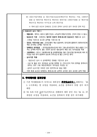 - 226 - *%u2460%uc911%uc18c%uae30%uc5c5%uae30%ubcf8%ubc95%uc0c1%u2018%uc911%uc18c%uae30%uc5c5(%uc18c%uc0c1%uacf5%uc778)%ud655%uc778%uc11c%u2019%ub85c%ud655%uc778%ub418%ub294%uae30%uc5c5,%u2461%ubca4%ucc98%uae30%uc5c5%ubc95%uc0c1%u2018%ubca4%ucc98%uae30%uc5c5%ud655%uc778%uc11c%u2019%ub85c%ud655%uc778%ub418%ub294%ubca4%ucc98%uae30%uc5c5%u2462%uc911%uacac%uae30%uc5c5%ubc95%uc0c1%u2018%uc911%uacac%uae30%uc5c5%ud655%uc778%uc11c%u2019%ub85c%ud655%uc778%ub418%ub294%ube44%uc218%ub3c4%uad8c%uc18c%uc7ac%uc911%uacac%uae30%uc5c5%u203b%ud2b9%ub840%uc784%uae08%uc694%uac74%uacfc%ub2f9%ud574%uc5f0%ub3c4%uacf5%uace0%ud55c%uae08%uc561%uc774%uc0c1%uc774%ud55c%uacbd%uc6b0%uc720%ub9ac%ud55c%uae08%uc561%uc801%uc6a9%u3010 %uc784%uae08%uc694%uac74 %uc2ec%uc0ac %uae30%uc900 %u3011%u2218%uc81c%ucd9c%uc11c%ub958 :%uacc4%uc57d%uc11c, %uc138%ubb34%uc11c %ubc1c%ud589 %uc804%ub144%ub3c4 %uc18c%ub4dd%uae08%uc561 %uc99d%uba85(%uae30%uac04%uc5f0%uc7a5, %uadfc%ubb34%ucc98%ubcc0%uacbd %uc2dc %ud544%uc218)%u2218 %uc784%uae08%uc694%uac74 %uae30%uc900 : %ub2f9%ud574%uc5f0%ub3c4 %ubc95%ubb34%ubd80 %uc7a5%uad00%uc774 %ud655%uc815%u00b7%uacf5%uace0%ud55c %uc784%uae08%uc694%uac74 %uae30%uc900%uc73c%ub85c %uc2ec%uc0ac - %uc2e0%uccad%uc77c %uae30%uc900%uc73c%ub85c %uacf5%uace0%ud55c %uae08%uc561%uc744 %uae30%uc900%uc73c%ub85c %ud568%u2218 %uc804%ub144%ub3c4 %uad6d%ubbfc1%uc778%ub2f9 GNI :%ud55c%uad6d%uc740%ud589%uc774 %ub9e4%ub144 %ubc1c%ud45c%ud558%uba70, %ud55c%uad6d%uc740%ud589 %ud648%ud398%uc774%uc9c0%ud1b5%uacc4%uc0ac%uc774%ud2b8%uc5d0 %ub9e4%ub144 %uacf5%uc2dc%ud558%ub294 %uae08%uc561%uc744 %uae30%uc900%uc73c%ub85c %ud568.%u2218%ub2f9%ud574%uc5f0%ub3c4 %ucd5c%uc800%uc784%uae08 : %ucd5c%uc800%uc784%uae08%ubc95(%uc81c10%uc870)%uc5d0 %ub530%ub77c %uace0%uc6a9%ub178%ub3d9%ubd80%uc7a5%uad00%uc774 %ub9e4%ub144 8%uc6d4%uacbd %uace0%uc2dc%ud558%ub294 %uae08%uc561%uc5d0 %ub530%ub974%uba70,%ubcc4%ub3c4 %uaddc%uc815%uc774 %uc5c6%uc73c%uba74 1%uc6d41%uc77c%ubd80%ud130 %ud574%ub2f9%uc5f0%ub3c4 %ucd5c%uc800%uc784%uae08%uc744 %uc801%uc6a9%u2218 %uace0%uc6a9%uacc4%uc57d%uc11c: %ubc18%ub4dc%uc2dc %uace0%uc6a9%uacc4%uc57d%uc11c%uc5d0 %uc6d4 %uae09%uc5ec%ucd1d%uc561(%uc5f0%ubd09) %ub300%ube44 %uadfc%ub85c%uc2dc%uac04%uc744 %uba85%uc2dc%ud558%ub3c4%ub85d %ud558%uc5ec %ucd5c%uc800%uc784%uae08 %uc704%ubc18 %ub4f1%uc774 %ubc1c%uc0dd%ud558%uc9c0 %uc54a%ub3c4%ub85d %uc870%uce58(1%uc77c %ubc0f %uc6d4%uac04 %uadfc%ubb34%uc2dc%uac04 %uba85%uc2dc)%u2218 %uc2ec%uc0ac%uae30%uc900 %uc801%uc6a9- %u2018%uc784%uae08%u2019%uc694%uac74 %uc2ec%uc0ac %uc2dc %uae08%uc5ec%ucd1d%uc561%uc778 %uc5f0%ubd09%uc744 %uae30%uc900%uc73c%ub85c %uc2ec%uc0ac - %uc2dc%uae09 %ubc0f %uc6d4%uae09 %ubaa8%ub450 %ucd5c%uc800%uc784%uae08 %uc694%uac74%uc744 %ucda9%uc871%ud560 %uac83, %uadfc%ubb34%uc2dc%uac04%uc774 %uc801%uc5b4%ucd1d%uc561%uc744%ucda9%uc871%ud558%uc9c0 %ubabb%ud558%ub294 %uacbd%uc6b0 %uace0%uc6a9 %uc81c%ud55c(%ub2f9%ud574%uc5f0%ub3c4 %ucd5c%uc800%uc784%uae08 %uc774%uc0c1%uc77c %uac83)%uae09%uc5ec%uac00 %uc2ec%uc0ac%uae30%uc900 %uc774%ud558%uc778 %uacbd%uc6b0 %uc6d0%uce59%uc801%uc73c%ub85c %ubc1c%uae09 %uc81c%ud55c%u2218 %uac01%uc885 %ud2b9%ub840 %uc694%uac74%uacfc %ub2f9%ud574%uc5f0%ub3c4 %ud655%uc815%u00b7%uacf5%uace0%ud55c %uae08%uc561%uc774 %uc0c1%uc774%ud55c %uacbd%uc6b0 %uc720%ub9ac%ud55c %uae08%uc561 %uc801%uc6a92. %uc8fc%uc758%ud574%uc57c%ud560 %uacbd%uacfc%uaddc%uc815 %u2460 %uae30%uc874 %ud2b9%uc815%ud65c%ub3d9(E-7) %uc790%uaca9%uc73c%ub85c %uccb4%ub958%uc911%uc778 %uc678%uad6d%uc778%uc694%ub9ac%uc0ac%uc5d0 %ub300%ud574%uc11c%ub294 %u203518. 1. 1.%uc774%ud6c4%uc5d0%ub294 %ud604 %uaddc%uc815%uc744 %uc801%uc6a9%ud558%ub418, %uc694%uac74%uc744 %ucda9%uc871%ud558%uc9c0%ubabb%ud560 %uacbd%uc6b0 %ud5c8%uac00 %uc81c%ud55c%u2461 %u201923. 9.25 %uc774%uc804 %uc219%ub828%uae30%ub2a5%uc778%ub825%uc73c%ub85c %uc804%ud658%ud558%uc5ec %uccb4%ub958 %uc911%uc778 %uc790%ub294%u201924. 11. 27. %uac1c%uc815%ub41c %uaddc%uc815%uc744%uc801%uc6a9%ud558%ub418, %uc694%uac74%uc744 %ucda9%uc871%ud558%uc9c0 %ubabb%ud560 %uacbd%uc6b0 %ud5c8%uac00%uc81c%ud55c