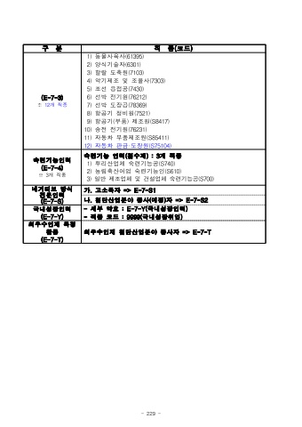 - 229 -%uad6c%ubd84%uc9c1%uc885(%ucf54%ub4dc)(E-7-3)%u203b12%uac1c%uc9c1%uc8851)%ub3d9%ubb3c%uc0ac%uc721%uc0ac(61395)2)%uc591%uc2dd%uae30%uc220%uc790(6301)3)%ud560%ub784%ub3c4%ucd95%uc6d0(7103)4)%uc545%uae30%uc81c%uc870%ubc0f%uc870%uc728%uc0ac(7303)5)%uc870%uc120%uc6a9%uc811%uacf5(7430)6)%uc120%ubc15%uc804%uae30%uc6d0(76212)7)%uc120%ubc15%ub3c4%uc7a5%uacf5(78369)8)%ud56d%uacf5%uae30%uc815%ube44%uc6d0(7521)9)%ud56d%uacf5%uae30(%ubd80%ud488)%uc81c%uc870%uc6d0(S8417)10)%uc1a1%uc804%uc804%uae30%uc6d0(76231)11)%uc790%ub3d9%ucc28%ubd80%ud488%uc81c%uc870%uc6d0(S85411)12)%uc790%ub3d9%ucc28%ud310%uae08%u00b7%ub3c4%uc7a5%uc6d0(S75104)%uc219%ub828%uae30%ub2a5%uc778%ub825(E-7-4)%u203b3%uac1c%uc9c1%uc885%uc219%ub828%uae30%ub2a5%uc778%ub825(%uc810%uc218%uc81c):3%uac1c%uc9c1%uc8851)%ubfcc%ub9ac%uc0b0%uc5c5%uccb4%uc219%ub828%uae30%ub2a5%uacf5(S740)2)%ub18d%ub9bc%ucd95%uc0b0%uc5b4%uc5c5%uc219%ub828%uae30%ub2a5%uc778(S610)3)%uc77c%ubc18%uc81c%uc870%uc5c5%uccb4%ubc0f%uac74%uc124%uc5c5%uccb4%uc219%ub828%uae30%ub2a5%uacf5(S700)%ub124%uac70%ud2f0%ube0c%ubc29%uc2dd%uc804%ubb38%uc778%ub825(E-7-S)%uac00.%uace0%uc18c%ub4dd%uc790=>E-7-S1%ub098.%ucca8%ub2e8%uc0b0%uc5c5%ubd84%uc57c%uc885%uc0ac(%uc608%uc815)%uc790=>E-7-S2%uad6d%ub0b4%uc131%uc7a5%uc778%ub825(E-7-Y)-%uc138%ubd80%uc57d%ud638:E-7-Y(%uad6d%ub0b4%uc131%uc7a5%uc778%ub825)%uc9c1%uc8859999(%uad6d%ub0b4%uc131%uc7a5%ucde8%uc5c5)%ucd5c%uc6b0%uc218%uc778%uc7ac%ud2b9%uc815%ud65c%ub3d9(E-7-T)%ucd5c%uc6b0%uc218%uc778%uc7ac%ucca8%ub2e8%uc0b0%uc5c5%ubd84%uc57c%uc885%uc0ac%uc790=>E-7-T