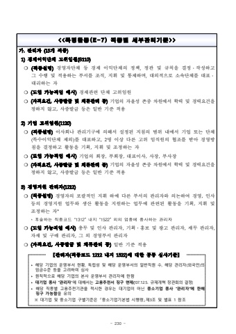 - 230 -<<%ud2b9 %uc815 %ud65c %ub3d9(E-7) %uc9c1 %uc885 %ubcc4 %uc138 %ubd80 %uad00 %ub9ac %uae30 %uc900>>%uac00.%uad00%ub9ac%uc790 (15%uac1c %uc9c1%uc885)1)%uacbd%uc81c%uc774%uc775%ub2e8%uccb4 %uace0%uc704%uc784%uc6d0(S110)%u274d (%uc9c1%uc885%uc124%uba85)%uacbd%uc601%uc790%ub2e8%uccb4 %ub4f1 %uacbd%uc81c %uc774%uc775%ub2e8%uccb4%uc758 %uc815%ucc45,%uc815%uad00 %ubc0f %uaddc%uce59%uc744 %uacb0%uc815%u2024%uc791%uc131%ud558%uace0 %uadf8 %uc218%ud589 %ubc0f %uc801%uc6a9%ud558%ub294 %ubd80%uc11c%ub97c %uc870%uc9c1,%uc9c0%ud718 %ubc0f %ud1b5%uc81c%ud558%uba70,%ub300%uc678%uc801%uc73c%ub85c %uc18c%uc18d%ub2e8%uccb4%ub97c %ub300%ud45c%u2024%ub300%ub9ac%ud558%ub294 %uc790%u274d(%ub3c4%uc785 %uac00%ub2a5%uc9c1%uc5c5 %uc608%uc2dc)%uacbd%uc81c%uad00%ub828 %ub2e8%uccb4 %uace0%uc704%uc784%uc6d0%u274d (%uc790%uaca9%uc694%uac74,%uc0ac%uc99d%ubc1c%uae09 %ubc0f %uccb4%ub958%uad00%ub9ac %ub4f1)%uae30%uc5c5%uc758 %uc790%uc728%uc131 %uc874%uc911 %ucc28%uc6d0%uc5d0%uc11c %ud559%ub825 %ubc0f %uacbd%ub825%uc694%uac74%uc744%uc815%ud558%uc9c0 %uc54a%uace0,%uc0ac%uc99d%ubc1c%uae09 %ub4f1%uc740 %uc77c%ubc18 %uae30%uc900 %uc801%uc6a92)%uae30%uc5c5 %uace0%uc704%uc784%uc6d0(1120)%u274d (%uc9c1%uc885%uc124%uba85)%uc774%uc0ac%ud68c%ub098 %uad00%ub9ac%uae30%uad6c%uc5d0 %uc758%ud574%uc11c %uc124%uc815%ub41c %uc9c0%uce68%uc758 %ubc94%uc704 %ub0b4%uc5d0%uc11c %uae30%uc5c5 %ub610%ub294 %ub2e8%uccb4(%ud2b9%uc218%uc774%uc775%ub2e8%uccb4 %uc81c%uc678)%ub97c %ub300%ud45c%ud558%uace0,2%uba85 %uc774%uc0c1 %ub2e4%ub978 %uace0%uc704 %uc784%uc9c1%uc6d0%uc758 %ud611%uc870%ub97c %ubc1b%uc544 %uacbd%uc601%ubc29%uce68%uc744 %uacb0%uc815%ud558%uace0 %ud65c%ub3d9%uc744 %uae30%ud68d,%uc9c0%ud718 %ubc0f %uc870%uc815%ud558%ub294 %uc790%u274d(%ub3c4%uc785 %uac00%ub2a5%uc9c1%uc5c5 %uc608%uc2dc)%uae30%uc5c5%uc758 %ud68c%uc7a5,%ubd80%ud68c%uc7a5,%ub300%ud45c%uc774%uc0ac,%uc0ac%uc7a5,%ubd80%uc0ac%uc7a5%u274d (%uc790%uaca9%uc694%uac74,%uc0ac%uc99d%ubc1c%uae09 %ubc0f %uccb4%ub958%uad00%ub9ac %ub4f1)%uae30%uc5c5%uc758 %uc790%uc728%uc131 %uc874%uc911 %ucc28%uc6d0%uc5d0%uc11c %ud559%ub825 %ubc0f %uacbd%ub825%uc694%uac74%uc744%uc815%ud558%uc9c0 %uc54a%uace0,%uc0ac%uc99d%ubc1c%uae09 %ub4f1%uc740 %uc77c%ubc18 %uae30%uc900 %uc801%uc6a93)%uacbd%uc601%uc9c0%uc6d0 %uad00%ub9ac%uc790(1212)%u274d(%uc9c1%uc885%uc124%uba85)%uacbd%uc601%uc790%uc758 %ud3ec%uad04%uc801%uc778 %uc9c0%ud718 %ud558%uc5d0 %ub2e4%ub978 %ubd80%uc11c%uc758 %uad00%ub9ac%uc790%uc640 %uc758%ub17c%ud558%uc5ec %uacbd%uc601,%uc778%uc0ac %ub4f1%uc758 %uacbd%uc601%uc9c0%uc6d0 %uc5c5%ubb34%uc640 %uc0dd%uc0b0 %ud65c%ub3d9%uc744 %uc9c0%uc6d0%ud558%ub294 %uc5c5%ubb34%uc5d0 %uad00%ub828%ub41c %ud65c%ub3d9%uc744 %uae30%ud68d,%uc9c0%ud718 %ubc0f %uc870%uc815%ud558%ub294 %uc790**%ud6c4%uc220%ud558%ub294%uc9c1%uc885%ucf54%ub4dc%u201c1312%u201d%ub0b4%uc9c0%u201c1522%u201d%uc678%uc758%uc5c5%uc885%uc5d0%uc885%uc0ac%ud558%ub294%uad00%ub9ac%uc790%u274d (%ub3c4%uc785 %uac00%ub2a5%uc9c1%uc5c5 %uc608%uc2dc)%ucd1d%ubb34 %ubc0f %uc778%uc0ac %uad00%ub9ac%uc790,%uae30%ud68d%u2024%ud64d%ubcf4 %ubc0f %uad11%uace0 %uad00%ub9ac%uc790,%uc7ac%ubb34 %uad00%ub9ac%uc790,%uc790%uc7ac %ubc0f %uad6c%ub9e4 %uad00%ub9ac%uc790,%uadf8 %uc678 %uacbd%uc601%ubd80%uc11c %uad00%ub9ac%uc790%u274d (%uc790%uaca9%uc694%uac74,%uc0ac%uc99d%ubc1c%uae09 %ubc0f %uccb4%ub958%uad00%ub9ac %ub4f1)%uc77c%ubc18 %uae30%uc900 %uc801%uc6a9%u3010%uad00%ub9ac%uc790(%uc9c1%uc885%ucf54%ub4dc 1212%ub0b4%uc9c0 1522)%uc5d0 %ub300%ud55c %uacf5%ud1b5 %uc2ec%uc0ac%uae30%uc900%u3011%u2023%ud574%ub2f9 %uae30%uc5c5%uc758 %uc6b4%uc601%ubd80%uc11c %ud604%ud669, %ub3c5%ub9bd%uc131 %ubc0f %ud574%ub2f9 %uc6b4%uc601%ubd80%uc11c%uc758 %uc77c%ubc18%uc9c1%uc6d0 %uc218, %ud574%ub2f9 %uad00%ub9ac%uc790(%uc678%uad6d%uc778)%uc758 %uc784%uae08%uc218%uc900 %ub4f1%uc744 %uace0%ub824%ud558%uc5ec %uc2ec%uc0ac%u2023 %uc6d0%uce59%uc801%uc73c%ub85c %ud574%ub2f9 %uae30%uc5c5%uc758 %ubcf8%uc0ac %uc6b4%uc601%ubd80%uc11c %uad00%ub9ac%uc790%uc5d0 %ud55c%ud568%u2023 %ub300%uae30%uc5c5 %uc885%uc0ac %u201c%uad00%ub9ac%uc790%u201d%uc5d0 %ub300%ud574%uc11c%ub294 %uace0%uc6a9%ucd94%ucc9c%uc11c %uc9d5%uad6c %uba74%uc81c(%u201807.12.5. %uaddc%uc81c%uac1c%ud601 %uc7a5%uad00%ud68c%uc758 %uacb0%uc815)%u2023 %ud574%ub2f9 %uc9c1%uc885%ubcc4 %uace0%uc6a9%ucd94%ucc9c%uae30%uad00%uc744 %uc801%uc2dc%ud55c %uacbd%uc6b0%ub294 %ub300%uae30%uc5c5%uc774 %uc544%ub2cc %uc911%uc18c%uae30%uc5c5 %uc885%uc0ac %u201c%uad00%ub9ac%uc790%u201d%uc5d0 %ud55c%ud574 %uc9d5%uad6c %uac00%ub2a5%ud568%uc744 %uc720%uc758%u203b %ub300%uae30%uc5c5 %ubc0f %uc911%uc18c%uae30%uc5c5 %uad6c%ubcc4%uae30%uc900%uc740 %u300c%uc911%uc18c%uae30%uc5c5%uae30%ubcf8%ubc95 %uc2dc%ud589%ub839%u300d%uc81c3%uc870 %ubc0f %ubcc4%ud45c 1 %ucc38%uc870