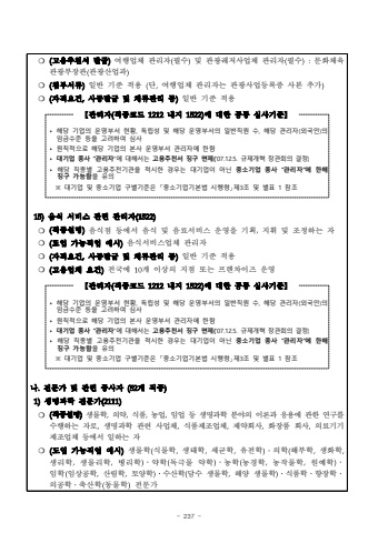 - 237 -%u274d(%uace0%uc6a9%ucd94%ucc9c%uc11c %ubc1c%uae09)%uc5ec%ud589%uc5c5%uccb4 %uad00%ub9ac%uc790(%ud544%uc218)%ubc0f %uad00%uad11%ub808%uc800%uc0ac%uc5c5%uccb4 %uad00%ub9ac%uc790(%ud544%uc218):%ubb38%ud654%uccb4%uc721%uad00%uad11%ubd80%uc7a5%uad00(%uad00%uad11%uc0b0%uc5c5%uacfc)%u274d (%ucca8%ubd80%uc11c%ub958)%uc77c%ubc18 %uae30%uc900 %uc801%uc6a9 (%ub2e8,%uc5ec%ud589%uc5c5%uccb4 %uad00%ub9ac%uc790%ub294 %uad00%uad11%uc0ac%uc5c5%ub4f1%ub85d%uc99d %uc0ac%ubcf8 %ucd94%uac00)%u274d (%uc790%uaca9%uc694%uac74,%uc0ac%uc99d%ubc1c%uae09 %ubc0f %uccb4%ub958%uad00%ub9ac %ub4f1)%uc77c%ubc18 %uae30%uc900 %uc801%uc6a9 %u3010%uad00%ub9ac%uc790(%uc9c1%uc885%ucf54%ub4dc 1212%ub0b4%uc9c0 1522)%uc5d0 %ub300%ud55c %uacf5%ud1b5 %uc2ec%uc0ac%uae30%uc900%u3011%u2023%ud574%ub2f9 %uae30%uc5c5%uc758 %uc6b4%uc601%ubd80%uc11c %ud604%ud669, %ub3c5%ub9bd%uc131 %ubc0f %ud574%ub2f9 %uc6b4%uc601%ubd80%uc11c%uc758 %uc77c%ubc18%uc9c1%uc6d0 %uc218, %ud574%ub2f9 %uad00%ub9ac%uc790(%uc678%uad6d%uc778)%uc758 %uc784%uae08%uc218%uc900 %ub4f1%uc744 %uace0%ub824%ud558%uc5ec %uc2ec%uc0ac%u2023 %uc6d0%uce59%uc801%uc73c%ub85c %ud574%ub2f9 %uae30%uc5c5%uc758 %ubcf8%uc0ac %uc6b4%uc601%ubd80%uc11c %uad00%ub9ac%uc790%uc5d0 %ud55c%ud568%u2023 %ub300%uae30%uc5c5 %uc885%uc0ac %u201c%uad00%ub9ac%uc790%u201d%uc5d0 %ub300%ud574%uc11c%ub294 %uace0%uc6a9%ucd94%ucc9c%uc11c %uc9d5%uad6c %uba74%uc81c(%u201807.12.5. %uaddc%uc81c%uac1c%ud601 %uc7a5%uad00%ud68c%uc758 %uacb0%uc815)%u2023 %ud574%ub2f9 %uc9c1%uc885%ubcc4 %uace0%uc6a9%ucd94%ucc9c%uae30%uad00%uc744 %uc801%uc2dc%ud55c %uacbd%uc6b0%ub294 %ub300%uae30%uc5c5%uc774 %uc544%ub2cc %uc911%uc18c%uae30%uc5c5 %uc885%uc0ac %u201c%uad00%ub9ac%uc790%u201d%uc5d0 %ud55c%ud574 %uc9d5%uad6c %uac00%ub2a5%ud568%uc744 %uc720%uc758%u203b %ub300%uae30%uc5c5 %ubc0f %uc911%uc18c%uae30%uc5c5 %uad6c%ubcc4%uae30%uc900%uc740 %u300c%uc911%uc18c%uae30%uc5c5%uae30%ubcf8%ubc95 %uc2dc%ud589%ub839%u300d%uc81c3%uc870 %ubc0f %ubcc4%ud45c 1 %ucc38%uc87015)%uc74c%uc2dd %uc11c%ube44%uc2a4 %uad00%ub828 %uad00%ub9ac%uc790(1522)%u274d (%uc9c1%uc885%uc124%uba85)%uc74c%uc2dd%uc810 %ub4f1%uc5d0%uc11c %uc74c%uc2dd %ubc0f %uc74c%ub8cc%uc11c%ube44%uc2a4 %uc6b4%uc601%uc744 %uae30%ud68d,%uc9c0%ud718 %ubc0f %uc870%uc815%ud558%ub294 %uc790%u274d (%ub3c4%uc785 %uac00%ub2a5%uc9c1%uc5c5 %uc608%uc2dc)%uc74c%uc2dd%uc11c%ube44%uc2a4%uc5c5%uccb4 %uad00%ub9ac%uc790%u274d (%uc790%uaca9%uc694%uac74,%uc0ac%uc99d%ubc1c%uae09 %ubc0f %uccb4%ub958%uad00%ub9ac %ub4f1)%uc77c%ubc18 %uae30%uc900 %uc801%uc6a9%u274d (%uace0%uc6a9%uc5c5%uccb4 %uc694%uac74)%uc804%uad6d%uc5d0 10%uac1c %uc774%uc0c1%uc758 %uc9c0%uc810 %ub610%ub294 %ud504%ub80c%ucc28%uc774%uc988 %uc6b4%uc601%u3010%uad00%ub9ac%uc790(%uc9c1%uc885%ucf54%ub4dc 1212%ub0b4%uc9c0 1522)%uc5d0 %ub300%ud55c %uacf5%ud1b5 %uc2ec%uc0ac%uae30%uc900%u2023%ud574%ub2f9 %uae30%uc5c5%uc758 %uc6b4%uc601%ubd80%uc11c %ud604%ud669, %ub3c5%ub9bd%uc131 %ubc0f %ud574%ub2f9 %uc6b4%uc601%ubd80%uc11c%uc758 %uc77c%ubc18%uc9c1%uc6d0 %uc218, %ud574%ub2f9 %uad00%ub9ac%uc790(%uc678%uad6d%uc778)%uc758 %uc784%uae08%uc218%uc900 %ub4f1%uc744 %uace0%ub824%ud558%uc5ec %uc2ec%uc0ac%u2023 %uc6d0%uce59%uc801%uc73c%ub85c %ud574%ub2f9 %uae30%uc5c5%uc758 %ubcf8%uc0ac %uc6b4%uc601%ubd80%uc11c %uad00%ub9ac%uc790%uc5d0 %ud55c%ud568%u2023 %ub300%uae30%uc5c5 %uc885%uc0ac %u201c%uad00%ub9ac%uc790%u201d%uc5d0 %ub300%ud574%uc11c%ub294 %uace0%uc6a9%ucd94%ucc9c%uc11c %uc9d5%uad6c %uba74%uc81c(%u201807.12.5. %uaddc%uc81c%uac1c%ud601 %uc7a5%uad00%ud68c%uc758 %uacb0%uc815)%u2023 %ud574%ub2f9 %uc9c1%uc885%ubcc4 %uace0%uc6a9%ucd94%ucc9c%uae30%uad00%uc744 %uc801%uc2dc%ud55c %uacbd%uc6b0%ub294 %ub300%uae30%uc5c5%uc774 %uc544%ub2cc %uc911%uc18c%uae30%uc5c5 %uc885%uc0ac %u201c%uad00%ub9ac%uc790%u201d%uc5d0 %ud55c%ud574 %uc9d5%uad6c %uac00%ub2a5%ud568%uc744 %uc720%uc758%u203b %ub300%uae30%uc5c5 %ubc0f %uc911%uc18c%uae30%uc5c5 %uad6c%ubcc4%uae30%uc900%uc740 %u300c%uc911%uc18c%uae30%uc5c5%uae30%ubcf8%ubc95 %uc2dc%ud589%ub839%u300d%uc81c3%uc870 %ubc0f %ubcc4%ud45c 1 %ucc38%uc870%ub098.%uc804%ubb38%uac00 %ubc0f %uad00%ub828 %uc885%uc0ac%uc790 (52%uac1c %uc9c1%uc885)1)%uc0dd%uba85%uacfc%ud559 %uc804%ubb38%uac00(2111)%u274d (%uc9c1%uc885%uc124%uba85)%uc0dd%ubb3c%ud559,%uc758%uc57d,%uc2dd%ud488,%ub18d%uc5c5,%uc784%uc5c5 %ub4f1 %uc0dd%uba85%uacfc%ud559 %ubd84%uc57c%uc758 %uc774%ub860%uacfc %uc751%uc6a9%uc5d0 %uad00%ud55c %uc5f0%uad6c%ub97c%uc218%ud589%ud558%ub294 %uc790%ub85c,%uc0dd%uba85%uacfc%ud559 %uad00%ub828 %uc0ac%uc5c5%uccb4,%uc2dd%ud488%uc81c%uc870%uc5c5%uccb4,%uc81c%uc57d%ud68c%uc0ac,%ud654%uc7a5%ud488 %ud68c%uc0ac,%uc758%ub8cc%uae30%uae30 %uc81c%uc870%uc5c5%uccb4 %ub4f1%uc5d0%uc11c %uc77c%ud558%ub294 %uc790%u274d(%ub3c4%uc785 %uac00%ub2a5%uc9c1%uc5c5 %uc608%uc2dc)%uc0dd%ubb3c%ud559(%uc2dd%ubb3c%ud559,%uc0dd%ud0dc%ud559,%uc138%uade0%ud559,%uc720%uc804%ud559)%u2024%uc758%ud559(%ud574%ubd80%ud559,%uc0dd%ud654%ud559,%uc0dd%ub9ac%ud559,%uc0dd%ubb3c%ub9ac%ud559,%ubcd1%ub9ac%ud559)%u2024%uc57d%ud559(%ub3c5%uadf9%ubb3c %uc57d%ud559)%u2024%ub18d%ud559(%ub18d%uacbd%ud559,%ub18d%uc791%ubb3c%ud559,%uc6d0%uc608%ud559)%u2024%uc784%ud559(%uc784%uc0c1%uacf5%ud559,%uc0b0%ub9bc%ud559,%ud1a0%uc591%ud559)%u2024%uc218%uc0b0%ud559(%ub2f4%uc218 %uc0dd%ubb3c%ud559,%ud574%uc591 %uc0dd%ubb3c%ud559)%u2024%uc2dd%ud488%ud559%u2024%ud5a5%uc7a5%ud559%u2024%uc758%uacf5%ud559%u2024%ucd95%uc0b0%ud559(%ub3d9%ubb3c%ud559)%uc804%ubb38%uac00