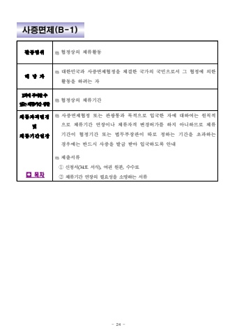 - 24 -%uc0ac%uc99d%uba74%uc81c(B-1)%ud65c%ub3d9%ubc94%uc704%ud611%uc815%uc0c1%uc758 %uccb4%ub958%ud65c%ub3d9%ud574%ub2f9%uc790%ub300%ud55c%ubbfc%uad6d%uacfc %uc0ac%uc99d%uba74%uc81c%ud611%uc815%uc744 %uccb4%uacb0%ud55c %uad6d%uac00%uc758 %uad6d%ubbfc%uc73c%ub85c%uc11c %uadf8 %ud611%uc815%uc5d0 %uc758%ud55c %ud65c%ub3d9%uc744 %ud558%ub824%ub294 %uc7901%ud68c%uc5d0%ubd80%uc5ec%ud560%uc218%uc788%ub294%uccb4%ub958%uae30%uac04%uc0c1%ud55c%ud611%uc815%uc0c1%uc758 %uccb4%ub958%uae30%uac04%uccb4%ub958%uc790%uaca9%ubcc0%uacbd%ubc0f%uccb4%ub958%uae30%uac04%uc5f0%uc7a5%uf000%uc0ac%uc99d%uba74%uc81c%ud611%uc815 %ub610%ub294 %uad00%uad11%ud1b5%uacfc %ubaa9%uc801%uc73c%ub85c %uc785%uad6d%ud55c %uc790%uc5d0 %ub300%ud558%uc5ec%ub294 %uc6d0%uce59%uc801%uc73c%ub85c %uccb4%ub958%uae30%uac04 %uc5f0%uc7a5%uc774%ub098 %uccb4%ub958%uc790%uaca9 %ubcc0%uacbd%ud5c8%uac00%ub97c %ud558%uc9c0 %uc544%ub2c8%ud558%ubbc0%ub85c %uccb4%ub958%uae30%uac04%uc774 %ud611%uc815%uae30%uac04 %ub610%ub294 %ubc95%ubb34%ubd80%uc7a5%uad00%uc774 %ub530%ub85c %uc815%ud558%ub294 %uae30%uac04%uc744 %ucd08%uacfc%ud558%ub294%uacbd%uc6b0%uc5d0%ub294 %ubc18%ub4dc%uc2dc %uc0ac%uc99d%uc744 %ubc1c%uae09 %ubc1b%uc544 %uc785%uad6d%ud558%ub3c4%ub85d %uc548%ub0b4%uc81c%ucd9c%uc11c%ub958%u2460%uc2e0%uccad%uc11c(34%ud638 %uc11c%uc2dd),%uc5ec%uad8c %uc6d0%ubcf8,%uc218%uc218%ub8cc%u2461%uccb4%ub958%uae30%uac04 %uc5f0%uc7a5%uc758 %ud544%uc694%uc131%uc744 %uc18c%uba85%ud558%ub294 %uc11c%ub958