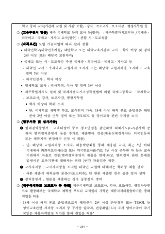 - 254 -%ud559%uad50 %ub4f1%uc758 %uad50%uc0ac(%uae30%uac04%uc81c %uad50%uc6d0 %ubc0f %uc0ac%uac10 %ud3ec%ud568)%u2024%uac15%uc0ac%ubcf4%uc870%uad50%uc0ac%u30fb%ubcf4%uc870%uc0ac%uac10%u30fb%ud589%uc815%uc0ac%ubb34%uc6d0 %ub4f1%u274d (%uace0%uc6a9%ucd94%ucc9c%uc11c %ubc1c%uae09)%uc81c%uc8fc %uad6d%uc81c%ud559%uad50 %ub4f1%uc758 %uad50%uc0ac %ub4f1(%ud544%uc218):%uc81c%uc8fc%ud2b9%ubcc4%uc790%uce58%ub3c4%uc9c0%uc0ac /%uad6d%uc81c%uc911%u2024%uc678%uad6d%uc5b4%uace0%u2024%uad6d%uc81c%uace0%u2024%uc790%uc0ac%uace0 %uad50%uc0ac(%ud544%uc218):%uad00%ud560 %uc2dc%u2024%ub3c4%uad50%uc721%uac10%u274d (%uc790%uaca9%uc694%uac74)%ub3c4%uc785 %uac00%ub2a5%uc9c1%uc5c5%uc5d0 %ub530%ub77c %ub2ec%ub9ac %uc815%ud568%u2023%uc678%uad6d%uc778%ud559%uad50(%uc678%uad6d%uc778%uc720%uce58%uc6d0),%ub300%uc548%ud559%uad50 %ub610%ub294 %uc678%uad6d%uad50%uc721%uae30%uad00%uc758 %uad50%uc0ac :%ud559%uc0ac %uc774%uc0c1 %ubc0f %uacbd%ub825 2%ub144 %uc774%uc0c1 (%ub610%ub294 %ud574%ub2f9%uad6d %uad50%uc6d0%uc790%uaca9)%u2023%uad6d%uc81c%uace0 %ub610%ub294 %uc2dc%u2024%ub3c4%uad50%uc721%uac10 %ucd94%ucc9c %uad6d%uc81c%uc911%u2024%uc678%uad6d%uc5b4%uace0%u2024%uad6d%uc81c%uace0%u2024%uc790%uc0ac%uace0 %ub4f1-%uc678%uad6d%uc778 %uad50%uc0ac :%uc6b0%ub9ac%ub098%ub77c %uad50%uc6d0%uc790%uaca9 %uc18c%uc9c0%uc790 %ub610%ub294 %ud574%ub2f9%uad6d %uad50%uc6d0%uc790%uaca9%uc744 %uc18c%uc9c0%ud558%uace0 %uad50%uc721%uacbd%ub8253%ub144 %uc774%uc0c1-%uc678%uad6d%uc778%uac15%uc0ac :%ud559%uc0ac %uc774%uc0c1%u2023%uc601%uc7ac%ud559%uad50 %uad50%uc0ac :%ubc15%uc0ac%ud559%uc704,%uc11d%uc0ac %ubc0f %uacbd%ub825 3%ub144 %uc774%uc0c1%u2023%uc81c%uc8fc%ud2b9%ubcc4%uc790%uce58%ub3c4 %uc124%uce58 %ubc0f %uad6d%uc81c%uc790%uc720%ub3c4%uc2dc%uc870%uc131%ud2b9%ubcc4%ubc95%uc5d0 %uc758%ud55c %uad6d%uc81c%uace0%ub4f1%ud559%uad50 %u2024%uad6d%uc81c%ud559%uad50-%ubcf4%uc870%uad50%uc0ac,%uac15%uc0ac,%ubcf4%uc870%uc0ac%uac10,%ud589%uc815%uc0ac%ubb34%uc6d0 %u2022%ud559%uc0ac %uc774%uc0c1%uc758 %ud559%uc704 %uc18c%uc9c0%u2022%ub2e8,%uad6d%uc81c%ud559%uad50 %uc7ac%ud559%uc0dd %ubd80%ubaa8,%uad50%uc9c1%uc6d0%uc758 %uac00%uc871,18%uc138 %uc774%uc0c1 %ud574%uc678 %ubcf8%uad50 %uc878%uc5c5%uc0dd%uc740 %ud574%ub2f9%ubd84%uc57c2%ub144 %uc774%uc0c1 %uadfc%ubb34 %uacbd%ub825 %ub610%ub294 TELSOL%ub4f1 %uc601%uc5b4%uad50%uc721 %uad00%ub828 %uc790%uaca9%uc99d %uc18c%uc9c0%u274d (%ucca8%ubd80%uc11c%ub958 %ubc0f %uc2ec%uc0ac%uae30%uc900)%u2776%ubc94%uc8c4%uacbd%ub825%uc99d%uba85%uc11c :%uad50%uc721%ub300%uc0c1%uc774 %uc8fc%ub85c %uccad%uc18c%ub144%uc784%uc744 %uac10%uc548%ud558%uc5ec %ud68c%ud654%uc9c0%ub3c4(E-2)%uac15%uc0ac%uc5d0 %uc900%ud558%uc5ec %ubc94%uc8c4%uacbd%ub825%uc99d%uba85%uc11c %ub4f1%uc744 %ucd94%uac00%ub85c %uc81c%ucd9c%ubc1b%uc544 %uac80%uc99d(%ucc44%uc6a9%uc2e0%uccb4%uac80%uc0ac%uc11c%ub294 %uc678%uad6d%uc778%ub4f1%ub85d %ub610%ub294 %uccb4%ub958%uc790%uaca9 %ubcc0%uacbd%ud5c8%uac00 %uc2e0%uccad %uc2dc %uc81c%ucd9c)-%ub2e8,%ud574%ub2f9%uad6d %uad50%uc6d0%uc790%uaca9%uc99d %uc18c%uc9c0%uc790,%ucc44%uc6a9%ubc15%ub78c%ud68c%ub97c %ud1b5%ud574 %ucc44%uc6a9%ub41c %uad50%uc0ac,%ucd5c%uadfc 5%ub144 %uc774%ub0b4 %uad6d%ub0b4%uc5d0%uc11c %ud68c%ud654%uc9c0%ub3c4%uac15%uc0ac(E-2)%ub610%ub294 %uc678%uad6d%uc778%uad50%uc0ac(E-7)%ub85c 3%ub144 %uc774%uc0c1 %uadfc%ubb34%ud55c %uc790 %ub4f1%uc740 %uad50%uc721%uae30%uad00%uc5d0%uc11c %uc790%uc728%ub85c %uac80%uc99d(%ubc94%uc8c4%uacbd%ub825%uc99d%uba85%uc11c %uc81c%ucd9c%uc744 %uba74%uc81c)%ud558%uace0,%ubc94%uc8c4%uacbd%ub825 %uad00%ub828 %ubb38%uc81c%ub97c %ubc1c%uc0dd%uc2dc%ud0a8 %uad50%uc721%uae30%uad00%uc5d0 %ub300%ud574%uc11c%ub294 %ucd5c%ub300 2%ub144%uac04 %uc790%uc728%uac80%uc99d %uc81c%ud55c%u2777%uad50%uc0ac%uc790%uaca9%uc99d :%uad50%uc0ac%uc790%uaca9%uc99d%uc744 %uc18c%uc9c0%ud55c %uc678%uad6d%uc778 %uad50%uc6d0%uc5d0 %ub300%ud574%uc11c%ub294 %ud559%uc704%uc99d %uc81c%ucd9c %uc0dd%ub7b5-%uc0ac%ubcf8 %uc81c%ucd9c%uc2dc %uc7ac%uc678%uacf5%uad00 %uacf5%uc99d(%uc544%ud3ec%uc2a4%ud2f0%uc720),%ub2e8 %uc6d0%ubcf8 %uc81c%ucd9c%ud560 %uacbd%uc6b0 %uacf5%uc99d %uc808%ucc28 %uc0dd%ub7b5%u2778%uacbd%ub825%uc99d%uba85%uc11c :%uc6d0%ubcf8%uc744 %uc81c%ucd9c%ud558%ub294 %uacbd%uc6b0 %uacf5%uc99d%uc808%ucc28 %uc0dd%ub7b5%u274d (%uc81c%uc8fc%uad6d%uc81c%ud559%uad50 %ubcf4%uc870%uad50%uc0ac %ub4f1 %ud2b9%ub840)%uc81c%uc8fc%uad6d%uc81c%ud559%uad50 %ubcf4%uc870%uad50%uc0ac,%uac15%uc0ac,%ubcf4%uc870%uc0ac%uac10,%ud589%uc815%uc0ac%ubb34%uc6d0%uc73c%ub85c %ud65c%ub3d9%ud558%ub824%ub294 %uad6d%uc81c%ud559%uad50 %uc7ac%ud559%uc0dd %ubd80%ubaa8%ub098 %uad50%uc9c1%uc6d0%uc758 %uac00%uc871%uc740 %uccb4%ub958%uc790%uaca9%uc678%ud65c%ub3d9%ud5c8%uac00%ub97c %ud1b5%ud574%ucde8%uc5c5%uc744 %ud5c8%uc6a9-18%uc138 %uc774%uc0c1 %ud574%uc678 %ubcf8%uad50 %uc878%uc5c5%uc0dd%uc73c%ub85c%uc11c %ud574%ub2f9%ubd84%uc57c 2%ub144 %uc774%uc0c1 %uadfc%ubb34%uacbd%ub825 %ub610%ub294 TESOL%ub4f1 %uc601%uc5b4%uad50%uc721%uad00%ub828 %uc790%uaca9%uc99d %uc18c%uc9c0%uc790 %uc911 %ubb34%uc0ac%uc99d %uc785%uad6d%uc790,%uad00%uad11%ucde8%uc5c5(H-1)%uc790%uaca9 %uc601%uc5b4%ubaa8%uad6d%uc5b4 %uad6d%uac00 %uad6d%ubbfc%uc740%uccb4%ub958%uc790%uaca9%ubcc0%uacbd %ud5c8%uac00%ub97c %ud1b5%ud574 %ucde8%uc5c5%uc744 %ud5c8%uc6a9*