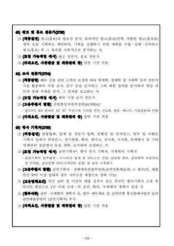- 258 -43)%uad11%uace0 %ubc0f %ud64d%ubcf4 %uc804%ubb38%uac00(2733)%u274d (%uc9c1%uc885%uc124%uba85)%uad11%uace0(%ud64d%ubcf4)%uc758 %ud544%uc694%uc131 %ubd84%uc11d,%ud6a8%uacfc%uc801%uc778 %uad11%uace0(%ud64d%ubcf4)%uc804%ub7b5,%uc801%ud569%ud55c %uad11%uace0(%ud64d%ubcf4%ubb3c)%uc81c%uc791 %ub4f1%uc744 %uae30%ud68d%ud558%uace0 %uc81c%uc548%ud558%uba70,%uae30%ud68d%uc744 %uc2e4%ud589%ud558%uae30 %uc704%ud55c %uacc4%ud68d%uc744 %uc218%ub9bd%u2024%uc2e4%ud589%u2024%uac10%ub3c5%ud558%uace0 %uad11%uace0(%ud64d%ubcf4)%ud6c4 %uadf8 %ud6a8%uacfc%ub97c %uc0ac%ud6c4%uc801%uc73c%ub85c %ubd84%uc11d%ud558%ub294 %uc790%u274d(%ub3c4%uc785 %uac00%ub2a5%uc9c1%uc5c5 %uc608%uc2dc)%uad11%uace0 %uc804%ubb38%uac00,%ud64d%ubcf4 %uc804%ubb38%uac00%u274d (%uc790%uaca9%uc694%uac74,%uc0ac%uc99d%ubc1c%uae09 %ubc0f %uccb4%ub958%uad00%ub9ac %ub4f1)%uc77c%ubc18 %uae30%uc900 %uc801%uc6a944)%uc870%uc0ac %uc804%ubb38%uac00(2734)%u274d (%uc9c1%uc885%uc124%uba85)%ud574%uc678 %uc9c4%ucd9c %uad00%ub828 %uace0%uac1d%uc758 %uc694%uccad%uc5d0 %ub530%ub77c %ud1b5%uacc4%ud559,%uacbd%uc81c%ud559 %ubc0f %uc0ac%ud68c%ud559 %ub4f1%uc758 %uc804%ubb38%uc9c0%uc2dd%uc744%ud65c%uc6a9%ud558%uc5ec %uac01%uc885 %uc870%uc0ac,%uc5f0%uad6c %ub4f1%uc744 %uc2e4%uc2dc%ud558%uace0 %uadf8%uc5d0 %ub300%ud55c %uacb0%uacfc%ub97c %ubd84%uc11d%ud558%uc5ec %ud604%uc0c1 %ud30c%uc545%uacfc %uc7a5%ub798 %ucd94%uc138%ub97c %ubd84%uc11d,%uadf8 %uacb0%uacfc%ub97c %ubcf4%uace0%ud558%ub294 %uc790 %u274d(%ub3c4%uc785 %uac00%ub2a5%uc9c1%uc5c5 %uc608%uc2dc)%ud574%uc678 %uc2dc%uc7a5 %uc870%uc0ac %uc804%ubb38%uac00%u274d (%uace0%uc6a9%ucd94%ucc9c%uc11c %ubc1c%uae09)%uc0b0%uc5c5%ud1b5%uc0c1%uc790%uc6d0%ubd80%uc7a5%uad00(KOTRA)**%uace8%ub4dc%uce74%ub4dc8%ub300%ubd84%uc57c(IT,NT,BT,%uc218%uc1a1%uae30%uacc4,%ub514%uc9c0%ud138%uc804%uc790,%uc2e0%uc18c%uc7ac,%ud658%uacbd%u2024%uc5d0%ub108%uc9c0,%uae30%uc220%uacbd%uc601)%uc5d0%ud55c%ud568%u274d (%uc790%uaca9%uc694%uac74,%uc0ac%uc99d%ubc1c%uae09 %ubc0f %uccb4%ub958%uad00%ub9ac %ub4f1)%uc77c%ubc18 %uae30%uc900 %uc801%uc6a9%ud589%uc0ac %uae30%ud68d%uc790%u274d (%uc9c1%uc885%uc124%uba85)%uad00%uad11%ud611%ud68c,%uc5c5%uacc4 %ubc0f %uc804%ubb38%uac00 %ud611%ud68c,%ucee8%ubca4%uc158 %ubc0f %ucee8%ud37c%ub7f0%uc2a4%uc815%ubd80 %ubc0f %uc774%ubca4%ud2b8 %uae30%ud68d%uc0ac %ub4f1%uc5d0%uc11c %ucee8%ud37c%ub7f0%uc2a4,%uc815%uae30%ucd1d%ud68c,%ud68c%uc758,%uc138%ubbf8%ub098,%uc804%uc2dc%ud68c,%uc2dc%uc0ac%ud68c,%ucd95%uc81c%ud589%uc0ac %ubc0f %uae30%ud0c0 %uc5f0%uc608%uad00%ub828 %uacf5%uc5f0%ud589%uc0ac %ub4f1%uc744 %uacc4%ud68d,%uc870%uc9c1%ud558%uba70 %uc870%uc815%ud558%ub294 %uc790%u274d(%ub3c4%uc785 %uac00%ub2a5%uc9c1%uc5c5 %uc608%uc2dc)%uacf5%uc5f0%uae30%ud68d%uc790*,%ud589%uc0ac %uc804%uc2dc %uae30%ud68d%uc790,%uad6d%uc81c%ud68c%uc758 %uae30%ud68d%uc790*%uacf5%uc5f0%uae30%ud68d%uc790%uc5c5%ubb34%ubc94%uc704:%uc2dc%ub098%ub9ac%uc624%uc124%uacc4%ubc0f%uc544%ud2f0%uc2a4%ud2b8%uc120%uc815,%uacf5%uc5f0%uc7a5%uc900%ube44,%uacf5%uc5f0%uc81c%uc791%ud504%ub85c%ub4c0%uc2f1%ubc0f%ub9c8%ucf00%ud305,%uacf5%uc5f0%uc9c4%ud589%uad00%ub9ac(%uace0%uac1d%uc548%uc804%ud3ec%ud568)%ubc0f%uacf5%uc5f0%uc0ac%ud6c4%ud3c9%uac00%u274d (%uace0%uc6a9%ucd94%ucc9c%uc11c %ubc1c%uae09)%uacf5%uc5f0%uae30%ud68d%uc790 :%ubb38%ud654%uccb4%uc721%uad00%uad11%ubd80%uc7a5%uad00(%uacf5%uc5f0%uc804%ud1b5%uc608%uc220%uacfc)%u203b%ud544%uc218(%ub2e8,%ub9e4%ucd9c%uc5f0%uac04 50%uc5b5 %uc774%uc0c1 %uc5c5%uccb4%uc758 %uacbd%uc6b0 %uc0ac%ubb34%uc18c%uc7a5 %uc7ac%ub7c9%uc73c%ub85c %uc0dd%ub7b5 %uac00%ub2a5)%u274d (%uace0%uc6a9%uc5c5%uccb4%uc694%uac74)%uc5f0%uac04 10%uc5b5 %uc6d0 %uc774%uc0c1%uc758 %ub9e4%ucd9c %uc2e4%uc801%uc774 %uc788%uace0 %uc678%uad6d%uc778 %ud589%uc0ac%uae30%ud68d%uc790 %uace0%uc6a9 %ud6c4 %uc678%uad6d%uc778%ub300%uc0c1%uc73c%ub85c 1%ub144 %uc774%ub0b4 %uad6d%ub0b4%u2024%uc678 %uacf5%uc5f0,%ud68c%uc758,%uad6d%uc81c%ud589%uc0ac %uacc4%ud68d%uc774 %uc788%uc744 %uac83%u274d (%ucca8%ubd80%uc11c%ub958)%uacf5%uc5f0%u2024%uad6d%uc81c%ud68c%uc758 %uacc4%ud68d%uc11c %ub4f1,%ubc95%ubb34 %uc7ac%ubb34%uc81c%ud45c %ubc0f %uacf5%uc5f0%ud2f0%ucf13 %ud1b5%uc2e0%ud310%ub9e4%uc0ac%uc5c5%uc790 %ub4f1%uc758%uacf5%uc5f0%ub9e4%ucd9c%uc99d%uba85%uc11c (%uacf5%uc5f0%uae30%ud68d%uc790)%ucd94%uac00%u274d (%uc790%uaca9%uc694%uac74,%uc0ac%uc99d%ubc1c%uae09 %ubc0f %uccb4%ub958%uad00%ub9ac %ub4f1)%uc77c%ubc18 %uae30%uc900 %uc801%uc6a9