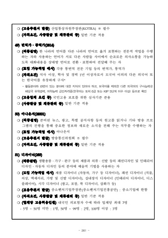 - 261 -%u274d (%uace0%uc6a9%ucd94%ucc9c%uc11c %ubc1c%uae09)%uc0b0%uc5c5%ud1b5%uc0c1%uc790%uc6d0%ubd80%uc7a5%uad00(KOTRA)%u203b%ud544%uc218%u274d (%uc790%uaca9%uc694%uac74,%uc0ac%uc99d%ubc1c%uae09 %ubc0f %uccb4%ub958%uad00%ub9ac %ub4f1)%uc77c%ubc18 %uae30%uc900 %uc801%uc6a949)%ubc88%uc5ed%uac00%u2024%ud1b5%uc5ed%uac00(2814)%u274d (%uc9c1%uc885%uc124%uba85)%ud55c %ub098%ub77c%uc758 %uc5b8%uc5b4%ub97c %ub2e4%ub978 %ub098%ub77c%uc758 %uc5b8%uc5b4%ub85c %uc62e%uaca8 %ud45c%ud604%ud558%ub294 %uc804%ubb38%uc801 %uc791%uc5c5%uc744 %uc218%ud589%ud558%ub294%uc790%uc640 %uc0ac%uc6a9%ud558%ub294 %uc5b8%uc5b4%uac00 %uc11c%ub85c %ub2e4%ub978 %uc0ac%ub78c%ub4e4 %uc0ac%uc774%uc5d0%uc11c %uc21c%uc870%ub85c%uc6b4 %uc758%uc0ac%uc18c%ud1b5%uc744 %uac00%ub2a5%ud558%ub3c4%ub85d %ub300%ud654%ub0b4%uc6a9%uc744 %uc0c1%ub300%ubc29 %uc5b8%uc5b4%ub85c %uc804%ud658%u2024%ud45c%ud604%ud558%uc5ec %uc804%ub2ec%ud574 %uc8fc%ub294 %uc790%u274d(%ub3c4%uc785 %uac00%ub2a5%uc9c1%uc5c5 %uc608%uc2dc)%uac01%uc885 %ud1b5%ubc88%uc5ed %uc804%ubb38 %uae30%uc5c5 %ub4f1%uc758 %ubc88%uc5ed%uac00,%ud1b5%uc5ed%uac00%u274d (%uc790%uaca9%uc694%uac74)%uc11d%uc0ac %uc774%uc0c1,%ud559%uc0ac %ubc0f %uacbd%ub825 1%ub144 %uc774%uc0c1%uc790%ub85c%uc11c %ubaa8%uad6d%uc5b4 %uc774%uc678%uc758 %ub2e4%ub978 %uc678%uad6d%uc5b4 %ub610%ub294 %ud55c%uad6d%uc5b4%ub97c %uc720%ucc3d%ud558%uac8c %uad6c%uc0ac**%ud65c%ub3d9%ubd84%uc57c%uc640%uad00%ub828%uc774%uc788%ub294%ubd84%uc57c%uc5d0%ub300%ud55c%uc9c0%uc2dd%uc774%uc788%uc5b4%uc57c%ud558%uace0,%ubaa8%uad6d%uc5b4%ub97c%uc81c%uc678%ud55c%ub2e4%ub978%uc678%uad6d%uc5b4%uc758%uad6c%uc0ac%ub2a5%ub825%uc740%ud574%ub2f9%uad6d%uc720%ud559%uacbd%ub825,%uc5b4%ud559%ub2a5%ub825%uacf5%uc778%uc790%uaca9%uc99d(%ud55c%uad6d%uc5b4%ub294%ud1a0%ud53d6%uae09%ub610%ub294KIIP5%ub2e8%uacc4%uc774%uc218%uc774%uc0c1)%ub4f1%uc73c%ub85c%ud655%uc778%u274d(%uace0%uc6a9%uc5c5%uccb4 %uc694%uac74 %ub4f1)%uad6d%ubbfc%uace0%uc6a9 %ubcf4%ud638%ub97c %uc704%ud55c %uc2ec%uc0ac%uae30%uc900 %uc900%uc6a9 %u274d (%uc0ac%uc99d%ubc1c%uae09 %ubc0f %uccb4%ub958%uad00%ub9ac %ub4f1)%uc77c%ubc18 %uae30%uc900 %uc801%uc6a950)%uc544%ub098%uc6b4%uc11c(28331)%u274d (%uc9c1%uc885%uc124%uba85)%uc900%ube44%ub41c %ub274%uc2a4,%uad11%uace0,%ud2b9%ubcc4 %uacf5%uc9c0%uc0ac%ud56d %ub4f1%uc758 %uc6d0%uace0%ub97c %uc77d%uac70%ub098 %uae30%ud0c0 %ubc29%uc1a1 %ud504%ub85c%uadf8%ub7a8%uc758%uc9c4%ud589%uc744 %ud1b5%ud574 %uc911%uc694%ud55c %uc815%ubcf4%uc640 %uc0c8%ub85c%uc6b4 %uc18c%uc2dd%uc744 %uc804%ud574 %uc8fc%ub294 %uc9c1%ubb34%ub97c %uc218%ud589%ud558%ub294 %uc790%u274d(%ub3c4%uc785 %uac00%ub2a5%uc9c1%uc5c5 %uc608%uc2dc)%uc544%ub098%uc6b4%uc11c%u274d (%uace0%uc6a9%ucd94%ucc9c%uc11c %ubc1c%uae09)%ubc29%uc1a1%ud1b5%uc2e0%uc704%uc6d0%ud68c %u203b%ud544%uc218%u274d (%uc790%uaca9%uc694%uac74,%uc0ac%uc99d%ubc1c%uae09 %ubc0f %uccb4%ub958%uad00%ub9ac %ub4f1)%uc77c%ubc18 %uae30%uc900 %uc801%uc6a951)%ub514%uc790%uc774%ub108(285)%u274d (%uc9c1%uc885%uc124%uba85)%uc0dd%ud65c%uc6a9%ud488%u2024%uac00%uad6c%u2024%uc644%uad6c %ub4f1%uc758 %uc81c%ud488%uacfc %uc758%ub958%u2024%uc2e0%ubc1c %ub4f1%uc758 %ud328%uc158%ub514%uc790%uc778 %ubc0f %uc778%ud14c%ub9ac%uc5b4%ub514%uc790%uc778%u2024%uc790%ub3d9%ucc28 %ub514%uc790%uc778 %ub4f1%uc758 %ubd84%uc57c%uc5d0 %uc608%uc220%uc801 %uae30%ubc95%uc744 %uc0ac%uc6a9%ud558%ub294 %uc790%u274d(%ub3c4%uc785 %uac00%ub2a5%uc9c1%uc5c5 %uc608%uc2dc)%uc81c%ud488 %ub514%uc790%uc774%ub108 (%uc790%ub3d9%ucc28,%uac00%uad6c %ub4f1 %ub514%uc790%uc774%ub108),%ud328%uc158 %ub514%uc790%uc774%ub108 (%uc9c1%ubb3c,%uc758%uc0c1,%uc561%uc138%uc11c%ub9ac,%uac00%ubc29 %ubc0f %uc2e0%ubc1c %ub514%uc790%uc774%ub108),%uc2e4%ub0b4%uc7a5%uc2dd %ub514%uc790%uc774%ub108 (%uc778%ud14c%ub9ac%uc5b4 %ub514%uc790%uc774%ub108,%ub514%uc2a4%ud50c%ub808%uc774%uc5b4),%uc2dc%uac01 %ub514%uc790%uc774%ub108 (%uad11%uace0,%ud3ec%uc7a5,%ubd81 %ub514%uc790%uc774%ub108,%uc0bd%ud654%uac00 %ub4f1)%u274d (%uace0%uc6a9%ucd94%ucc9c%uc11c %ubc1c%uae09)%uc911%uc18c%ubca4%ucc98%uae30%uc5c5%ubd80%uc7a5%uad00(%uc911%uc18c%ubca4%ucc98%uae30%uc5c5%uc9c4%ud765%uacf5%ub2e8):%uc911%uc18c%uae30%uc5c5%uc5d0 %ud55c%ud568%u274d (%uc790%uaca9%uc694%uac74,%uc0ac%uc99d%ubc1c%uae09 %ubc0f %uccb4%ub958%uad00%ub9ac %ub4f1)%uc77c%ubc18 %uae30%uc900 %uc801%uc6a9%u274d (%uc5c5%uccb4%ub2f9 %uace0%uc6a9%ud5c8%uc6a9%uc778%uc6d0)%ub0b4%uad6d%uc778 %ud53c%ubcf4%ud5d8%uc790 %uc218%uc5d0 %ub530%ub77c %uc5c5%uccb4%ub2f9 %ucd5c%ub300 3%uba85-5%uba85 ~50%uba85 %ubbf8%ub9cc :1%uba85,50%uba85 ~99%uba85 :2%uba85,100%uba85 %uc774%uc0c1 :3%uba85