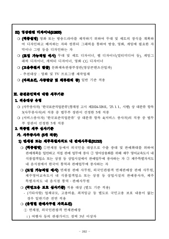 - 262 -52)%uc601%uc0c1%uad00%ub828 %ub514%uc790%uc774%ub108(S2855)%u274d (%uc9c1%uc885%uc124%uba85)%uc601%ud654 %ub610%ub294 %ubc29%uc1a1%ub4dc%ub77c%ub9c8%ub97c %uc81c%uc791%ud558%uae30 %uc704%ud558%uc5ec %ubb34%ub300 %ubc0f %uc138%ud2b8%uc758 %uc7a5%uc2dd%uc744 %uacc4%ud68d%ud558%uc5ec %ub514%uc790%uc778%ud558%uace0 %ubc30%uce58%ud558%ub294 %uc790%uc640 %ucef4%ud4e8%ud130 %uadf8%ub798%ud53d%uc744 %ud1b5%ud558%uc5ec %ubc29%uc1a1,%uc601%ud654,%uac8c%uc784%uc5d0 %ud544%uc694%ud55c %uc790%ub9c9%uc774%ub098%uadf8%ub9bc %ub4f1%uc744 %ub514%uc790%uc778%ud558%ub294 %uc790%u274d(%ub3c4%uc785 %uac00%ub2a5%uc9c1%uc5c5 %uc608%uc2dc)%ubb34%ub300 %ubc0f %uc138%ud2b8 %ub514%uc790%uc774%ub108,%uc6f9 %ub514%uc790%uc774%ub108(%uba40%ud2f0%ubbf8%ub514%uc5b4 %ub4f1),%uac8c%uc784%uadf8%ub798%ud53d %ub514%uc790%uc774%ub108,%uce90%ub9ad%ud130 %ub514%uc790%uc774%ub108,%uc601%ud654 CG%ub514%uc790%uc774%ub108%u274d (%uace0%uc6a9%ucd94%ucc9c%uc11c %ubc1c%uae09)%ubb38%ud654%uccb4%uc721%uad00%uad11%ubd80%uc7a5%uad00(%uc601%uc0c1%ucf58%ud150%uce20%uc0b0%uc5c5%uacfc)-%ucd94%ucc9c%ub300%uc0c1 :%uc601%ud654 %ubc0f TV%ud504%ub85c%uadf8%ub7a8 %uc81c%uc791%uc5c5%uccb4 %u274d (%uc790%uaca9%uc694%uac74,%uc0ac%uc99d%ubc1c%uae09 %ubc0f %uccb4%ub958%uad00%ub9ac %ub4f1)%uc77c%ubc18 %uae30%uc900 %uc801%uc6a9%u2162.%uc900%uc804%ubb38%uc778%ub825%uc5d0 %ub300%ud55c %uc138%ubd80%uae30%uc9001.%uc801%uc6a9%ub300%uc0c1 %uc720%ud615 %u274d (%uc0ac%ubb34%uc885%uc0ac%uc790)%u2018%ud55c%uad6d%ud45c%uc900%uc9c1%uc5c5%ubd84%ub958%u2019(%ud1b5%uacc4%uccad %uace0%uc2dc %uc81c2024-328%ud638,%u201925.1.1.,%uc2dc%ud589)%uc0c1 %ub300%ubd84%ub958 %ud56d%ubaa9 3(%uc0ac%ubb34%uc885%uc0ac%uc790)%uc758 %uc9c1%uc885 %uc911 %ubc95%ubb34%ubd80 %uc7a5%uad00%uc774 %uc120%uc815%ud55c 5%uac1c %uc9c1%uc885%u274d (%uc11c%ube44%uc2a4%uc885%uc0ac%uc790)%u2018%ud55c%uad6d%ud45c%uc900%uc9c1%uc5c5%ubd84%ub958%u2019%uc0c1 %ub300%ubd84%ub958 %ud56d%ubaa9 4(%uc11c%ube44%uc2a4 %uc885%uc0ac%uc790)%uc758 %uc9c1%uc885 %uc911 %ubc95%ubb34%ubd80 %uc7a5%uad00%uc774 %uc120%uc815%ud55c 5%uac1c %uc9c1%uc8852.%uc9c1%uc885%ubcc4 %uc138%ubd80 %uc2ec%uc0ac%uae30%uc900%uac00.%uc0ac%ubb34%uc885%uc0ac%uc790 (5%uac1c %uc9c1%uc885)1)%uba74%uc138%uc810 %ub610%ub294 %uc81c%uc8fc%ud2b9%ubcc4%uc790%uce58%ub3c4 %ub0b4 %ud310%ub9e4%uc0ac%ubb34%uc6d0(31215)%u274d (%uc9c1%uc885%uc124%uba85)%u2460%uba74%uc138%uc810 %ub4f1%uc5d0%uc11c %uc678%uad6d%uc778%uc744 %ub300%uc0c1%uc73c%ub85c %uc218%ucd9c %uc99d%ub300 %ubc0f %ud310%ub9e4%ud655%ub300%ub97c %uc704%ud558%uc5ec %ud310%ub9e4%uacc4%ud68d%uc744 %uc785%uc548%ud558%uace0 %uc9c1%uc811 %ud310%ub9e4 %uc5c5%ubb34%uc5d0 %uc885%uc0ac %u2461%uc601%uc5b4%uc0c1%uc6a9%ud654%ub97c %uc704%ud574 %uc81c%uc8fc %uc601%uc5b4%uad50%uc721%ub3c4%uc2dc %ub0b4%uc2dd%ud488%uc811%uac1d%uc5c5%uc18c %ub610%ub294 %uc0c1%uc810 %ub4f1 %uc0c1%uc5c5%uc2dc%uc124%uc5d0%uc11c %ud310%ub9e4%uc5c5%ubb34%uc5d0 %uc885%uc0ac%ud558%ub294 %uc790 %u2462%uc81c%uc8fc%ud2b9%ubcc4%uc790%uce58%ub3c4%ub0b4 %uc74c%uc2dd%uc810%uc5d0%uc11c %ud55c%uad6d%uc5b4 %ud1b5%uc5ed%uacfc %ud310%ub9e4%uc5c5%ubb34%uc5d0 %uc885%uc0ac%ud558%ub294 %uc790%u274d(%ub3c4%uc785 %uac00%ub2a5%uc9c1%uc5c5 %uc608%uc2dc)%uba74%uc138%uc810 %ud310%ub9e4 %uc0ac%ubb34%uc6d0,%uc678%uad6d%uc778%uad00%uad11%uac1d %uba74%uc81c%ud310%ub9e4%uc7a5 %ud310%ub9e4 %uc0ac%ubb34%uc6d0,%uc81c%uc8fc%uc601%uc5b4%uad50%uc721%ub3c4%uc2dc %ub0b4 %uc2dd%ud488%uc811%uac1d%uc5c5%uc18c %ub610%ub294 %uc0c1%uc810 %ub4f1 %uc0c1%uc5c5%uc2dc%uc124%uc758 %ud310%ub9e4%uc885%uc0ac%uc790,%uc81c%uc8fc%ud2b9%ubcc4%uc790%uce58%ub3c4 %ub0b4 %uc74c%uc2dd%uc810 %ud1b5%uc5ed%u2024%ud310%ub9e4%uc0ac%ubb34%uc6d0 %u274d(%uad6d%ubbfc%uace0%uc6a9 %ubcf4%ud638 %uc2ec%uc0ac%uae30%uc900)%uc801%uc6a9 %ub300%uc0c1 (%ubcc4%ub3c4 %uae30%uc900 %uc801%uc6a9)-(%uae30%ud0c0%uc0ac%ud56d)%uc5c5%uccb4%uaddc%ubaa8,%uace0%uc6a9%ube44%uc728,%ucd5c%uc800%uc784%uae08 %ub4f1 %ubcc4%ub3c4%ub85c %uad6d%ubbfc%uace0%uc6a9 %ubcf4%ud638 %ub0b4%uc6a9%uc774 %uc5c6%ub294 %uacbd%uc6b0%uc77c%ubc18%uae30%uc900 %uc804%uba74 %uc801%uc6a9%u274d (%uc720%ud615%ubcc4 %ud310%ub9e4%uc0ac%ubb34%uc6d0 %uc790%uaca9%uc694%uac74)%u2460%uba74%uc138%uc810,%uc678%uad6d%uc778%uad00%uad11%uac1d %uba74%uc138%ud310%ub9e4%uc7a5 %u2170)%uc5ec%ud589%uc0ac %ub4f1%uc758 %uad00%uad11%uac00%uc774%ub4dc %uacbd%ub825 3%ub144 %uc774%uc0c1%uc790