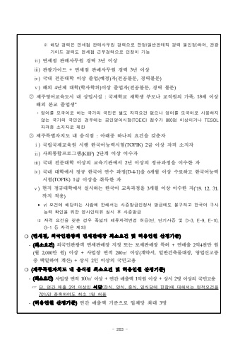 - 263 -%u203b%ud574%ub2f9%uacbd%ub825%uc740%uba74%uc138%uc810%ud310%ub9e4%uc0ac%ubb34%uc6d0%uacbd%ub825%uc73c%ub85c%ud55c%uc815(%uc77c%ubc18%ud310%ub9e4%uc9c1%uacbd%ub825%ubd88%uc778%uc815)%ud558%uba70,%uad00%uad11%uac00%uc774%ub4dc%uacbd%ub825%ub3c4%uba74%uc138%uc810%uadfc%ubb34%uacbd%ub825%uc73c%ub85c%uc778%uc815%uc774%uac00%ub2a5%u2171)%uba74%uc138%uc810 %ud310%ub9e4%uc0ac%ubb34%uc6d0 %uacbd%ub825 3%ub144 %uc774%uc0c1%u2172)%uad00%uad11%uac00%uc774%ub4dc +%uba74%uc138%uc810 %ud310%ub9e4%uc0ac%ubb34%uc6d0 %uacbd%ub825 3%ub144 %uc774%uc0c1%u2173)%uad6d%ub0b4 %uc804%ubb38%ub300%ud559 %uc774%uc0c1 %uc878%uc5c5(%uc608%uc815)%uc790(%uc804%uacf5%ubd88%ubb38,%uacbd%ub825%ubd88%ubb38)%u2174)%ud574%uc678 4%ub144%uc81c %ub300%ud559(%ud559%uc0ac%ud559%uc704)%uc774%uc0c1 %uc878%uc5c5%uc790(%uc804%uacf5%ubd88%ubb38,%uacbd%ub825 %ubd88%ubb38)%u2461%uc81c%uc8fc%uc601%uc5b4%uad50%uc721%ub3c4%uc2dc %ub0b4 %uc0c1%uc5c5%uc2dc%uc124 :%uad6d%uc81c%ud559%uad50 %uc7ac%ud559%uc0dd %ubd80%ubaa8%ub098 %uad50%uc9c1%uc6d0%uc758 %uac00%uc871,18%uc138 %uc774%uc0c1%ud574%uc678 %ubcf8%uad50 %uc878%uc5c5%uc0dd**%uc601%uc5b4%ub97c%ubaa8%uad6d%uc5b4%ub85c%ud558%ub294%uad6d%uac00%uc758%uad6d%ubbfc%uc740%ubcc4%ub3c4%uc790%uaca9%uc694%uac74%uc5c6%uc73c%ub098%uc601%uc5b4%ub97c%ubaa8%uad6d%uc5b4%ub85c%uc0ac%uc6a9%ud558%uc9c0%uc54a%ub294%uad6d%uac00%uc758%uad6d%ubbfc%uc778%uacbd%uc6b0%uc5d0%ub294%uacf5%uc778%uc601%uc5b4%uc2dc%ud5d8(TOEIC)%uc810%uc218%uac00800%uc810%uc774%uc0c1%uc774%uac70%ub098TESOL%uc790%uaca9%uc99d%uc18c%uc9c0%uc790%ub85c%uc81c%ud55c%u2462%uc81c%uc8fc%ud2b9%ubcc4%uc790%uce58%ub3c4 %ub0b4 %uc74c%uc2dd%uc810 :%uc544%ub798%uc911 %ud558%ub098%uc758 %uc694%uac74%uc744 %uac16%ucd98%uc790%u2170)%uad6d%ub9bd%uad6d%uc81c%uad50%uc721%uc6d0 %uc2dc%ud589 %ud55c%uad6d%uc5b4%ub2a5%ub825%uc2dc%ud5d8(TOPIK)2%uae09 %uc774%uc0c1 %uc790%uaca9 %uc18c%uc9c0%uc790 %u2171)%uc0ac%ud68c%ud1b5%ud569%ud504%ub85c%uadf8%ub7a8(KIIP)2%ub2e8%uacc4 %uc774%uc0c1 %uc774%uc218%uc790 %u2172)%uad6d%ub0b4 %uc804%ubb38%ub300%ud559 %uc774%uc0c1%uc758 %uad50%uc721%uae30%uad00%uc5d0%uc11c 2%ub144 %uc774%uc0c1%uc758 %uc815%uaddc%uacfc%uc815%uc744 %uc774%uc218%ud55c %uc790 %u2173)%uad6d%ub0b4 %ub300%ud559%uc5d0%uc11c %uc815%uaddc %ud55c%uad6d%uc5b4 %uc5f0%uc218 %uacfc%uc815(D-4-1)%uc744 6%uac1c%uc6d4 %uc774%uc0c1 %uc218%ub8cc%ud558%uace0 %ud55c%uad6d%uc5b4%ub2a5%ub825%uc2dc%ud5d8(TOPIK)1%uae09 %uc774%uc0c1%uc744 %ucde8%ub4dd%ud55c %uc790%u2174)%ud604%uc9c0 %uc815%uaddc%ub300%ud559%uc5d0%uc11c %uc2e4%uc2dc%ud558%ub294 %ud55c%uad6d%uc5b4 %uad50%uc721%uacfc%uc815%uc744 3%uac1c%uc6d4 %uc774%uc0c1 %uc774%uc218%ud55c %uc790(%u201919.12.31.%uae4c%uc9c0 %uc801%uc6a9)%u25b8v)%uc694%uac74%uc5d0%ud574%ub2f9%ud558%ub294%uc0ac%ub78c%uc5d0%ud55c%ud574%uc11c%ub294%uc0ac%uc99d%ubc1c%uae09%uc778%uc815%uc11c%ubc1c%uae09%uc5d0%ub3c4%ubd88%uad6c%ud558%uace0%ud55c%uad6d%uc5b4%uad6c%uc0ac%ub2a5%ub825%ud655%uc778%uc744%uc704%ud55c%uc601%uc0ac%uc778%ud130%ubdf0%uc2e4%uc2dc%ud6c4%uc0ac%uc99d%ubc1c%uae09%u203b%uc790%uaca9%uc694%uac74%uc744%uac16%ucd98%uacbd%uc6b0%ud3ed%ub113%uac8c%uccb4%ub958%uc790%uaca9%ubcc0%uacbd%ud5c8%uc6a9(%ub2e8,%ub2e8%uae30%uc0ac%uc99d%ubc0fD-3,E-9,E-10,G-1%ub4f1%uc790%uaca9%uc740%uc81c%uc678)%u274d (%uba74%uc138%uc810,%uc678%uad6d%uc778%uad00%uad11%uac1d %uba74%uc138%ud310%ub9e4%uc7a5 %ucd5c%uc18c%uc694%uac74 %ubc0f %ud5c8%uc6a9%uc778%uc6d0 %uc0b0%uc815%uae30%uc900)-(%ucd5c%uc18c%uc694%uac74)%uc678%uad6d%uc778%uad00%uad11%uac1d %uba74%uc138%ud310%ub9e4%uc7a5 %uc9c0%uc815 %ub610%ub294 %ubcf4%uc138%ud310%ub9e4%uc7a5 %ud2b9%ud5c8 +%uc5f0%ub9e4%ucd9c 2%uc5b54%ucc9c%ub9cc %uc6d0(%uc6d4 2,000%ub9cc %uc6d0)%uc774%uc0c1 +%uc0ac%uc5c5%uc7a5 %uba74%uc801 200%u33a1%uc774%uc0c1(%uacc4%uc57d%uc11c,%uc77c%ubc18%uac74%ucd95%ubb3c%ub300%uc7a5,%uc601%uc5c5%uc2e0%uace0%uc99d %uc911%ud0dd%uc77c%ud558%uc5ec %uacc4%uc0b0)+%uc0c1%uc2dc 2%uc778 %uc774%uc0c1%uc758 %uad6d%ubbfc%uace0%uc6a9%u274d(%uc81c%uc8fc%ud2b9%ubcc4%uc790%uce58%ub3c4 %ub0b4 %uc74c%uc2dd%uc810 %ucd5c%uc18c%uc694%uac74 %ubc0f %ud5c8%uc6a9%uc778%uc6d0 %uc0b0%uc815%uae30%uc900)-(%ucd5c%uc18c%uc694%uac74)%uc0ac%uc5c5%uc7a5 %uba74%uc801 100%u33a1%uc774%uc0c1 +%uc5f0%uac04 %ub9e4%ucd9c%uc561 1%uc5b5%uc6d0 %uc774%uc0c1 +%uc0c1%uc2dc 2%uba85 %uc774%uc0c1%uc758 %uad6d%ubbfc%uace0%uc6a9%u261e%ub2e8,%uc5f0%uac04%ub9e4%ucd9c3%uc5b5%uc774%uc0c1%uc778%uc2dd%ub2f9(%ud55c%uc2dd,%uc591%uc2dd,%uc911%uc2dd,%uc77c%uc2dd%ub2f9%uc5d0%ud55c%ud568)%uc5d0%ub300%ud574%uc11c%ub294%uba74%uc801%uc694%uac74%uc74470%%ub9cc%ucda9%uc871%ud558%uc5ec%ub3c4%ucd5c%uc18c1%uba85%ud5c8%uc6a9-(%ud5c8%uc6a9%uc778%uc6d0 %uc0b0%uc815%uae30%uc900)%uc5f0%uac04 %ub9e4%ucd9c%uc561 %uae30%uc900%uc73c%ub85c %uc5c5%uccb4%ub2f9 %ucd5c%ub300 3%uba85