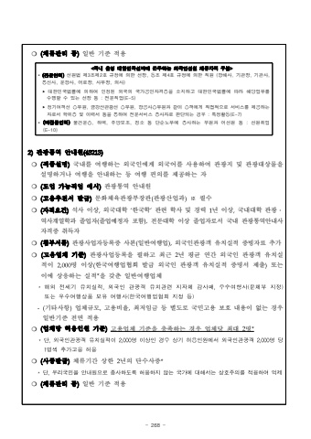- 268 -%u274d (%uccb4%ub958%uad00%ub9ac %ub4f1)%uc77c%ubc18 %uae30%uc900 %uc801%uc6a9<%uad6d%ub0b4 %uc6b4%uc601 %ub300%ud55c%ubbfc%uad6d%uc120%ubc15%uc5d0 %uadfc%ubb34%ud558%ub294 %uc678%uad6d%uc778%uc120%uc6d0 %uccb4%ub958%uc790%uaca9 %uad6c%ubd84>%u2022 (%uc804%ubb38%uc778%ub825)%uc120%uc6d0%ubc95 %uc81c3%uc870%uc81c2%ud638 %uaddc%uc815%uc5d0 %uc758%ud55c %uc120%uc7a5, %ub3d9%uc870 %uc81c4%ud638 %uaddc%uc815%uc5d0 %uc758%ud55c %uc9c1%uc6d0 (%ud56d%ud574%uc0ac, %uae30%uad00%uc7a5, %uae30%uad00%uc0ac, %ud1b5%uc2e0%uc0ac, %uc6b4%ud56d%uc0ac, %uc5b4%ub85c%uc7a5, %uc0ac%ubb34%uc7a5, %uc758%uc0ac)%u2023 %ub300%ud55c%ubbfc%uad6d%ubc95%ub960%uc5d0 %uc758%ud558%uc5ec %uc778%uc815%ub41c %uc678%uad6d%uc758 %uad6d%uac00%uacf5%uc778%uc790%uaca9%uc99d%uc744 %uc18c%uc9c0%ud558%uace0 %ub300%ud55c%ubbfc%uad6d%ubc95%ub960%uc5d0 %ub530%ub77c %ud574%ub2f9%uc5c5%ubb34%ub97c %uc218%ud589%ud560 %uc218 %uc788%ub294 %uc120%uc7a5 %ub4f1 : %uc804%ubb38%uc9c1%uc5c5(E-5)%u2023 %uc815%uae30%uc5ec%uac1d%uc120 %uc2b9%ubb34%uc6d0, %uae08%uac15%uc0b0%uad00%uad11%uc120 %uc2b9%ubb34%uc6d0, %ud56d%uacf5%uc0ac%uc2b9%ubb34%uc6d0%uacfc %uac19%uc774 %uc2b9%uac1d%uc5d0%uac8c %uc9c1%uc811%uc801%uc73c%ub85c %uc11c%ube44%uc2a4%ub97c %uc81c%uacf5%ud558%ub294 %uc790%ub85c%uc11c %ud559%uc704%uc99d %ubc0f %uc774%ub825%uc11c %ub4f1%uc744 %ud1b5%ud558%uc5ec %uc804%ubb38%uc11c%ube44%uc2a4 %uc885%uc0ac%uc790%ub85c %ud310%ub2e8%ub418%ub294 %uacbd%uc6b0 : %ud2b9%uc815%ud65c%ub3d9(E-7)%u2022 (%ube44%uc804%ubb38%uc778%ub825)%ubb3c%uac74%uc6b4%uc1a1, %ud558%uc5ed, %uc8fc%ubc29%ubcf4%uc870, %uccad%uc18c %ub4f1 %ub2e8%uc21c%ub178%ubb34%uc5d0 %uc885%uc0ac%ud558%ub294 %ubd80%uc6d0%uacfc %uc5b4%uc120%uc6d0 %ub4f1 : %uc120%uc6d0%ucde8%uc5c5(E-10)2)%uad00%uad11%ud1b5%uc5ed %uc548%ub0b4%uc6d0(43213)%u274d (%uc9c1%uc885%uc124%uba85)%uad6d%ub0b4%ub97c %uc5ec%ud589%ud558%ub294 %uc678%uad6d%uc778%uc5d0%uac8c %uc678%uad6d%uc5b4%ub97c %uc0ac%uc6a9%ud558%uc5ec %uad00%uad11%uc9c0 %ubc0f %uad00%uad11%ub300%uc0c1%ubb3c%uc744 %uc124%uba85%ud558%uac70%ub098 %uc5ec%ud589%uc744 %uc548%ub0b4%ud558%ub294 %ub4f1 %uc5ec%ud589 %ud3b8%uc758%ub97c %uc81c%uacf5%ud558%ub294 %uc790%u274d(%ub3c4%uc785 %uac00%ub2a5%uc9c1%uc5c5 %uc608%uc2dc)%uad00%uad11%ud1b5%uc5ed %uc548%ub0b4%uc6d0%u274d (%uace0%uc6a9%ucd94%ucc9c%uc11c %ubc1c%uae09)%ubb38%ud654%uccb4%uc721%uad00%uad11%ubd80%uc7a5%uad00(%uad00%uad11%uc0b0%uc5c5%uacfc)%u203b%ud544%uc218%u274d(%uc790%uaca9%uc694%uac74)%uc11d%uc0ac %uc774%uc0c1,%uc678%uad6d%ub300%ud559 %u2018%ud55c%uad6d%ud559%u2019%uad00%ub828 %ud559%uc0ac %ubc0f %uacbd%ub825 1%ub144 %uc774%uc0c1,%uad6d%ub0b4%ub300%ud559 %uad00%uad11%u2024%uc5ed%uc0ac%uacc4%uc5f4%ud559%uacfc %uc878%uc5c5%uc790(%uc878%uc5c5%uc608%uc815%uc790 %ud3ec%ud568),%uc804%ubb38%ub300%ud559 %uc774%uc0c1 %uc878%uc5c5%uc790%ub85c%uc11c %uad6d%ub0b4 %uad00%uad11%ud1b5%uc5ed%uc548%ub0b4%uc0ac%uc790%uaca9%uc99d %ucde8%ub4dd%uc790%u274d (%ucca8%ubd80%uc11c%ub958)%uad00%uad11%uc0ac%uc5c5%uc790%ub4f1%ub85d%uc99d %uc0ac%ubcf8(%uc77c%ubc18%uc5ec%ud589%uc5c5),%uc678%uad6d%uc778%uad00%uad11%uac1d %uc720%uce58%uc2e4%uc801 %uc99d%ube59%uc790%ub8cc %ucd94%uac00%u274d (%uace0%uc6a9%uc5c5%uccb4 %uae30%uc900)%uad00%uad11%uc0ac%uc5c5%ub4f1%ub85d%uc744 %ud544%ud558%uace0 %ucd5c%uadfc 2%ub144 %ud3c9%uade0 %uc5f0%uac04 %uc678%uad6d%uc778 %uad00%uad11%uac1d %uc720%uce58%uc2e4%uc801%uc7742,000%uba85 %uc774%uc0c1(%ud55c%uad6d%uc5ec%ud589%uc5c5%ud611%ud68c %ubc1c%uae09 %uc678%uad6d%uc778 %uad00%uad11%uac1d %uc720%uce58%uc2e4%uc801 %uc99d%uba85%uc11c %uc81c%ucd9c)%ub610%ub294 %uc774%uc5d0 %uc0c1%uc751%ud558%ub294 %uc2e4%uc801*%uc744 %uac16%ucd98 %uc77c%ubc18%uc5ec%ud589%uc5c5%uccb4*%ud574%uc678%uc804%uc138%uae30%uc720%uce58%uc2e4%uc801,%uc678%uad6d%uc778%uad00%uad11%uac1d%uc720%uce58%uad00%ub828%uc9c0%uc790%uccb4%uac10%uc0ac%ud328,%uc6b0%uc218%uc5ec%ud589%uc0ac(%ubb38%uccb4%ubd80%uc9c0%uc815)%ub610%ub294%uc6b0%uc218%uc5ec%ud589%uc0c1%ud488%ubcf4%uc720%uc5ec%ud589%uc0ac(%ud55c%uad6d%uc5ec%ud589%uc5c5%ud611%ud68c%uc9c0%uc815%ub4f1)-(%uae30%ud0c0%uc0ac%ud56d)%uc5c5%uccb4%uaddc%ubaa8,%uace0%uc6a9%ube44%uc728,%ucd5c%uc800%uc784%uae08 %ub4f1 %ubcc4%ub3c4%ub85c %uad6d%ubbfc%uace0%uc6a9 %ubcf4%ud638 %ub0b4%uc6a9%uc774 %uc5c6%ub294 %uacbd%uc6b0%uc77c%ubc18%uae30%uc900 %uc804%uba74 %uc801%uc6a9%u274d (%uc5c5%uccb4%ub2f9 %ud5c8%uc6a9%uc778%uc6d0 %uae30%uc900)%uace0%uc6a9%uc5c5%uccb4 %uae30%uc900%uc744 %ucda9%uc871%ud558%ub294 %uacbd%uc6b0 %uc5c5%uccb4%ub2f9 %ucd5c%ub300 2%uba85**%ub2e8,%uc678%uad6d%uc778%uad00%uad11%uac1d%uc720%uce58%uc2e4%uc801%uc7742,000%uba85%uc774%uc0c1%uc778%uacbd%uc6b0%uc0c1%uae30%ud5c8%uc6a9%uc778%uc6d0%uc5d0%uc11c%uc678%uad6d%uc778%uad00%uad11%uac1d2,000%uba85%ub2f91%uba85%uc529%ucd94%uac00%uace0%uc6a9%ud5c8%uc6a9%u274d (%uc0ac%uc99d%ubc1c%uae09)%uccb4%ub958%uae30%uac04 %uc0c1%ud55c 2%ub144%uc758 %ub2e8%uc218%uc0ac%uc99d**%ub2e8,%uc6b0%ub9ac%uad6d%ubbfc%uc744%uc548%ub0b4%uc6d0%uc73c%ub85c%uc885%uc0ac%ud558%ub3c4%ub85d%ud5c8%uc6a9%ud558%uc9c0%uc54a%ub294%uad6d%uac00%uc5d0%ub300%ud574%uc11c%ub294%uc0c1%ud638%uc8fc%uc758%ub97c%uc801%uc6a9%ud558%uc5ec%uc5b5%uc81c%u274d (%uccb4%ub958%uad00%ub9ac %ub4f1)%uc77c%ubc18 %uae30%uc900 %uc801%uc6a9