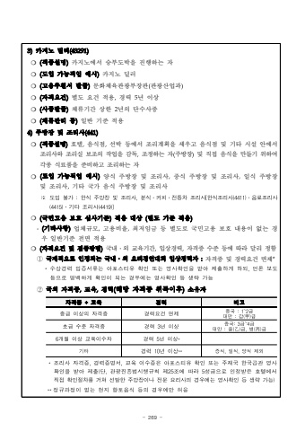 - 269 -3)%uce74%uc9c0%ub178 %ub51c%ub7ec(43291)%u274d (%uc9c1%uc885%uc124%uba85)%uce74%uc9c0%ub178%uc5d0%uc11c %uc2b9%ubd80%ub3c4%ubc15%uc744 %uc9c4%ud589%ud558%ub294 %uc790%u274d(%ub3c4%uc785 %uac00%ub2a5%uc9c1%uc5c5 %uc608%uc2dc)%uce74%uc9c0%ub178 %ub51c%ub7ec%u274d (%uace0%uc6a9%ucd94%ucc9c%uc11c %ubc1c%uae09)%ubb38%ud654%uccb4%uc721%uad00%uad11%ubd80%uc7a5%uad00(%uad00%uad11%uc0b0%uc5c5%uacfc)%u274d (%uc790%uaca9%uc694%uac74)%ubcc4%ub3c4 %uc694%uac74 %uc801%uc6a9,%uacbd%ub825 5%ub144 %uc774%uc0c1%u274d (%uc0ac%uc99d%ubc1c%uae09)%uccb4%ub958%uae30%uac04 %uc0c1%ud55c 2%ub144%uc758 %ub2e8%uc218%uc0ac%uc99d%u274d (%uccb4%ub958%uad00%ub9ac %ub4f1)%uc77c%ubc18 %uae30%uc900 %uc801%uc6a94)%uc8fc%ubc29%uc7a5 %ubc0f %uc870%ub9ac%uc0ac(441)%u274d (%uc9c1%uc885%uc124%uba85)%ud638%ud154,%uc74c%uc2dd%uc810,%uc120%ubc15 %ub4f1%uc5d0%uc11c %uc870%ub9ac%uacc4%ud68d%uc744 %uc138%uc6b0%uace0 %uc74c%uc2dd%uc810 %ubc0f %uae30%ud0c0 %uc2dc%uc124 %uc548%uc5d0%uc11c %uc870%ub9ac%uc0ac%uc640 %uc870%ub9ac%uc2e4 %ubcf4%uc870%uc758 %uc791%uc5c5%uc744 %uac10%ub3c5,%uc870%uc815%ud558%ub294 %uc790(%uc8fc%ubc29%uc7a5)%ubc0f %uc9c1%uc811 %uc74c%uc2dd%uc744 %ub9cc%ub4e4%uae30 %uc704%ud558%uc5ec%uac01%uc885 %uc2dd%ub8cc%ud488%uc744 %uc900%ube44%ud558%uace0 %uc870%ub9ac%ud558%ub294 %uc790%u274d(%ub3c4%uc785 %uac00%ub2a5%uc9c1%uc5c5 %uc608%uc2dc)%uc591%uc2dd %uc8fc%ubc29%uc7a5 %ubc0f %uc870%ub9ac%uc0ac,%uc911%uc2dd %uc8fc%ubc29%uc7a5 %ubc0f %uc870%ub9ac%uc0ac,%uc77c%uc2dd %uc8fc%ubc29%uc7a5 %ubc0f %uc870%ub9ac%uc0ac,%uae30%ud0c0 %uad6d%uac00 %uc74c%uc2dd %uc8fc%ubc29%uc7a5 %ubc0f %uc870%ub9ac%uc0ac%u203b%ub3c4%uc785%ubd88%uac00:%ud55c%uc2dd%uc8fc%ubc29%uc7a5%ubc0f%uc870%ub9ac%uc0ac,%ubd84%uc2dd%u2024%ucee4%ud53c%u2024%uc804%ud1b5%ucc28%uc870%ub9ac%uc0ac[%ud55c%uc2dd%uc870%ub9ac%uc0ac(4411)%u2024%uc74c%ub8cc%uc870%ub9ac%uc0ac(4415)%u2024%uae30%ud0c0%uc870%ub9ac%uc0ac(4419)]%u274d(%uad6d%ubbfc%uace0%uc6a9 %ubcf4%ud638 %uc2ec%uc0ac%uae30%uc900)%uc801%uc6a9 %ub300%uc0c1 (%ubcc4%ub3c4 %uae30%uc900 %uc801%uc6a9)-(%uae30%ud0c0%uc0ac%ud56d)%uc5c5%uccb4%uaddc%ubaa8,%uace0%uc6a9%ube44%uc728,%ucd5c%uc800%uc784%uae08 %ub4f1 %ubcc4%ub3c4%ub85c %uad6d%ubbfc%uace0%uc6a9 %ubcf4%ud638 %ub0b4%uc6a9%uc774 %uc5c6%ub294 %uacbd%uc6b0 %uc77c%ubc18%uae30%uc900 %uc804%uba74 %uc801%uc6a9%u274d (%uc790%uaca9%uc694%uac74 %ubc0f %uac80%uc99d%ubc29%ubc95)%uad6d%ub0b4%u2024%uc678 %uad50%uc721%uae30%uac04,%uc785%uc0c1%uacbd%ub825,%uc790%uaca9%uc99d %uc218%uc900 %ub4f1%uc5d0 %ub530%ub77c %ub2ec%ub9ac %uc815%ud568%u2460%uad6d%uc81c%uc801%uc73c%ub85c %uc778%uc815%ub418%ub294 %uad6d%ub0b4%u2024%uc678 %uc694%ub9ac%uacbd%uc5f0%ub300%ud68c %uc785%uc0c1%uacbd%ub825%uc790 :%uc790%uaca9%uc99d %ubc0f %uacbd%ub825%uc694%uac74 %uba74%uc81c**%uc218%uc0c1%uacbd%ub825%uc785%uc99d%uc11c%ub958%ub294%uc544%ud3ec%uc2a4%ud2f0%uc720%ud655%uc778%ub610%ub294%uc601%uc0ac%ud655%uc778%uc744%ubc1b%uc544%uc81c%ucd9c%ud558%uac8c%ud558%ub418,%uc5b8%ub860%ubcf4%ub3c4%ub4f1%uc73c%ub85c%uba85%ubc31%ud558%uac8c%ud655%uc778%uc774%ub418%ub294%uacbd%uc6b0%uc5d0%ub294%uc601%uc0ac%ud655%uc778%ub4f1%uc0dd%ub7b5%uac00%ub2a5%u2461%uad6d%uc678 %uc790%uaca9%uc99d,%uad50%uc721,%uacbd%ub825(%ud574%ub2f9 %uc790%uaca9%uc99d %ucde8%ub4dd%uc774%ud6c4)%uc18c%uc720%uc790%uc790%uaca9%uc99d+%uad50%uc721%uacbd%ub825%ube44%uace0%uc911%uae09%uc774%uc0c1%uc758%uc790%uaca9%uc99d%uacbd%ub825%uc694%uac74%uba74%uc81c%uc911%uad6d:1~2%uae09%ub300%ub9cc:%uac11(%u7532)%uae09%ucd08%uae09%uc218%uc900%uc790%uaca9%uc99d%uacbd%ub8253%ub144%uc774%uc0c1%uc911%uad6d:3%uae09~4%uae09%ub300%ub9cc:%uc744(%u4e59)%uae09,%ubcd1(%u4e19)%uae096%uac1c%uc6d4%uc774%uc0c1%uad50%uc721%uc774%uc218%uc790%uacbd%ub8255%ub144%uc774%uc0c1*%uae30%ud0c0%uacbd%ub82510%ub144%uc774%uc0c1**%uc911%uc2dd,%uc77c%uc2dd,%uc591%uc2dd%uc81c%uc678*%uc870%ub9ac%uc0ac%uc790%uaca9%uc99d,%uacbd%ub825%uc99d%uba85%uc11c,%uad50%uc721%uc774%uc218%uc99d%uc740%uc544%ud3ec%uc2a4%ud2f0%uc720%ud655%uc778%ub610%ub294%uc8fc%uc7ac%uad6d%ud55c%uad6d%uacf5%uad00%uc601%uc0ac%ud655%uc778%uc744%ubc1b%uc544%uc81c%ucd9c(%ub2e8,%uad00%uad11%uc9c4%ud765%ubc95%uc2dc%ud589%uaddc%uce59%uc81c25%uc870%uc5d0%ub530%ub77c5%uc131%uae09%uc73c%ub85c%uc778%uc815%ubc1b%uc740%ud638%ud154%uc5d0%uc11c%uc9c1%uc811%ud655%uc778%uc808%ucc28%ub97c%uac70%uccd0%uc120%ubc1c%ud55c%uc8fc%ubc29%uc7a5%uc774%ub098%uc804%ubb38%uc694%ub9ac%uc0ac%uc758%uacbd%uc6b0%uc5d0%ub294%uc601%uc0ac%ud655%uc778%ub4f1%uc0dd%ub7b5%uac00%ub2a5)**%uc815%uaddc%uacfc%uc815%uc774%uc5c6%ub294%ud604%uc9c0%ud5a5%ud1a0%uc74c%uc2dd%ub4f1%uc758%uacbd%uc6b0%uc5d0%ub9cc%ud5c8%uc6a9