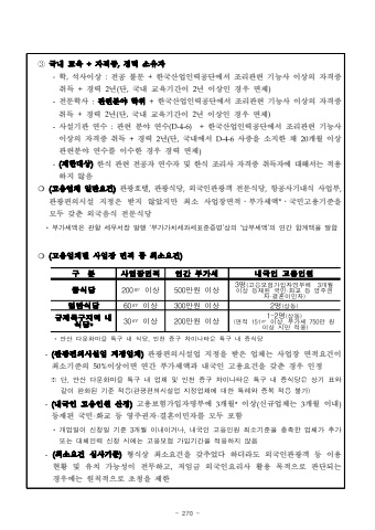 - 270 -%u2462%uad6d%ub0b4 %uad50%uc721 +%uc790%uaca9%uc99d,%uacbd%ub825 %uc18c%uc720%uc790-%ud559,%uc11d%uc0ac%uc774%uc0c1 :%uc804%uacf5 %ubd88%ubb38 +%ud55c%uad6d%uc0b0%uc5c5%uc778%ub825%uacf5%ub2e8%uc5d0%uc11c %uc870%ub9ac%uad00%ub828 %uae30%ub2a5%uc0ac %uc774%uc0c1%uc758 %uc790%uaca9%uc99d%ucde8%ub4dd +%uacbd%ub825 2%ub144(%ub2e8,%uad6d%ub0b4 %uad50%uc721%uae30%uac04%uc774 2%ub144 %uc774%uc0c1%uc778 %uacbd%uc6b0 %uba74%uc81c)-%uc804%ubb38%ud559%uc0ac :%uad00%ub828%ubd84%uc57c %ud559%uc704+%ud55c%uad6d%uc0b0%uc5c5%uc778%ub825%uacf5%ub2e8%uc5d0%uc11c %uc870%ub9ac%uad00%ub828 %uae30%ub2a5%uc0ac %uc774%uc0c1%uc758 %uc790%uaca9%uc99d%ucde8%ub4dd +%uacbd%ub825 2%ub144(%ub2e8,%uad6d%ub0b4 %uad50%uc721%uae30%uac04%uc774 2%ub144 %uc774%uc0c1%uc778 %uacbd%uc6b0 %uba74%uc81c)-%uc0ac%uc124%uae30%uad00 %uc5f0%uc218 :%uad00%ub828 %ubd84%uc57c %uc5f0%uc218(D-4-6)+%ud55c%uad6d%uc0b0%uc5c5%uc778%ub825%uacf5%ub2e8%uc5d0%uc11c %uc870%ub9ac%uad00%ub828 %uae30%ub2a5%uc0ac%uc774%uc0c1%uc758 %uc790%uaca9%uc99d %ucde8%ub4dd +%uacbd%ub825 2%ub144(%ub2e8,%uad6d%ub0b4%uc5d0%uc11c D-4-6%uc0ac%uc99d%uc744 %uc18c%uc9c0%ud55c %ucc44 20%uac1c%uc6d4 %uc774%uc0c1%uad00%ub828%ubd84%uc57c %uc5f0%uc218%ub97c %uc774%uc218%ud55c %uacbd%uc6b0 %uacbd%ub825 %uba74%uc81c)-(%uc81c%ud55c%ub300%uc0c1)%ud55c%uc2dd %uad00%ub828 %uc804%uacf5%uc790 %uc5f0%uc218%uc790 %ubc0f %ud55c%uc2dd %uc870%ub9ac%uc0ac %uc790%uaca9%uc99d %ucde8%ub4dd%uc790%uc5d0 %ub300%ud574%uc11c%ub294 %uc801%uc6a9%ud558%uc9c0 %uc54a%uc74c %u274d (%uace0%uc6a9%uc5c5%uccb4 %uc77c%ubc18%uc694%uac74)%uad00%uad11%ud638%ud154,%uad00%uad11%uc2dd%ub2f9,%uc678%uad6d%uc778%uad00%uad11%uac1d %uc804%ubb38%uc2dd%ub2f9,%ud56d%uacf5%uc0ac%uae30%ub0b4%uc2dd %uc0ac%uc5c5%ubd80,%uad00%uad11%ud3b8%uc758%uc2dc%uc124 %uc9c0%uc815%uc740 %ubc1b%uc9c0 %uc54a%uc558%uc9c0%ub9cc %ucd5c%uc18c %uc0ac%uc5c5%uc7a5%uba74%uc801%u2024%ubd80%uac00%uc138%uc561*%u2024%uad6d%ubbfc%uace0%uc6a9%uae30%uc900%uc744 %ubaa8%ub450%uac16%ucd98 %uc678%uad6d%uc74c%uc2dd %uc804%ubb38%uc2dd%ub2f9*%ubd80%uac00%uc138%uc561%uc740%uad00%ud560%uc138%ubb34%uc11c%uc7a5%ubc1c%ud589%u2018%ubd80%uac00%uac00%uce58%uc138%uacfc%uc138%ud45c%uc900%uc99d%uba85%u2019%uc0c1%uc758%u2018%ub0a9%ubd80%uc138%uc561%u2019%uc758%uc5f0%uac04%ud569%uacc4%uc561%uc744%ub9d0%ud568%u274d (%uace0%uc6a9%uc5c5%uccb4%ubcc4 %uc0ac%uc5c5%uc7a5 %uba74%uc801 %ub4f1 %ucd5c%uc18c%uc694%uac74)%uc911%uc2dd%ub2f9200%u33a1%uc774%uc0c1500%ub9cc%uc6d0%uc774%uc0c1%uace0%uc6a9%ubcf4%ud5d8%uac00%uc785%uc790%uba85%ubd80%uc5d0%uc774%uc0c1%ub4f1%uc7ac%ub41c%uad6d%ubbfc%u00b7%ud654%uad50%ub4f1%uc601%uc8fc%uad8c%uc790%u00b7%uacb0%ud63c%uc774%ubbfc%uc790)%uc77c%ubc18%uc2dd%ub2f960%u33a1%uc774%uc0c1300%ub9cc%uc6d0%uc774%uc0c12%uba85(%uc0c1%ub3d9)%uaddc%uc81c%ud2b9%uad6c%uc9c0%uc5ed%ub0b4%uc2dd%ub2f9*30%u33a1%uc774%uc0c1200%ub9cc%uc6d0%uc774%uc0c11-2%uba85(%uc0c1%ub3d9)(%uba74%uc801151%u33a1%uc774%uc0c1,%ubd80%uac00%uc138750%ub9cc%uc6d0%uc774%uc0c1%uc2dc%ub9cc%uc801%uc6a9)*%uc548%uc0b0%ub2e4%ubb38%ud654%ub9c8%uc744%ud2b9%uad6c%ub0b4%uc2dd%ub2f9,%uc778%ucc9c%uc911%uad6c%ucc28%uc774%ub098%ud0c0%uc6b4%ud2b9%uad6c%ub0b4%uc911%uc2dd%ub2f9-(%uad00%uad11%ud3b8%uc758%uc2dc%uc124%uc5c5 %uc9c0%uc815%uc5c5%uccb4)%uad00%uad11%ud3b8%uc758%uc2dc%uc124%uc5c5 %uc9c0%uc815%uc744 %ubc1b%uc740 %uc5c5%uccb4%ub294 %uc0ac%uc5c5%uc7a5 %uba74%uc801%uc694%uac74%uc774 %ucd5c%uc18c%uae30%uc900%uc758 50%%uc774%uc0c1%uc774%uba74 %uc5f0%uac04 %ubd80%uac00%uc138%uc561%uacfc %ub0b4%uad6d%uc778 %uace0%uc6a9%uc694%uac74%uc744 %uac16%ucd98 %uacbd%uc6b0 %uc778%uc815%u203b%ub2e8,%uc548%uc0b0%ub2e4%ubb38%ud654%ub9c8%uc744%ud2b9%uad6c%ub0b4%uc5c5%uccb4%ubc0f%uc778%ucc9c%uc911%uad6c%ucc28%uc774%ub098%ud0c0%uc6b4%ud2b9%uad6c%ub0b4%uc911%uc2dd%ub2f9%uc740%uc0c1%uae30%ud45c%uc640%uac19%uc774%uc644%ud654%ub41c%uae30%uc900%uc801%uc6a9(%uad00%uad11%ud3b8%uc758%uc2dc%uc124%uc5c5%uc9c0%uc815%uc5c5%uccb4%uc5d0%ub300%ud55c%ud2b9%ub840%uc640%uc911%ubcf5%uc801%uc6a9%ubd88%uac00)-(%ub0b4%uad6d%uc778 %uace0%uc6a9%uc778%uc6d0 %uc0b0%uc815)%uace0%uc6a9%ubcf4%ud5d8%uac00%uc785%uc790%uba85%ubd80%uc5d0 3%uac1c%uc6d4*%uc774%uc0c1(%uc2e0%uaddc%uc5c5%uccb4%ub294 3%uac1c%uc6d4 %uc774%ub0b4)%ub4f1%uc7ac%ub41c %uad6d%ubbfc%u00b7%ud654%uad50 %ub4f1 %uc601%uc8fc%uad8c%uc790%u00b7%uacb0%ud63c%uc774%ubbfc%uc790%ub97c %ubaa8%ub450 %ud3ec%ud568*%uac1c%uc5c5%uc77c%uc774%uc2e0%uccad%uc77c%uae30%uc9003%uac1c%uc6d4%uc774%ub0b4%uc774%uac70%ub098,%ub0b4%uad6d%uc778%uace0%uc6a9%uc778%uc6d0%ucd5c%uc18c%uae30%uc900%uc744%ucda9%uc871%ud55c%uc5c5%uccb4%uac00%ucd94%uac00%ub610%ub294%ub300%uccb4%uc778%ub825%uc2e0%uccad%uc2dc%uc5d0%ub294%uace0%uc6a9%ubcf4%ud5d8%uac00%uc785%uae30%uac04%uc744%uc801%uc6a9%ud558%uc9c0%uc54a%uc74c-(%ucd5c%uc18c%uc694%uac74 %uc2ec%uc0ac%uae30%uc900)%ud615%uc2dd%uc0c1 %ucd5c%uc18c%uc694%uac74%uc744 %uac16%ucd94%uc5c8%ub2e4 %ud558%ub354%ub77c%ub3c4 %uc678%uad6d%uc778%uad00%uad11%uac1d %ub4f1 %uc774%uc6a9 %ud604%ud669%ubc0f %uc720%uce58 %uac00%ub2a5%uc131%uc774 %uc804%ubb34%ud558%uace0,%uc800%uc784%uae08 %uc678%uad6d%uc778%uc694%ub9ac%uc0ac %ud65c%uc6a9 %ubaa9%uc801%uc73c%ub85c %ud310%ub2e8%ub418%ub294 %uacbd%uc6b0%uc5d0%ub294 %uc6d0%uce59%uc801%uc73c%ub85c %ucd08%uccad%uc744 %uc81c%ud55c
