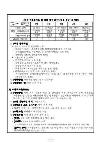 - 272 -%ud5c8%uc6a9%uc778%uc6d0%uad6c%ubd841%uba852%uba853%uba854%uba855%uba85%uc0ac%uc5c5%uc7a5 %uba74%uc801 30%u223c50%u33a151%u223c100%u33a1101%u223c150%u33a1151%u223c200%u33a1200%u33a1%ucd08%uacfc%uc5f0%uac04 %ubd80%uac00%uc138%ub0a9%ubd80%uc561200%ub9cc%uc6d0%uc774%uc0c1250%ub9cc%uc6d0%uc774%uc0c1500%ub9cc%uc6d0%uc774%uc0c1750%ub9cc%uc6d0%uc774%uc0c11,000%ub9cc%uc6d0%uc774%uc0c1%ub9e4%ucd9c%uacfc%uc138%ud45c%uc900 %ud569%uacc44%ucc9c%ub9cc%uc6d0 %uc774%uc0c15%ucc9c%ub9cc%uc6d0 %uc774%uc0c11%uc5b5%uc6d0%uc774%uc0c11%uc5b55%ucc9c%ub9cc%uc6d0 %uc774%uc0c12%uc5b5%uc6d0%uc774%uc0c1%ub0b4%uad6d%uc778 %uace0%uc6a9%uc778%uc6d0---1%uba852%uba85<%uc548%uc0b0 %ub2e4%ubb38%ud654%ub9c8%uc744 %ubc0f %uc778%ucc9c %uc911%uad6c %ucc28%uc774%ub098%ud0c0%uc6b4 %ud2b9%uad6c %ub0b4 %uae30%uc900>%u274d(%ucd94%uac00 %ucca8%ubd80%uc11c%ub958)%u25b8%uc694%ub9ac%uc0ac %uc790%uaca9%uc694%uac74 %uc785%uc99d%uc11c%ub958 :%ud0dd1-%uad6d%ub0b4%uc678 %uc778%uc815%ub418%ub294 %uc694%ub9ac%uacbd%uc5f0%ub300%ud68c %uc785%uc0c1%uc11c%ub958(%uc6d0%ubcf8%uc81c%uc2dc,%uc0ac%ubcf8%uc81c%ucd9c)-%uc790%uaca9%uc99d(%uc6d0%ubcf8%uc81c%uc2dc,%uc0ac%ubcf8%uc81c%ucd9c)%ubc0f %uacbd%ub825%uc99d%uba85%uc11c(3%ub144 %ub610%ub294 5%ub144)-%uacbd%ub825%uc99d%uba85%uc11c(10%ub144,%ud5a5%ud1a0%uc74c%uc2dd%uc5d0 %ud55c%ud568)%u25b8%uace0%uc6a9%uc5c5%uccb4 %uc694%uac74 %uc11c%ub958 :-%uace0%uc6a9%ubcf4%ud5d8 %uac00%uc785%uc790 %ubaa9%ub85d(%uacf5%ud1b5)-%uc0ac%uc5c5%uc7a5%uc6a9 %uace0%uc6a9%ubcf4%ud5d8%ud53c%ubcf4%ud5d8%uc790%uaca9 %ucde8%ub4dd %ub0b4%uc5ed(%uacf5%ud1b5)-%uc0ac%uc5c5%uc7a5 %uba74%uc801 %uc785%uc99d%uc11c%ub958(%uacf5%ud1b5)-%ubd80%uac00%uac00%uce58%uc138%uacfc%uc138%ud45c%uc900%uc99d%uba85(%uc138%ubb34%uc11c%uc7a5 %ubc1c%ud589,%uacf5%ud1b5)-%uad00%uad11%ud3b8%uc758%uc2dc%uc124%uc5c5 %uc9c0%uc815 %uc11c%ub958 (%ud574%ub2f9%uc790%uc5d0 %ud55c%ud568)-%uc678%uad6d%uc778%uad00%uad11%uac1d %uba74%uc138%ud310%ub9e4%uc7a5(%uc138%ubb34%uc11c%uc7a5 %uc9c0%uc815)%ub610%ub294 %ubcf4%uc138%ud310%ub9e4%uc7a5%uc138%uad00%uc7a5 %ud2b9%ud5c8%uc11c%ub958 (%ud574%ub2f9%uc5c5%uccb4%uc5d0 %ud55c%ud568)%u274d (%uc0ac%uc99d%ubc1c%uae09)%uccb4%ub958%uae30%uac04 %uc0c1%ud55c 2%ub144%uc758 %ub2e8%uc218%uc0ac%uc99d%u274d (%uccb4%ub958%uad00%ub9ac %ub4f1)%uc77c%ubc18 %uae30%uc900 %uc801%uc6a95)%uc694%uc591%ubcf4%ud638%uc0ac(42111)%u274d(%uc9c1%uc885%uc124%uba85)%uc2dd%uc0ac,%ubaa9%uc695,%ub300%uc18c%ubcc0 %ucc98%ub9ac,%uc637 %uac08%uc544%uc785%uae30,%uc774%ub3d9,%uccb4%uc704%uad50%ud658%uacfc %uc0b0%ucc45,%ubcd1%uc6d0%ub3d9%ud589,%ubcf4%ud589%ud6c8%ub828 %ub4f1 %uac04%ub2e8%ud55c %uc7ac%ud65c%ud6c8%ub828%uacfc %uac19%uc740 %uc2e0%uccb4%ud65c%ub3d9%uacfc %uc77c%uc0c1%uc0dd%ud65c%uc744 %uc9c0%uc6d0%ud558%uba70,%ub300%ud654 %uc0c1%ub300%uac00 %ub418%uc5b4%uc8fc%ub294 %ub4f1 %uae30%ud0c0 %uc2ec%ub9ac%uc801 %uc9c0%uc6d0%uc744 %uc704%ud55c %uc11c%ube44%uc2a4%ub97c %uc81c%uacf5%ud558%ub294 %uc790%u274d(%ub3c4%uc785 %uac00%ub2a5%uc9c1%uc5c5 %uc608%uc2dc)%uc694%uc591%ubcf4%ud638%uc0ac%u274d(%uad6d%ubbfc%uace0%uc6a9 %ubcf4%ud638 %uc2ec%uc0ac%uae30%uc900)%uc77c%ubc18 %uae30%uc900 %uc801%uc6a9 -%uc5c5%uccb4%ub2f9 %uace0%uc6a9%uc778%uc6d0 :%uad6d%ubbfc%uace0%uc6a9%uc778%uc6d0 %ub300%ube44 20%%ud55c%ub3c4 %ub0b4%uc5d0%uc11c %ud5c8%uc6a9%u274d(%uc18c%ub4dd%uc694%uac74)%ub2f9%ud574%uc5f0%ub3c4 %ucd5c%uc800%uc784%uae08 %uc774%uc0c1%u274d(%uc790%uaca9%uc694%uac74)%uc544%ub798 %uc694%uac74 %ubaa8%ub450 %ucda9%uc871 %ud544%uc694-(%ud559%ub825)%uad6d%ub0b4 %ub300%ud559 %uc804%ubb38%ud559%uc0ac %uc774%uc0c1 %ud559%uc704 %uc18c%uc9c0-(%uc790%uaca9%uc99d)%uc694%uc591%ubcf4%ud638%uc0ac %uc790%uaca9%uc99d %uc18c%uc9c0%u203b%ud55c%uad6d%ubcf4%uac74%uc758%ub8cc%uc778%uad6d%uac00%uc2dc%ud5d8%uc6d0%ud648%ud398%uc774%uc9c0(www.kuksiwon.or.kr)%ub97c%ud1b5%ud574%uc9c4%uc704%uc5ec%ubd80%ud655%uc778%uac00%ub2a5-(%ud55c%uad6d%uc5b4 %ub2a5%ub825)%uc0ac%ud68c%ud1b5%ud569%ud504%ub85c%uadf8%ub7a8(KIIP)3%uae09 %uc774%uc0c1 %uc774%uc218 %ub610%ub294 %uc0ac%uc804%ud3c9%uac00 61%uc810 %uc774%uc0c1 %ub610%ub294 %ud55c%uad6d%uc5b4%ub2a5%ub825%uc2dc%ud5d8(TOPIK)3%uae09 %uc774%uc0c1